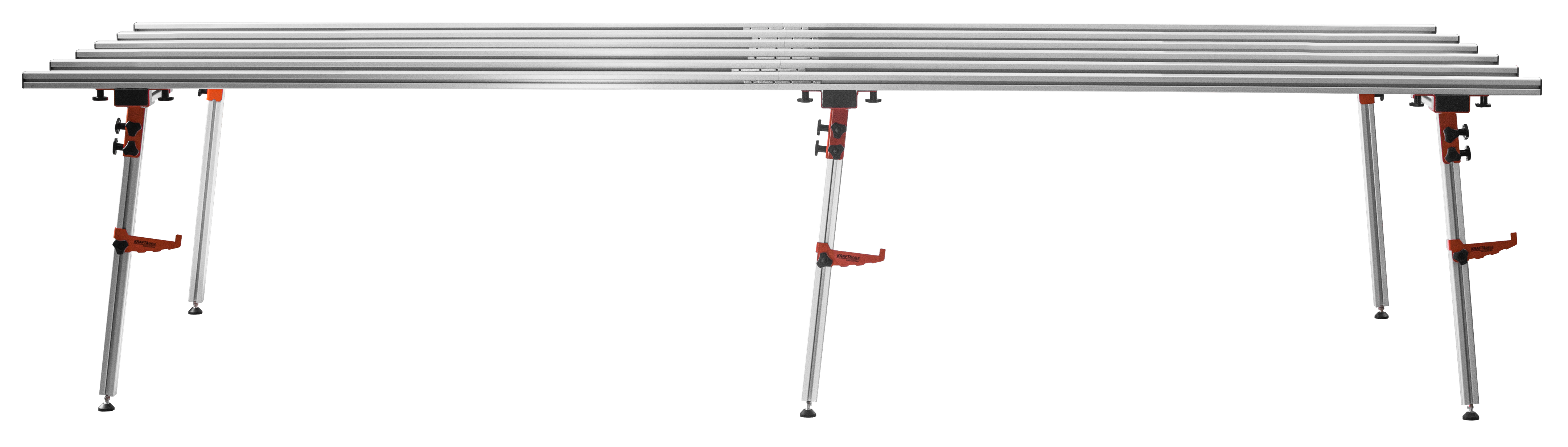 Układ sześciu nóg rozkłada obciążenie równomiernie na całej długości blatu 360 cm. Przy pracy z ciężkimi płytami granitowymi lub gresowymi zapobiega to ugięciu konstrukcji i niestabilności podczas cięcia.