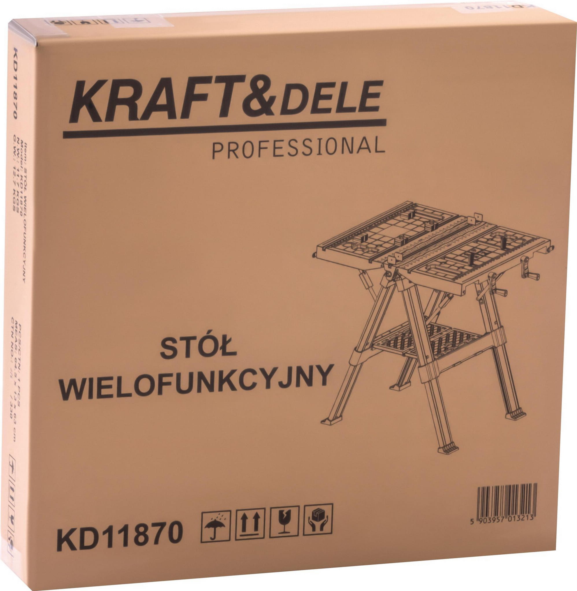 W skład zestawu wchodzi: składany stół roboczy KD11870, instrukcja obsługi w języku polskim oraz oryginalne opakowanie producenta.