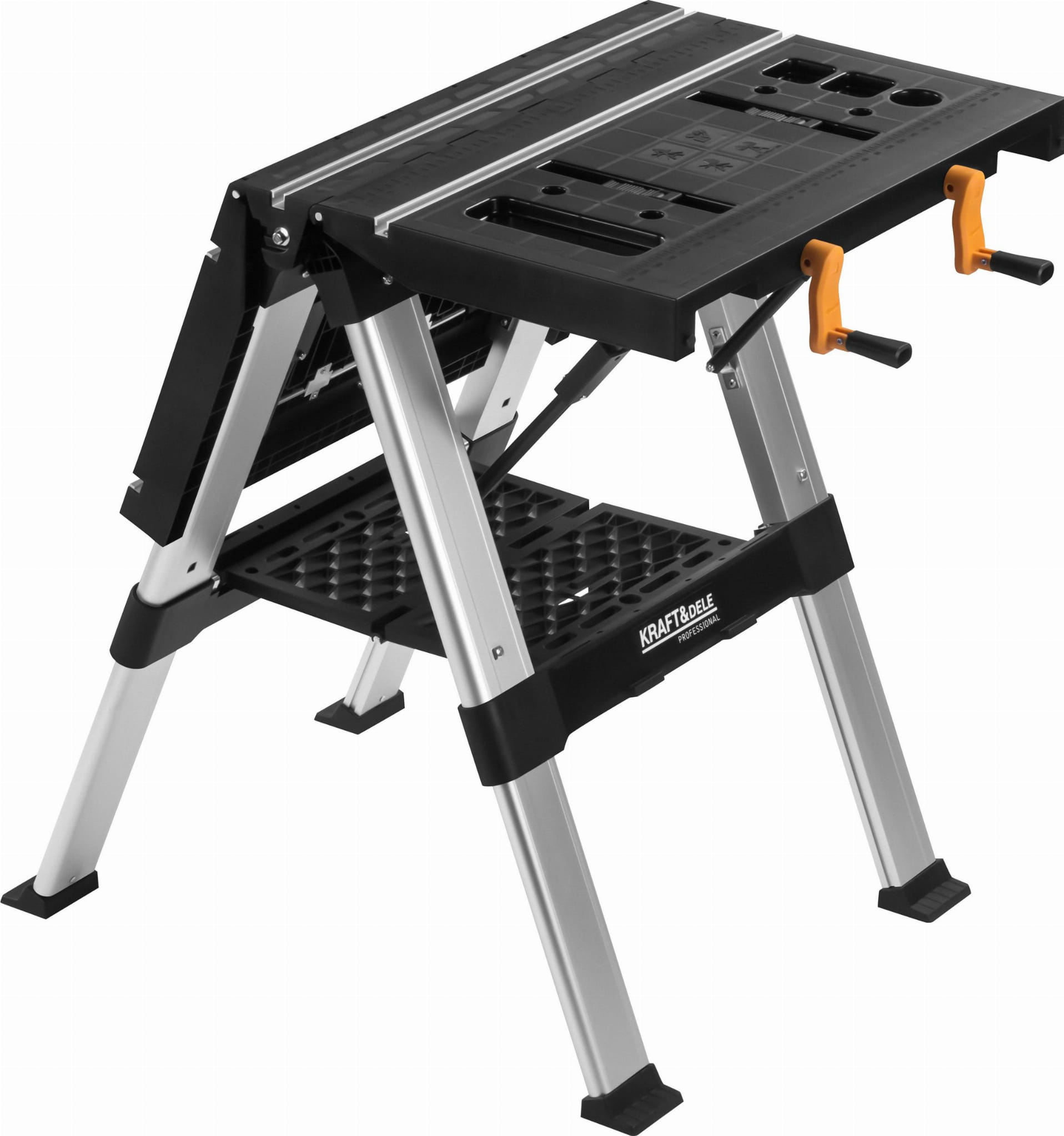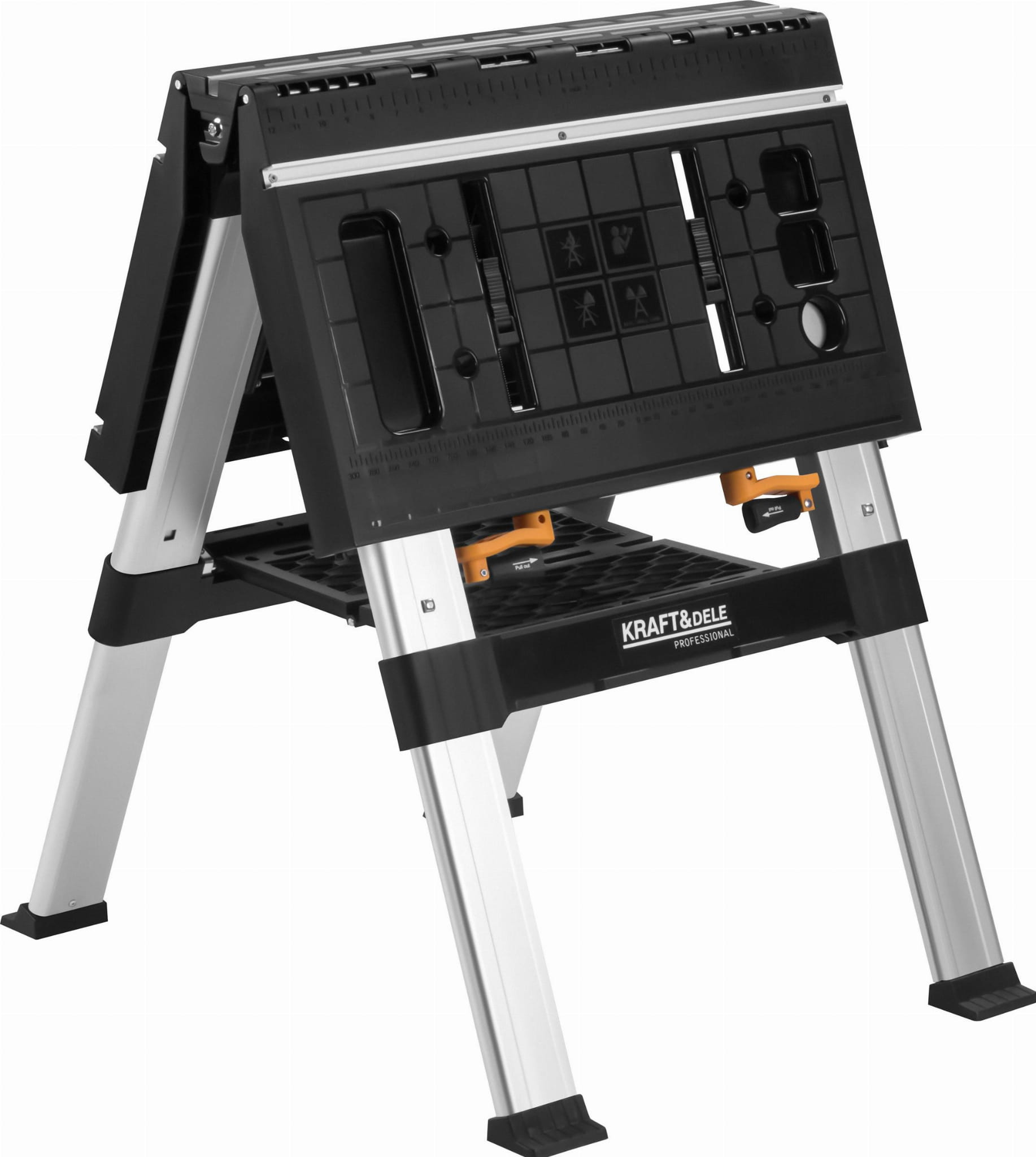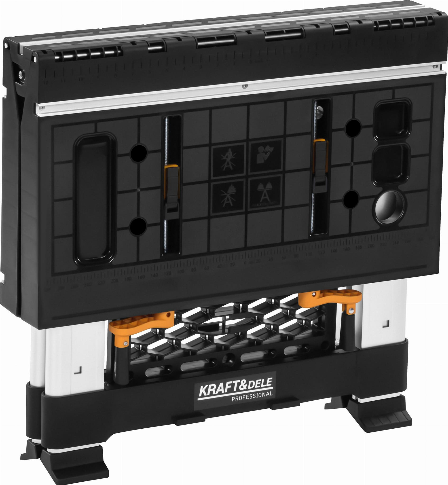 KD11870 to składany stół roboczy marki KRAFT&DELE przeznaczony do prac warsztatowych i obróbki drewna. Konstrukcja stalowo-tworzywowa umożliwia stabilną pracę zarówno w warsztacie stacjonarnym, jak i w terenie. Stół pełni funkcję konika piłowego i może być łączony z innymi egzemplarzami w celu uzyskania większej powierzchni roboczej.