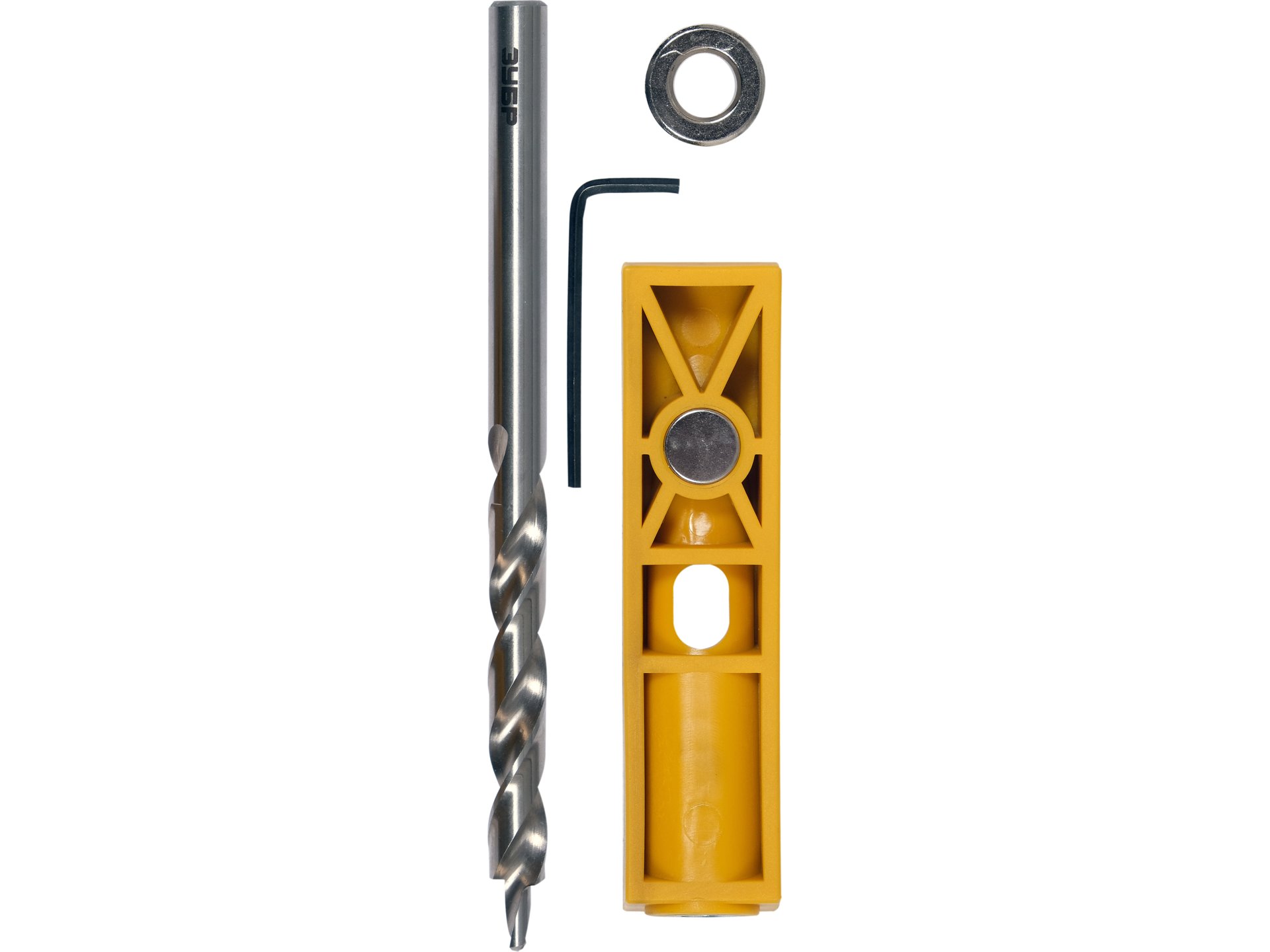 | Zawartość zestawu | prowadnica z tulejowanym ukośnym otworem na wiertło, wiertło stoczone, ogranicznik głębokości wiercenia, klucz imbusowy do blokowania ogranicznika |
