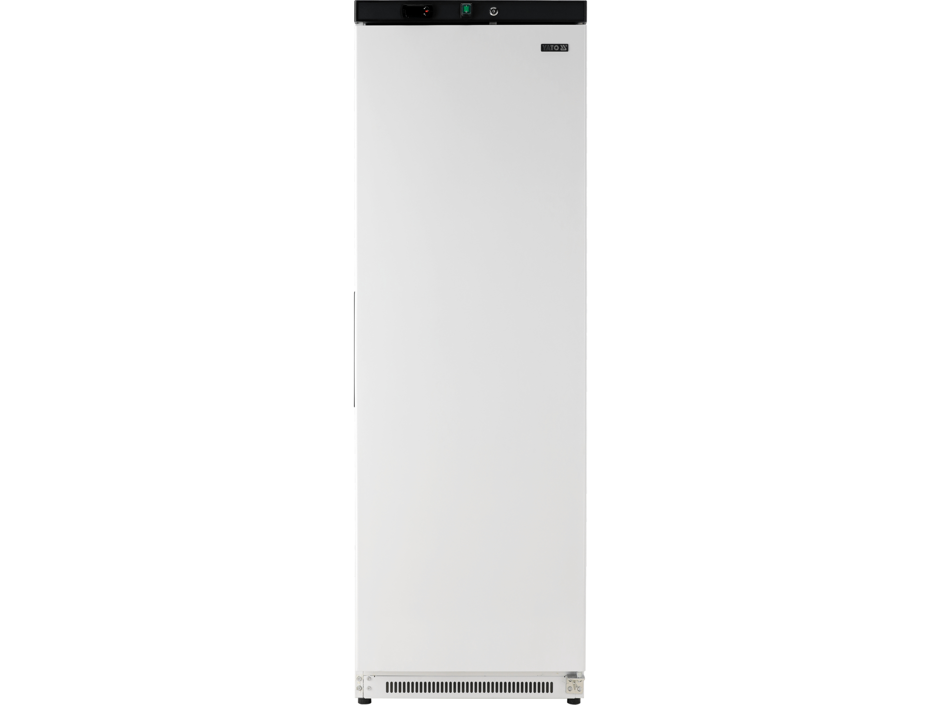 Szafa chłodnicza o pojemności 350 litrów w białej obudowie. Urządzenie przeznaczone do profesjonalnego przechowywania produktów spożywczych w kontrolowanej temperaturze, stosowane w gastronomii, sklepach spożywczych oraz punktach handlowych.