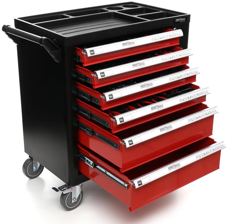 Szafka warsztatowa KRAFT&DELE KD362 ma logiczny podział narzędzi w szufladach, a piąta i szósta szuflada są puste i gotowe na większe elementy wyposażenia.