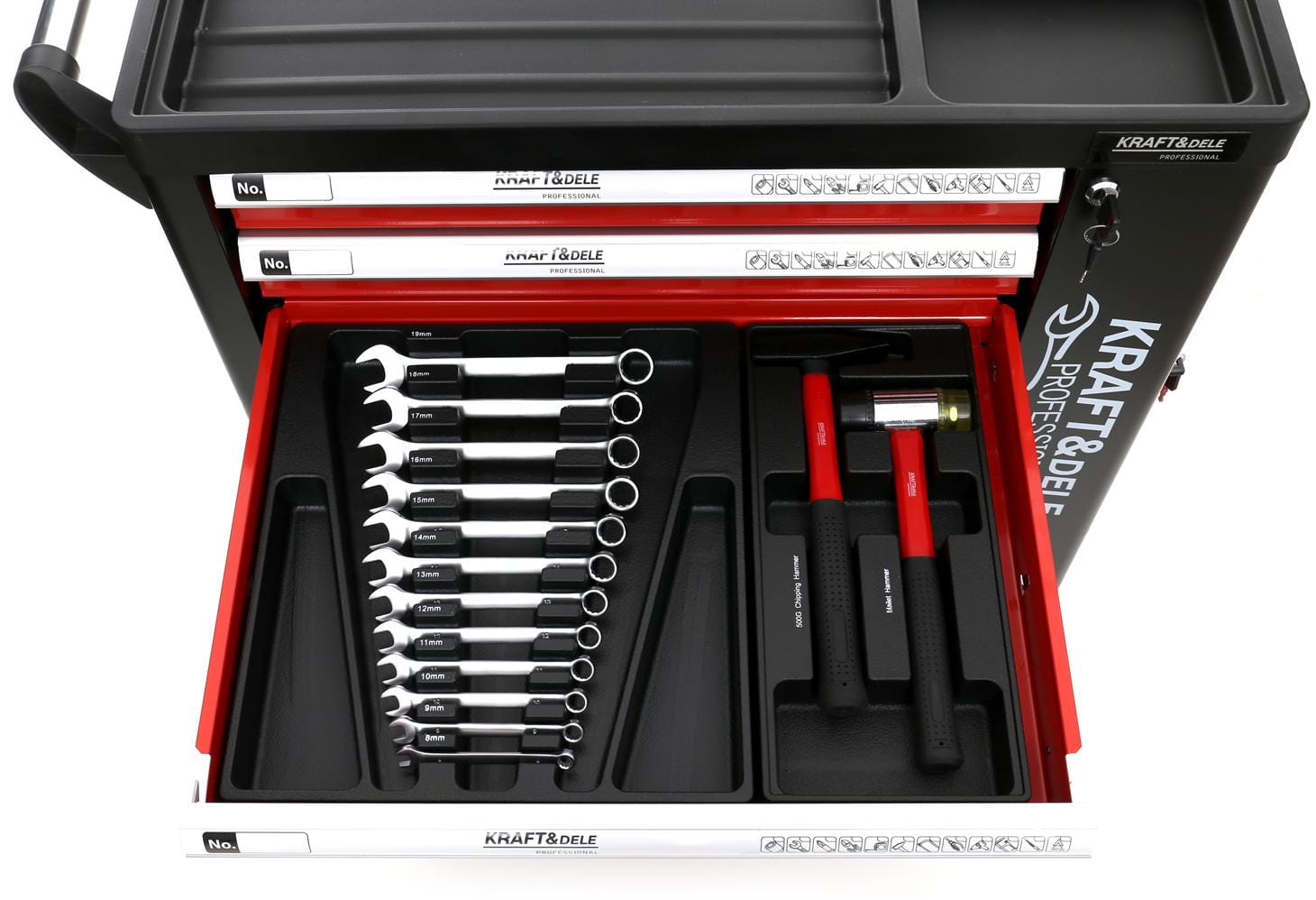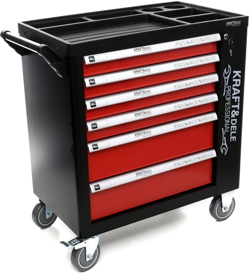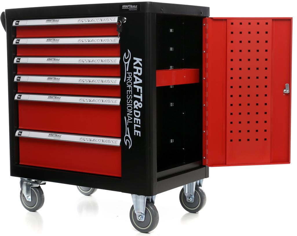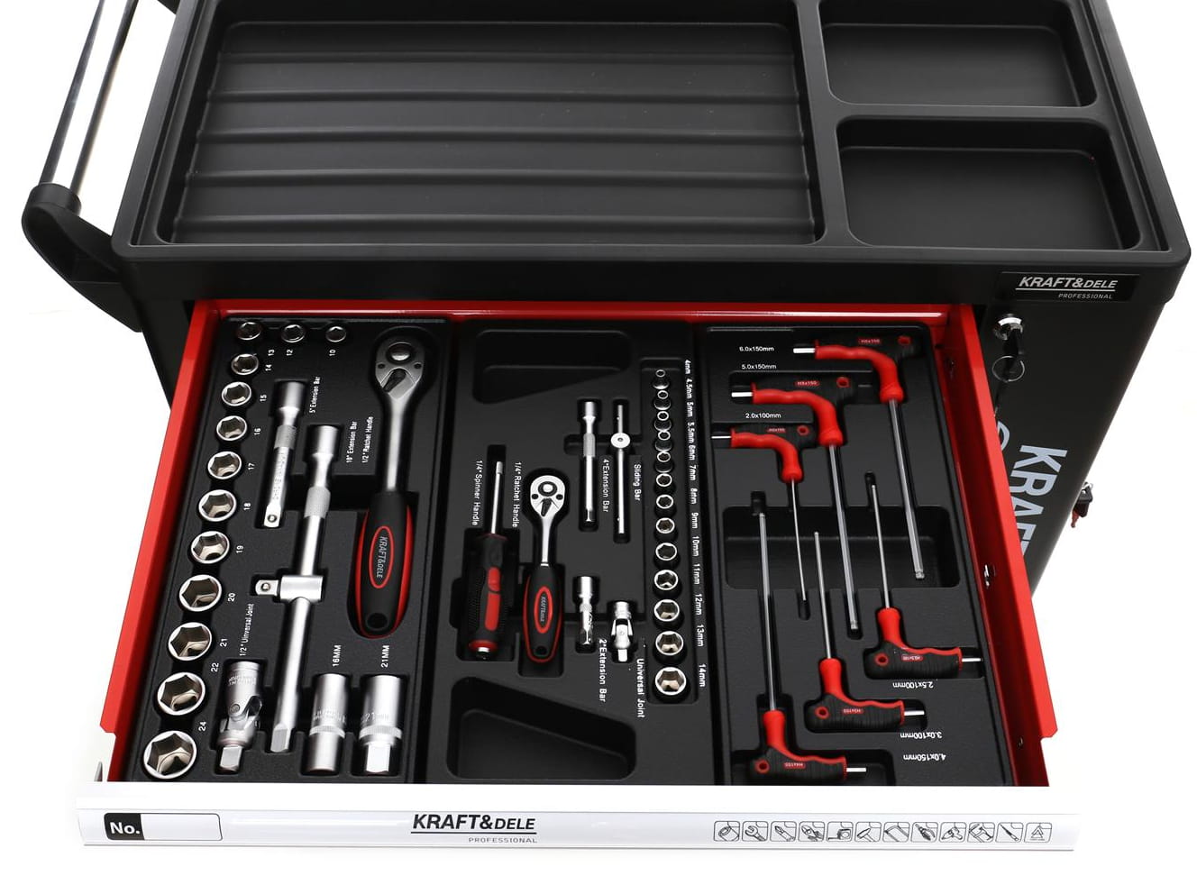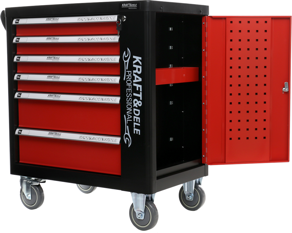 KD362 to mobilna szafa warsztatowa marki KRAFT&DELE wyposażona w komplet 263 narzędzi ze stali chromowo-wanadowej (CrV). Sześć szuflad na prowadnicach łożyskowanych, centralny zamek na kluczyk oraz kółka skrętne pozwalają zorganizować stanowisko pracy w warsztacie samochodowym lub garażu i swobodnie przemieszczać szafę w obrębie pomieszczenia.