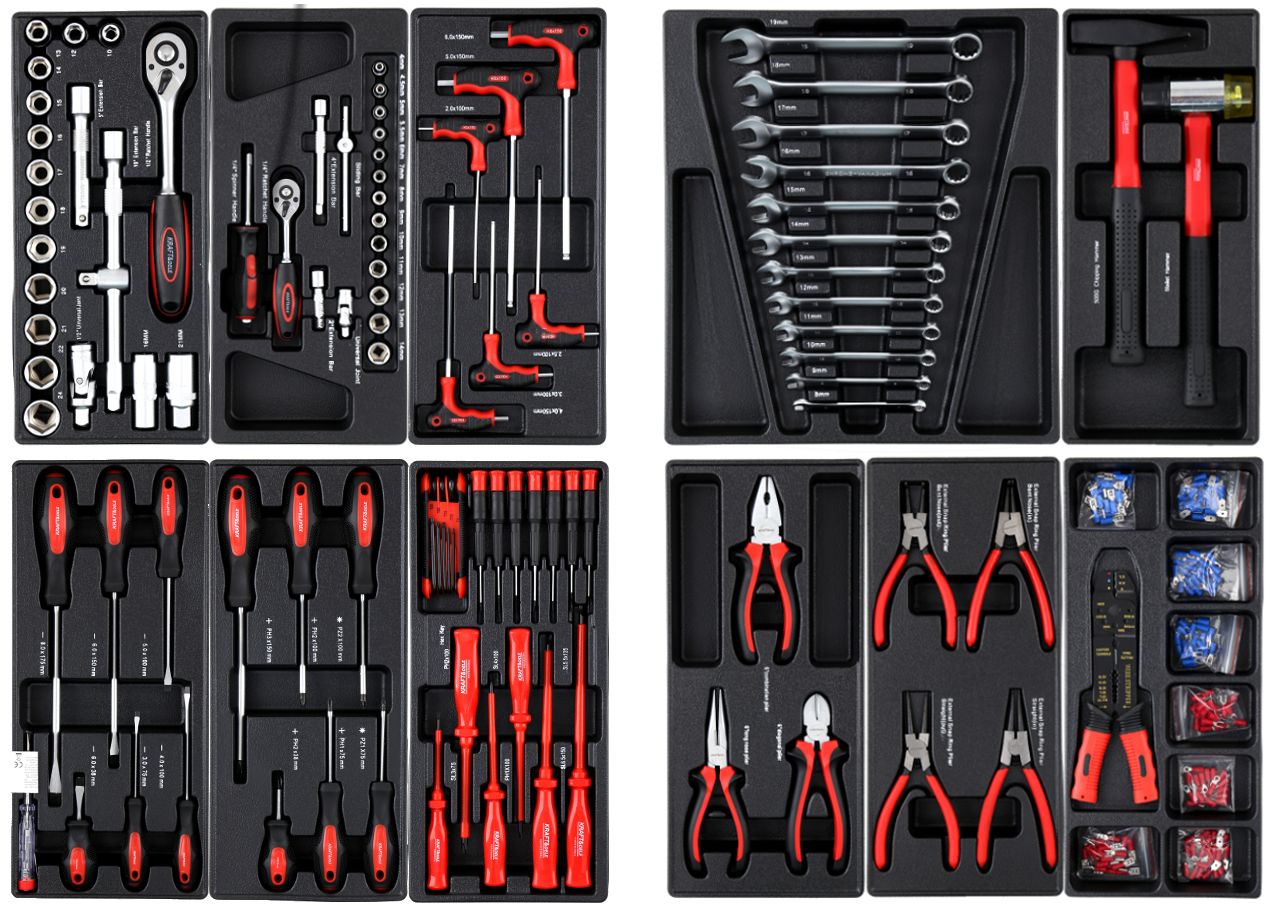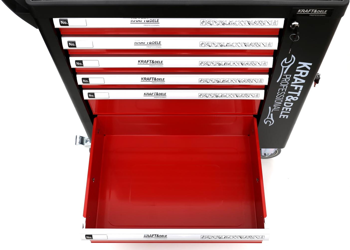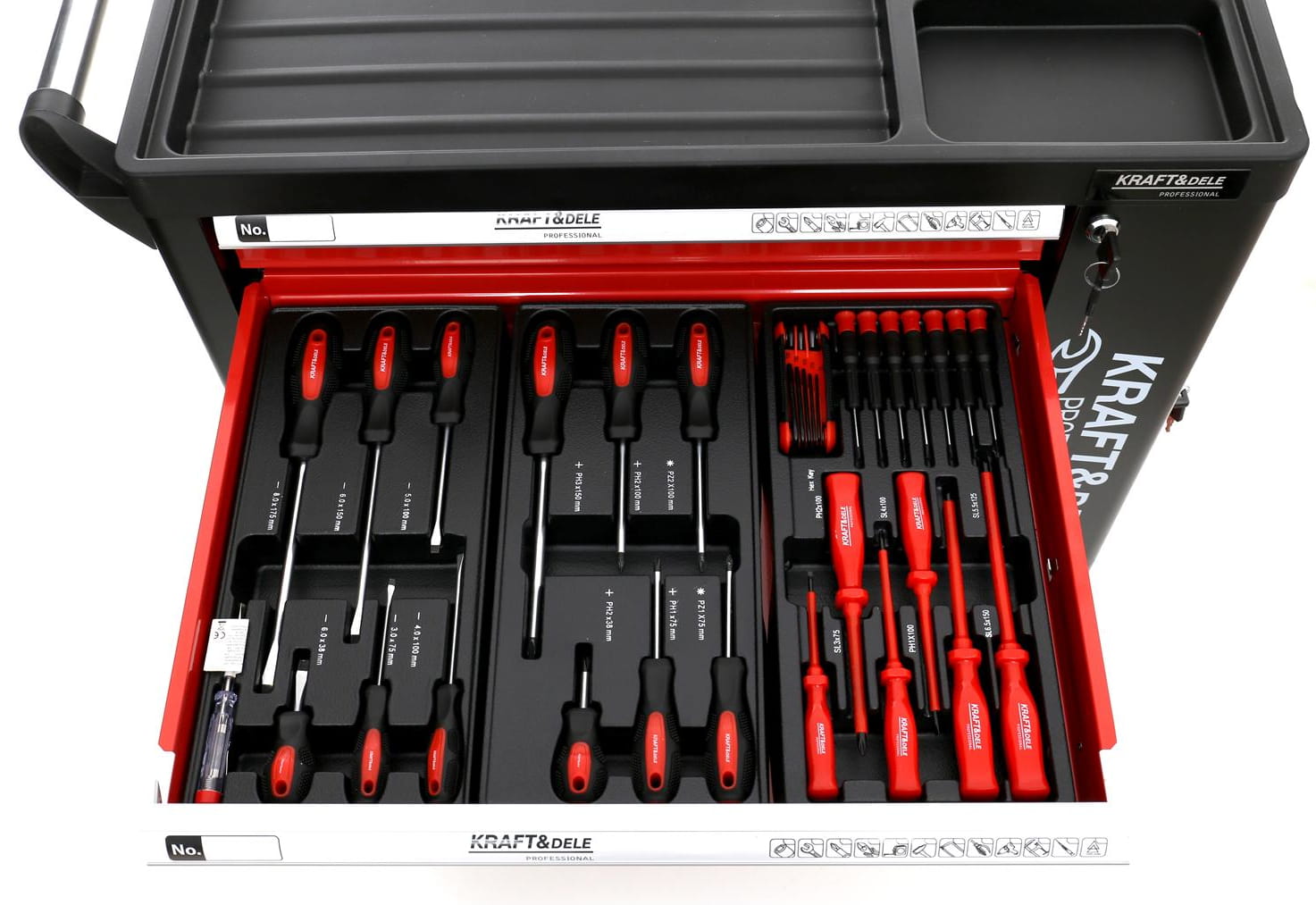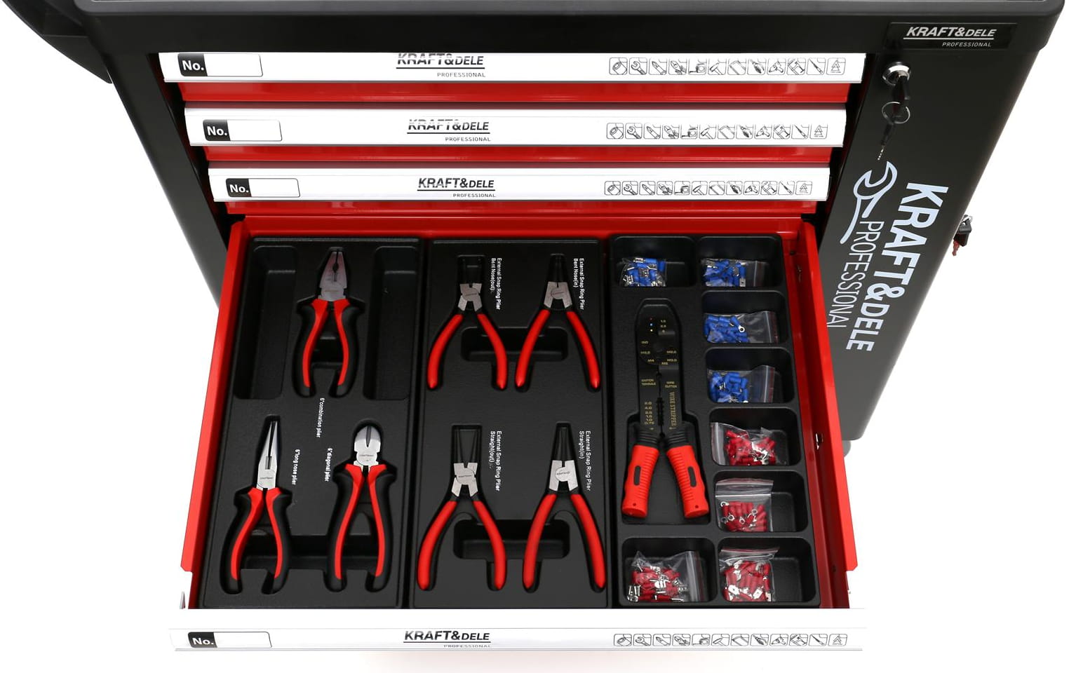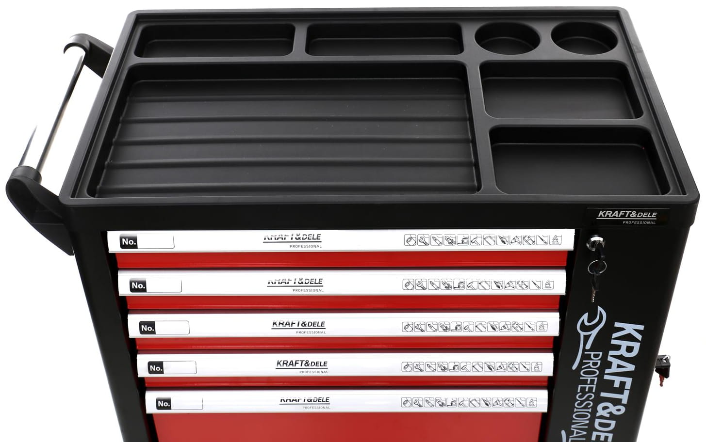 KD362 to mobilna szafa warsztatowa marki KRAFT&DELE wyposażona w komplet 263 narzędzi ze stali chromowo-wanadowej (CrV). Sześć szuflad na prowadnicach łożyskowanych, centralny zamek na kluczyk oraz kółka skrętne pozwalają zorganizować stanowisko pracy w warsztacie samochodowym lub garażu i swobodnie przemieszczać szafę w obrębie pomieszczenia.