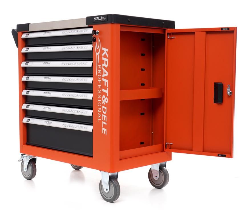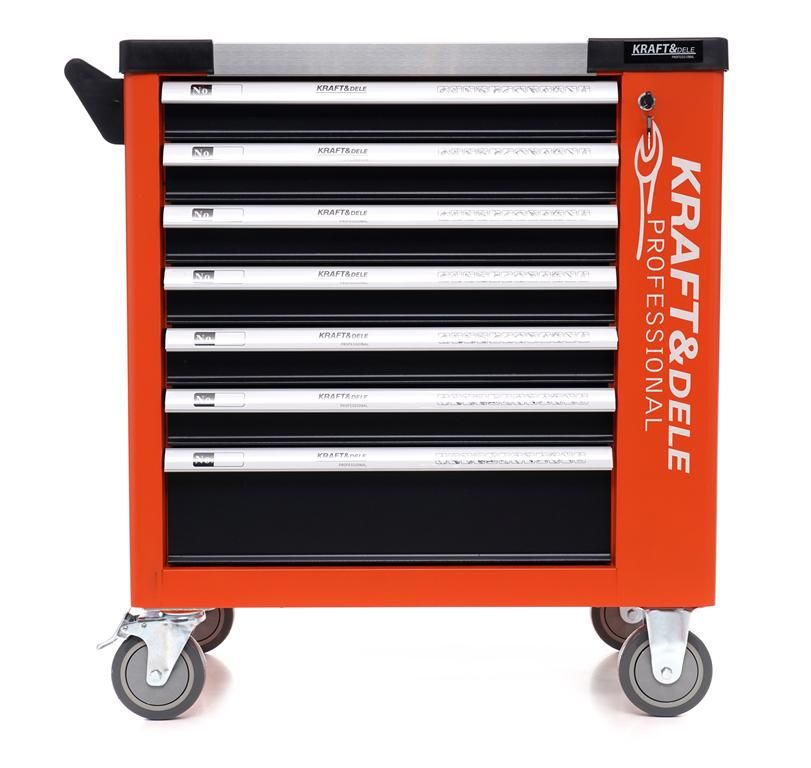SZAFKA NARZĘDZIOWA 258 EL. KD1067 to kompletna, mobilna szafka/wózek narzędziowy Kraft&Dele, która pomaga utrzymać porządek i przyspiesza pracę dzięki narzędziom w jednym miejscu. Model KD1067 łączy zestaw narzędzi z praktycznym układem 7 szuflad, w tym jedną pustą na własne wyposażenie.