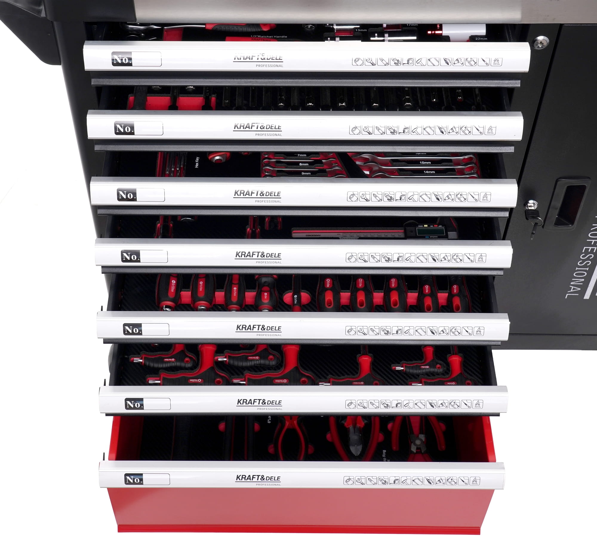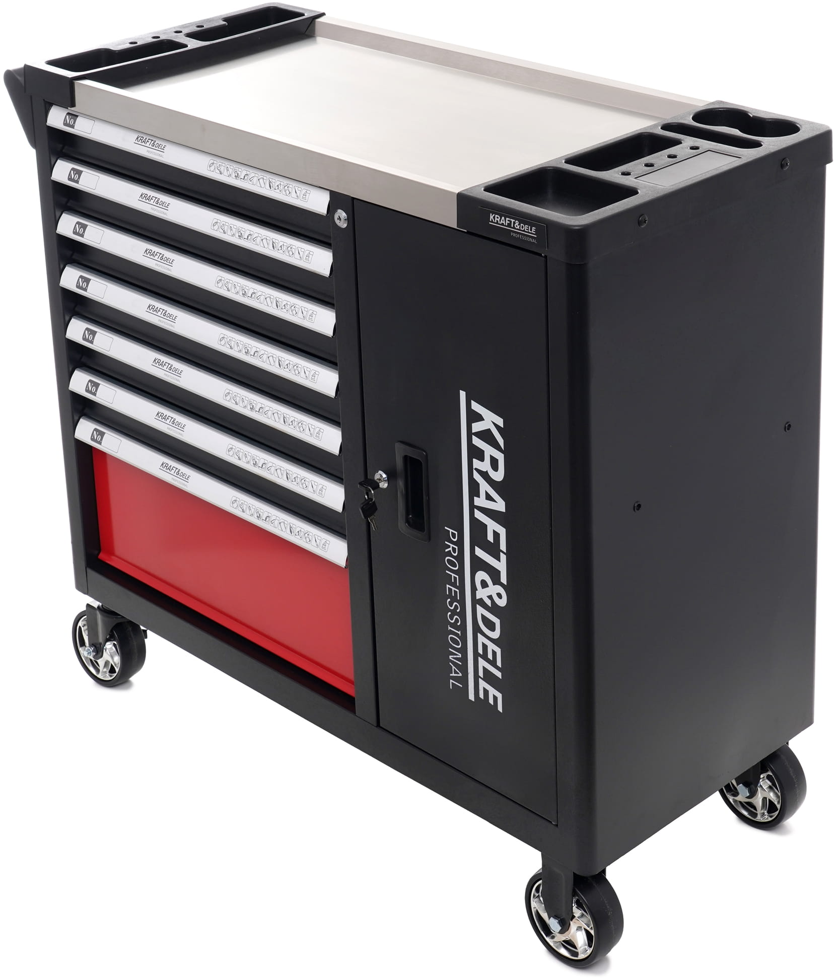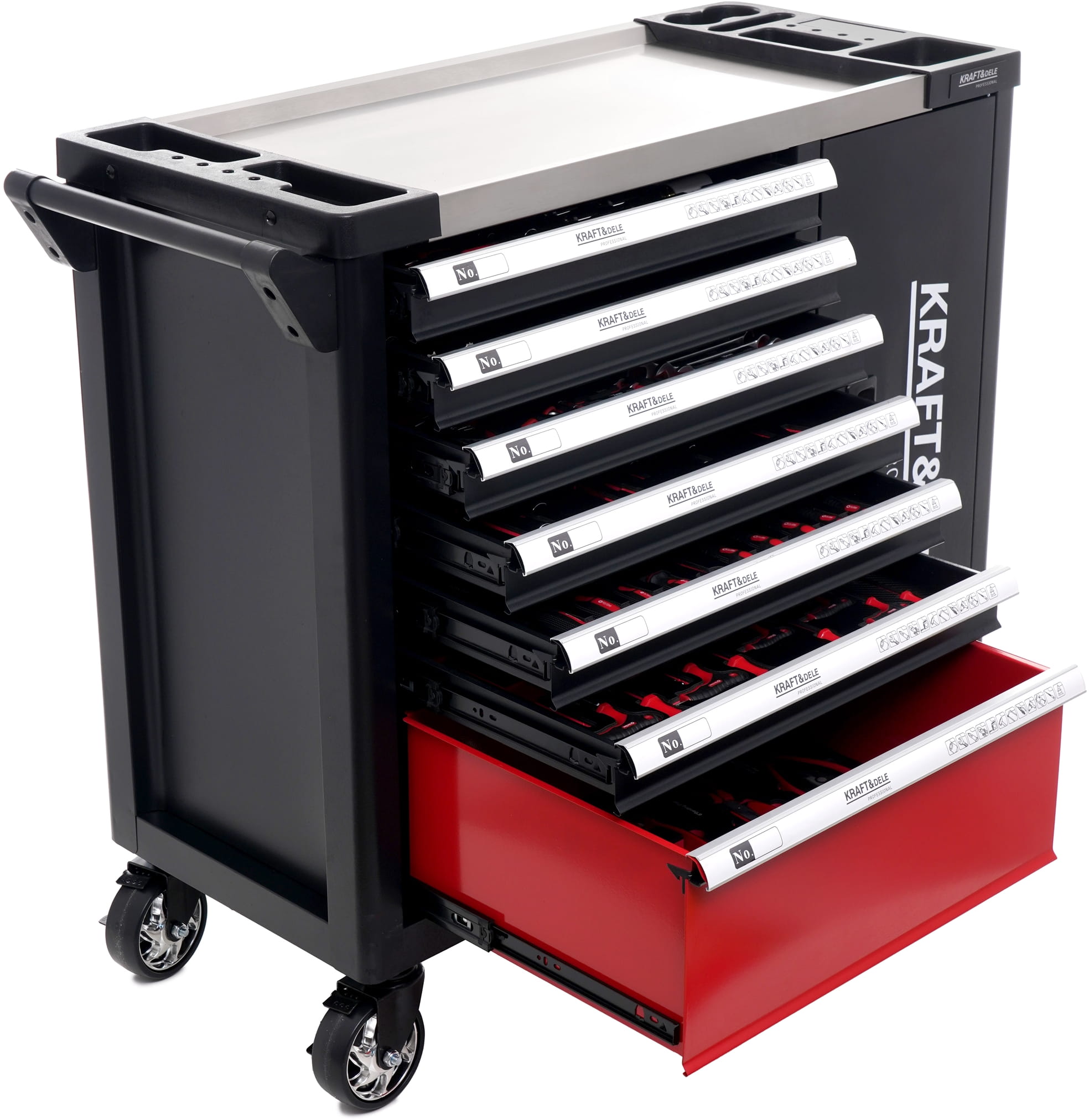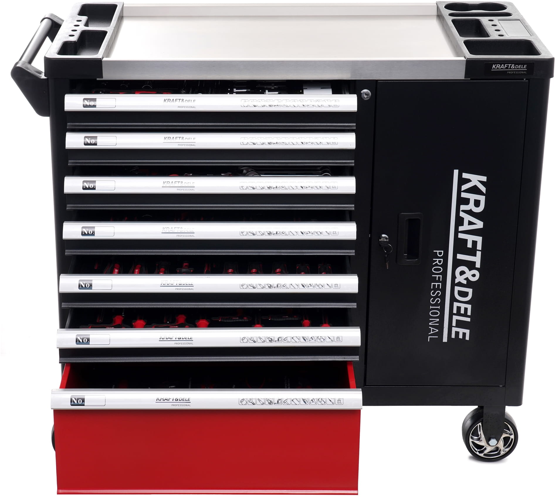 Stalowy wózek narzędziowy z kompletem 299 elementów wykonanych ze stali chromowo-wanadowej (CrV). Siedem szuflad na prowadnicach łożyskowanych mieści narzędzia ręczne, nasadki, klucze, wkrętaki i specjalistyczne akcesoria serwisowe — w jednym, mobilnym zestawie gotowym do pracy w warsztacie lub garażu.