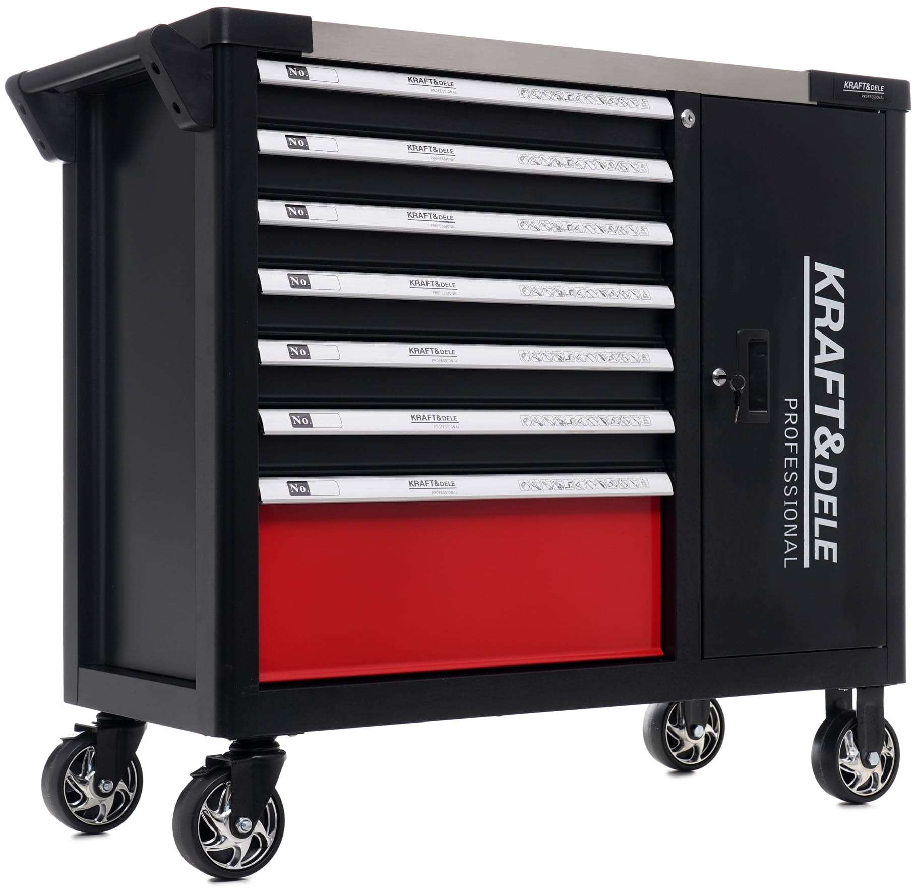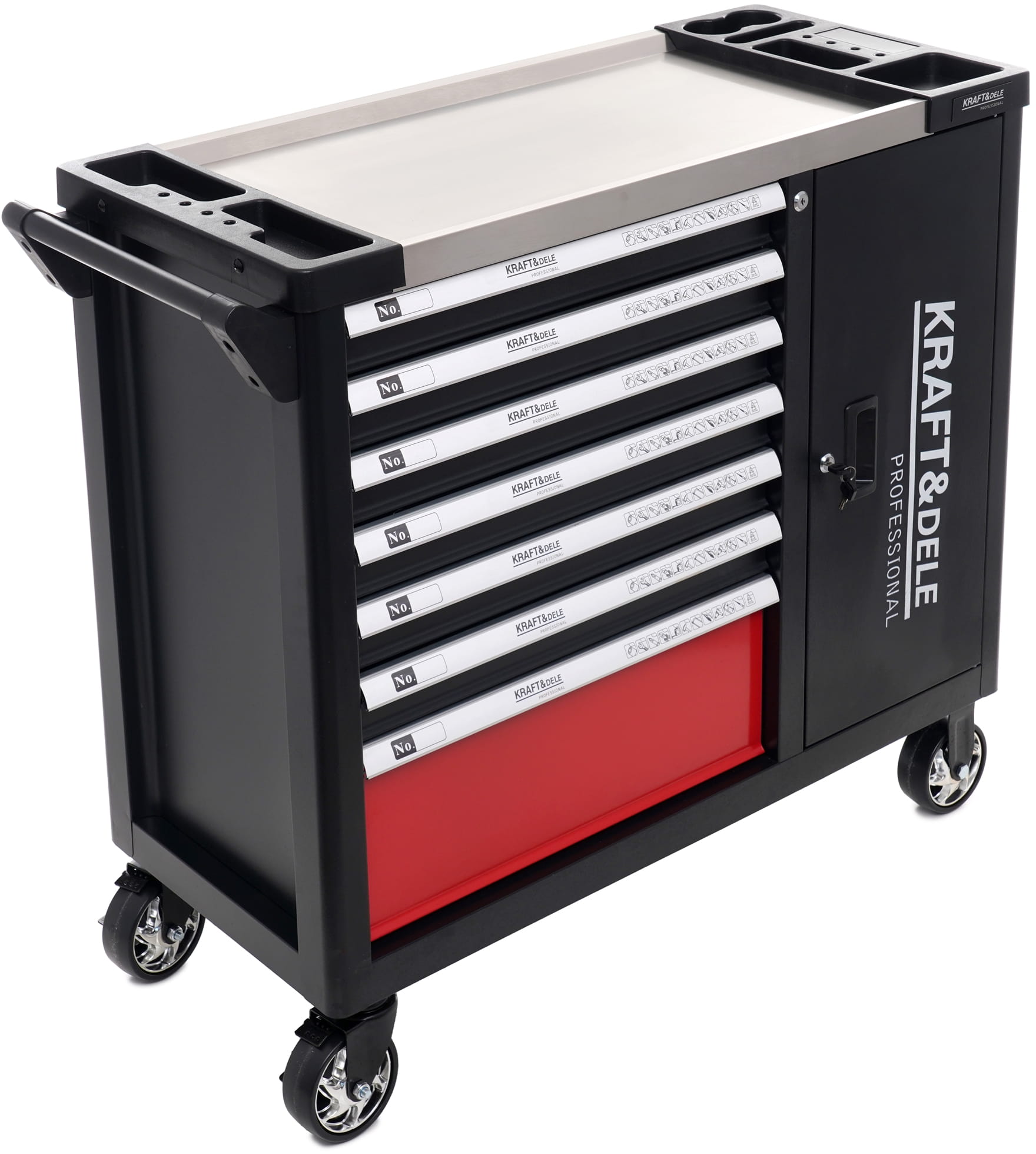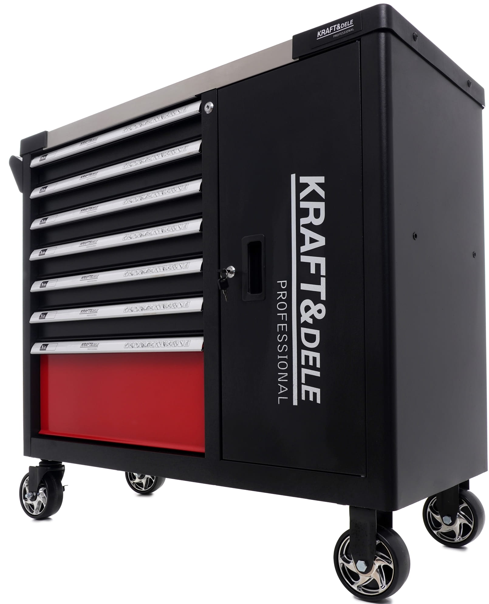 Stalowy wózek narzędziowy z kompletem 299 elementów wykonanych ze stali chromowo-wanadowej (CrV). Siedem szuflad na prowadnicach łożyskowanych mieści narzędzia ręczne, nasadki, klucze, wkrętaki i specjalistyczne akcesoria serwisowe — w jednym, mobilnym zestawie gotowym do pracy w warsztacie lub garażu.