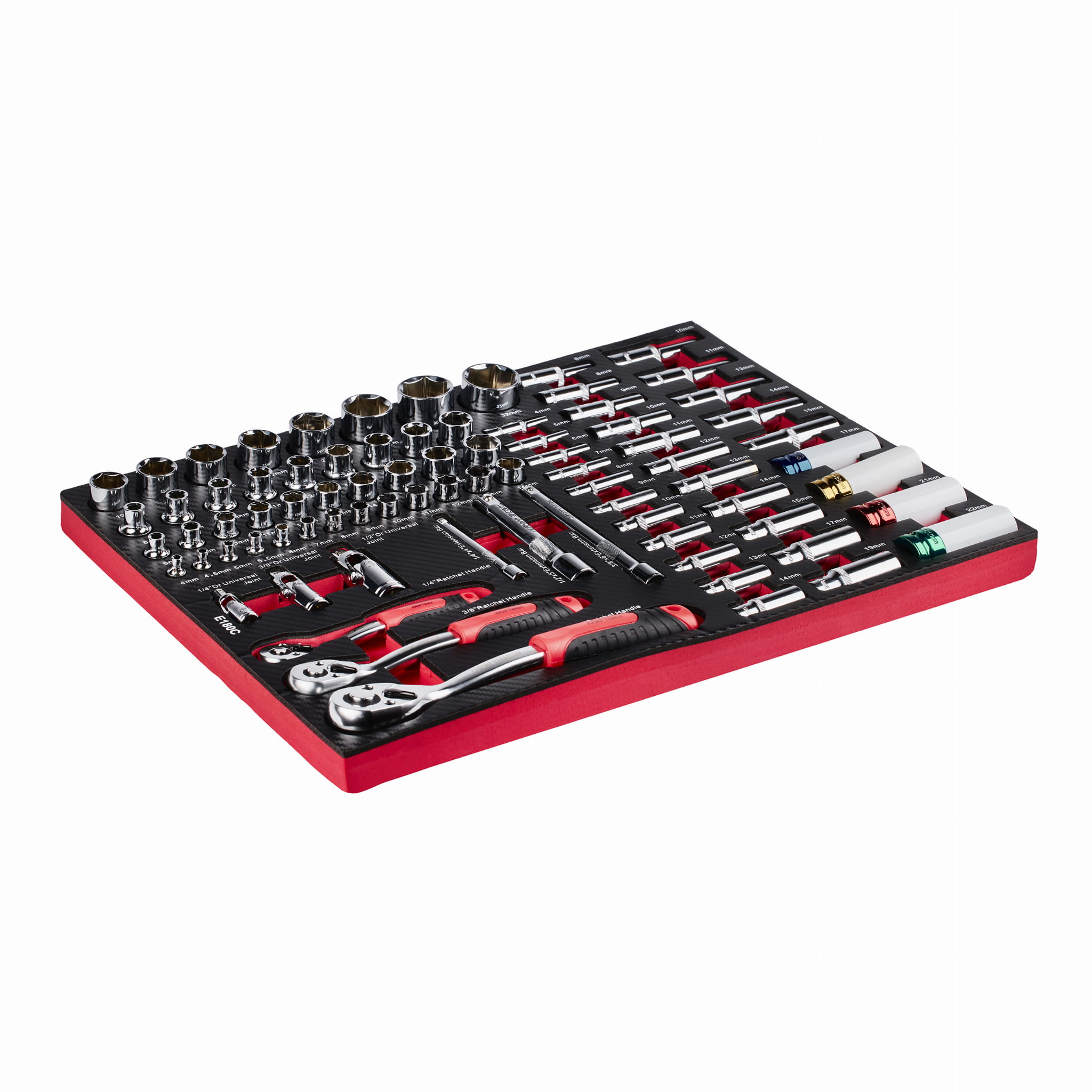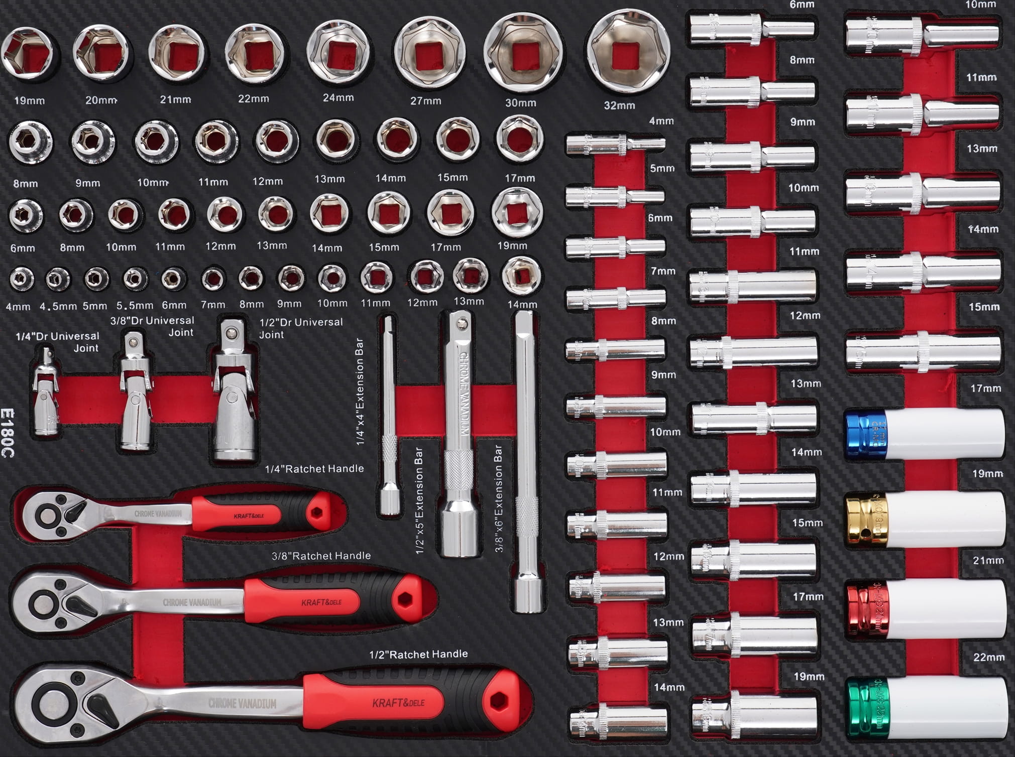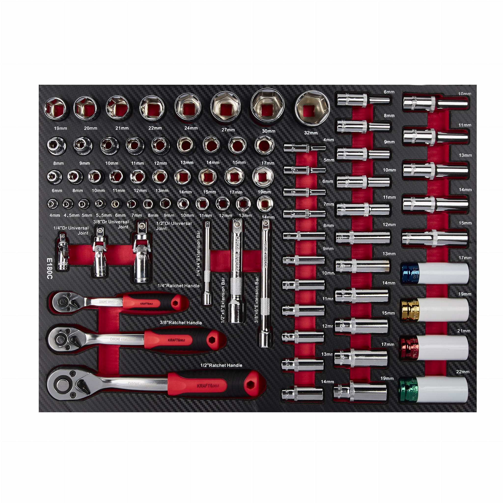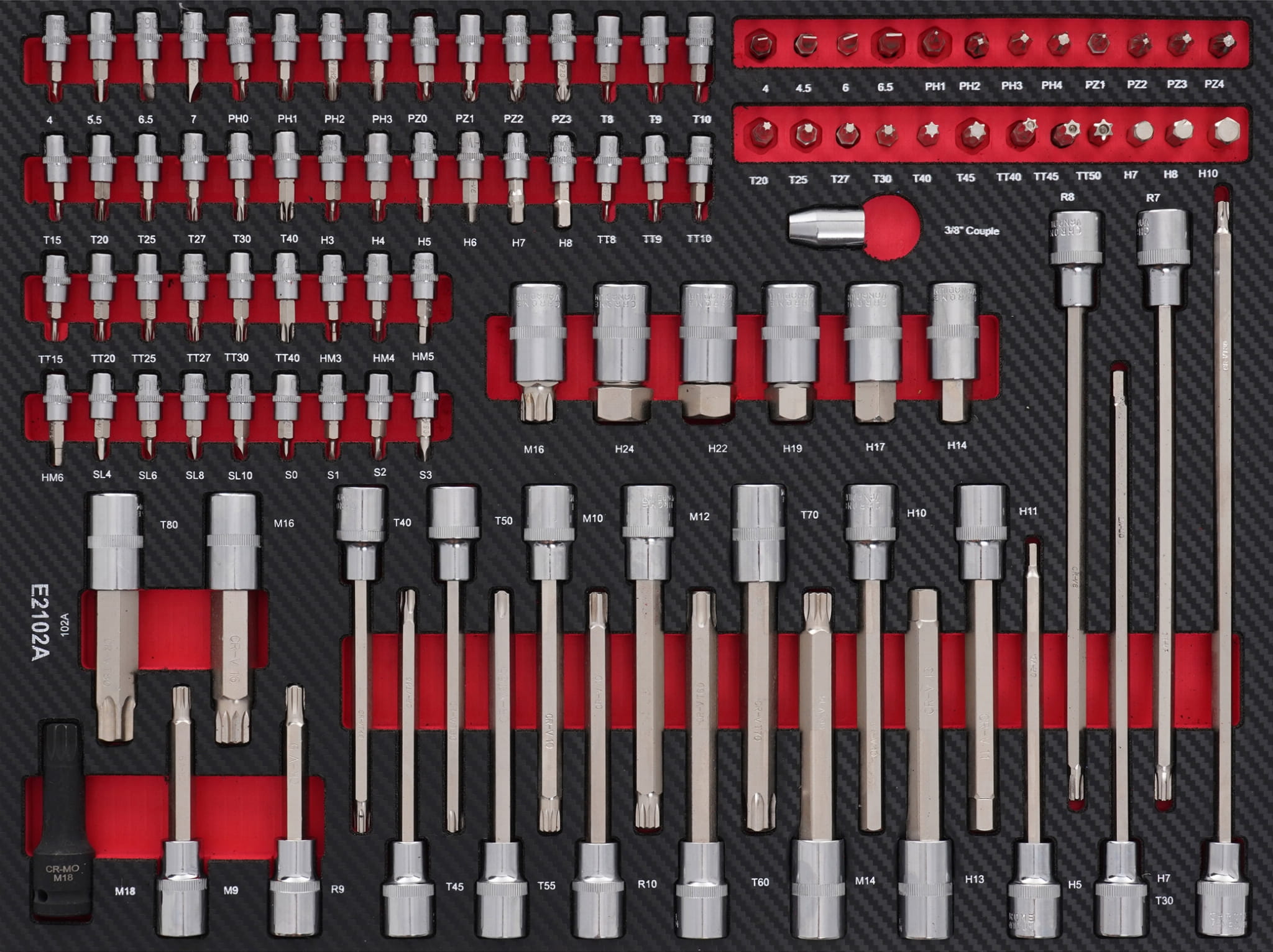 Stalowy wózek narzędziowy z kompletem 299 elementów wykonanych ze stali chromowo-wanadowej (CrV). Siedem szuflad na prowadnicach łożyskowanych mieści narzędzia ręczne, nasadki, klucze, wkrętaki i specjalistyczne akcesoria serwisowe — w jednym, mobilnym zestawie gotowym do pracy w warsztacie lub garażu.