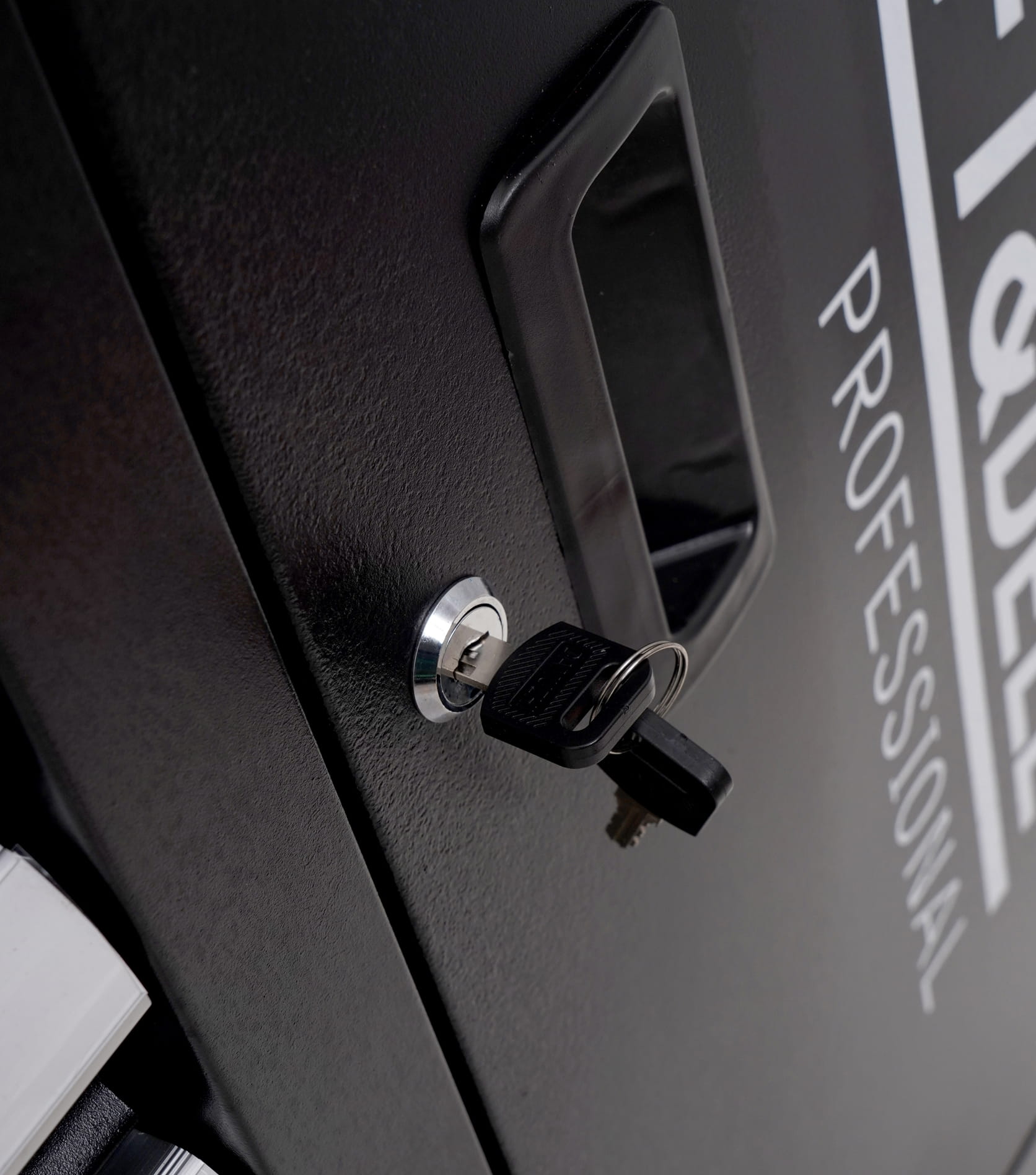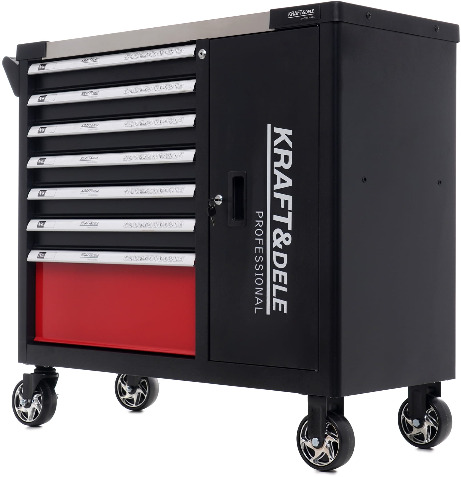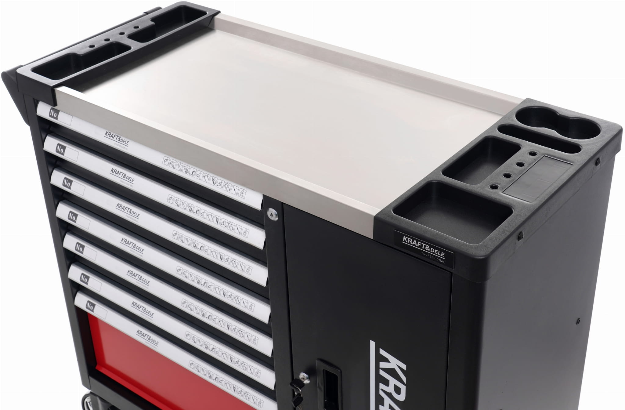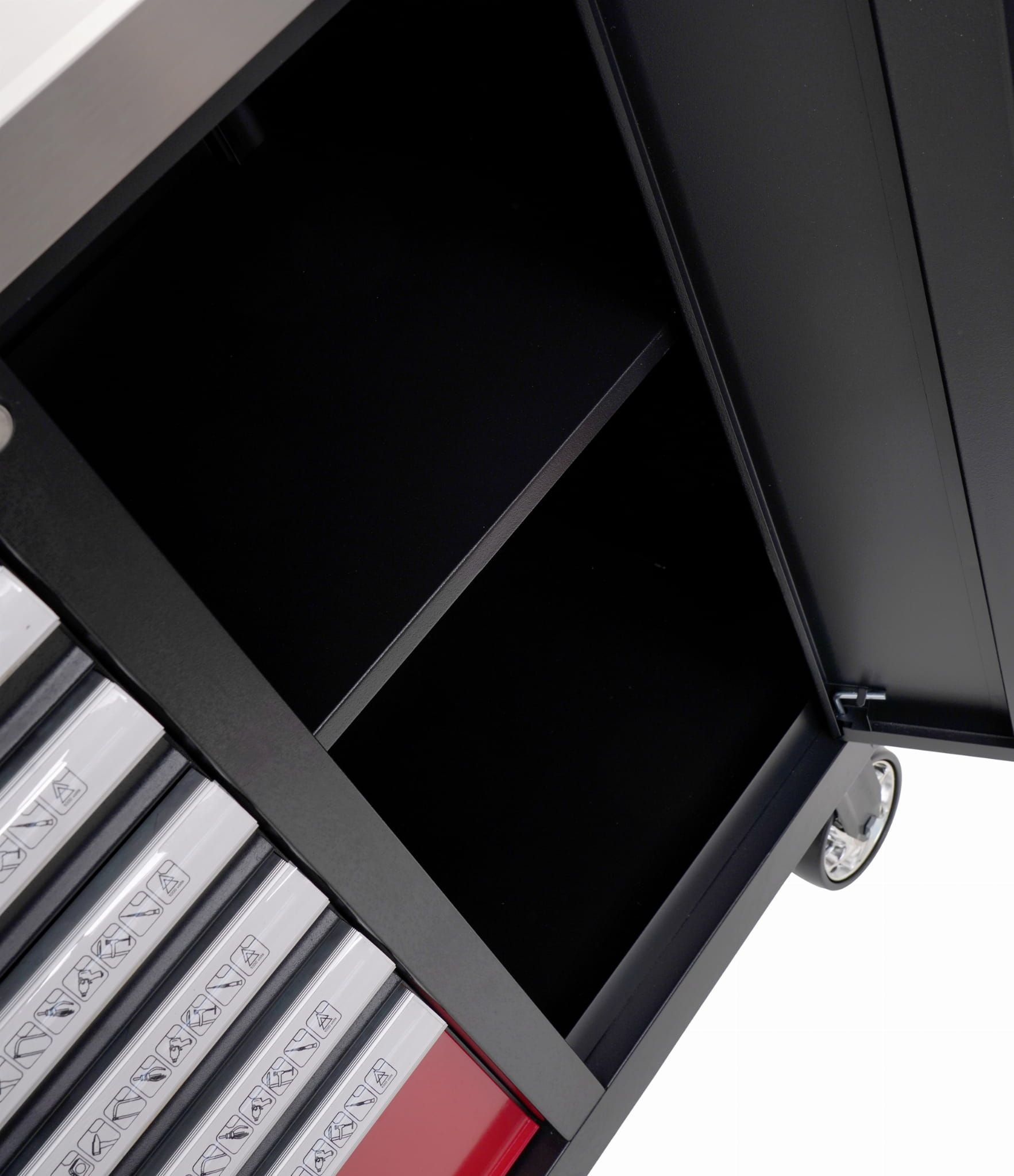 Górny blat wyposażony jest w organizer o zróżnicowanych wymiarach gniazd, umożliwiający tymczasowe odkładanie narzędzi podczas pracy. Zamykany schowek z zamkiem na klucz pozwala zabezpieczyć wybrane elementy przed nieuprawnionym dostępem.