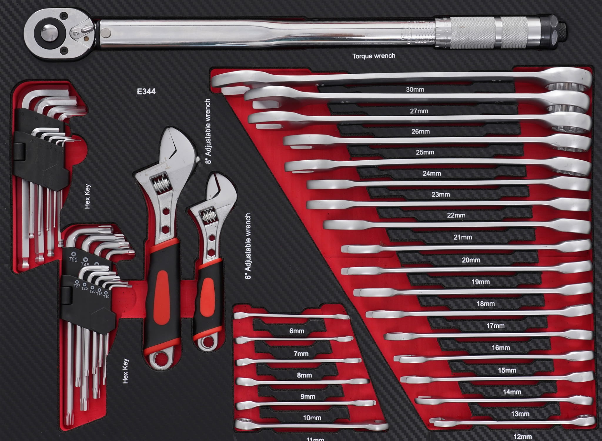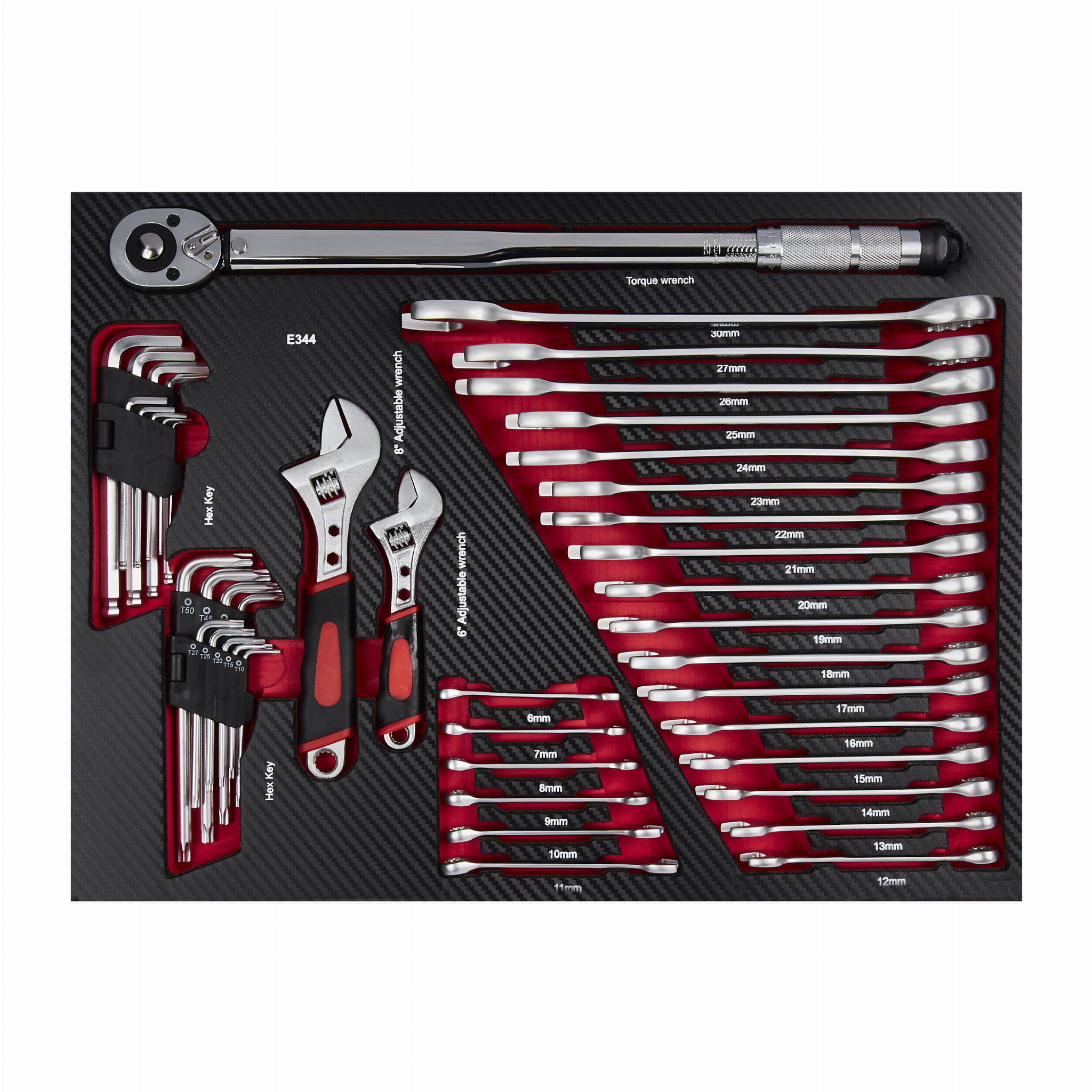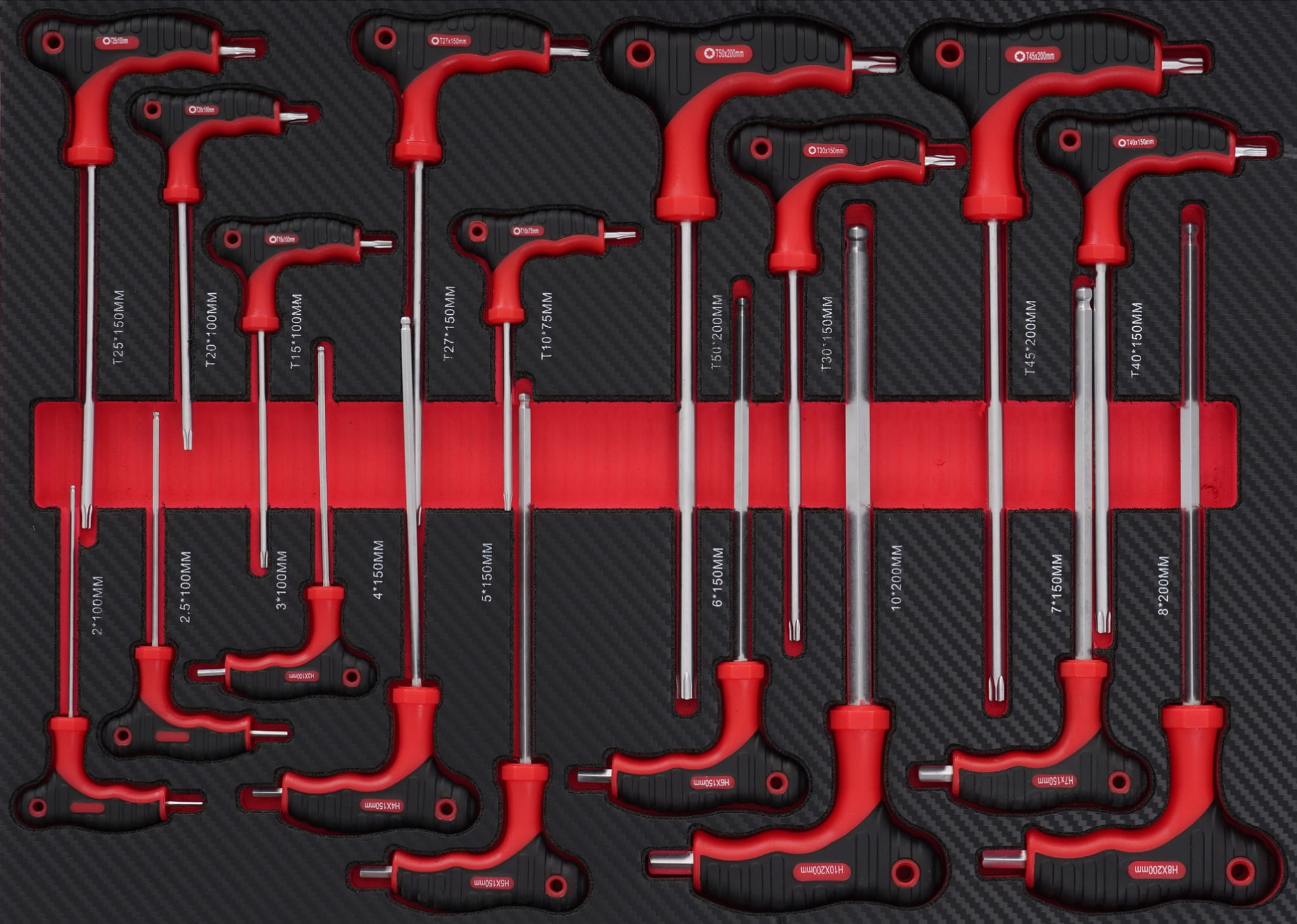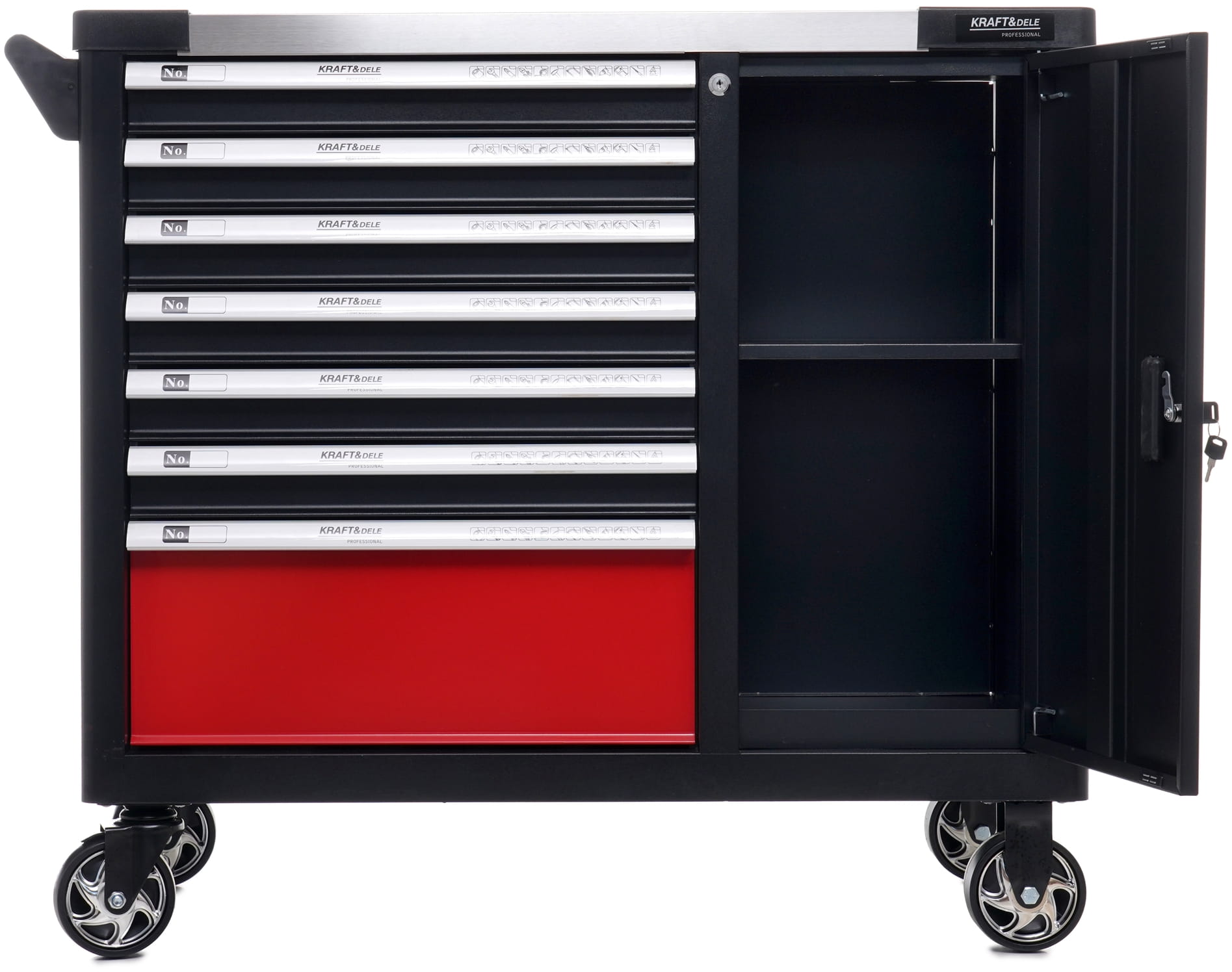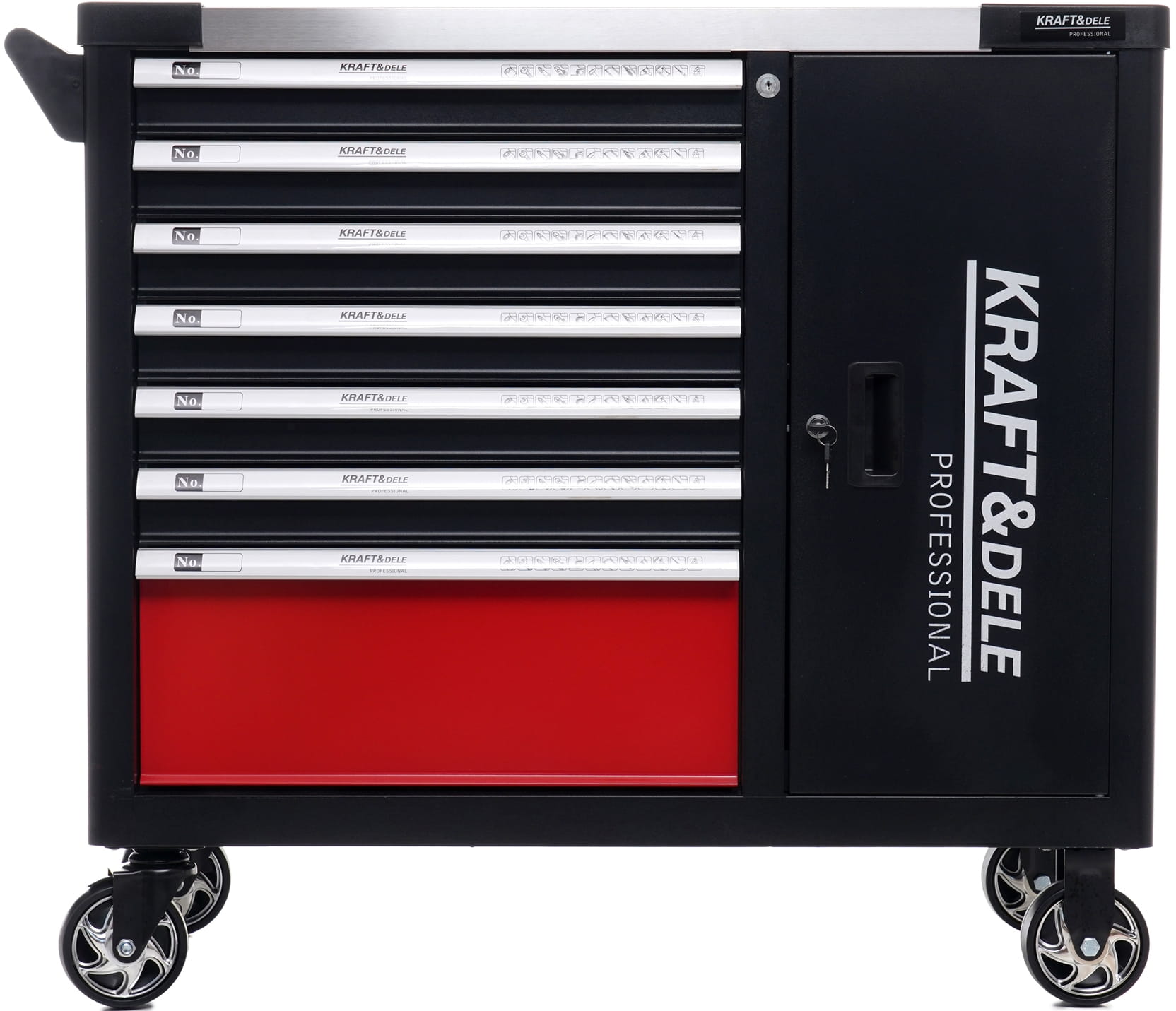 Górny blat wyposażony jest w organizer o zróżnicowanych wymiarach gniazd, umożliwiający tymczasowe odkładanie narzędzi podczas pracy. Zamykany schowek z zamkiem na klucz pozwala zabezpieczyć wybrane elementy przed nieuprawnionym dostępem.