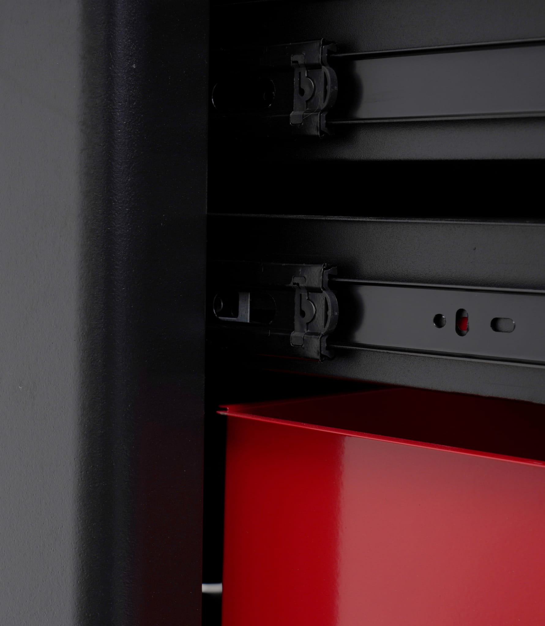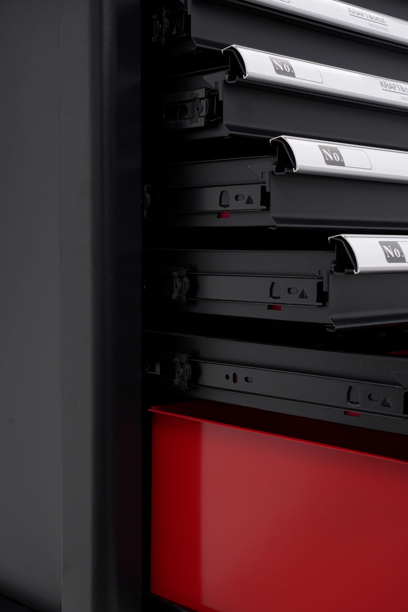 Mechanizm pozwala na otwarcie tylko jednej szuflady jednocześnie. Zapobiega to przesunięciu środka ciężkości szafki i jej wywróceniu podczas pracy — istotne przy pełnym załadowaniu narzędziami.