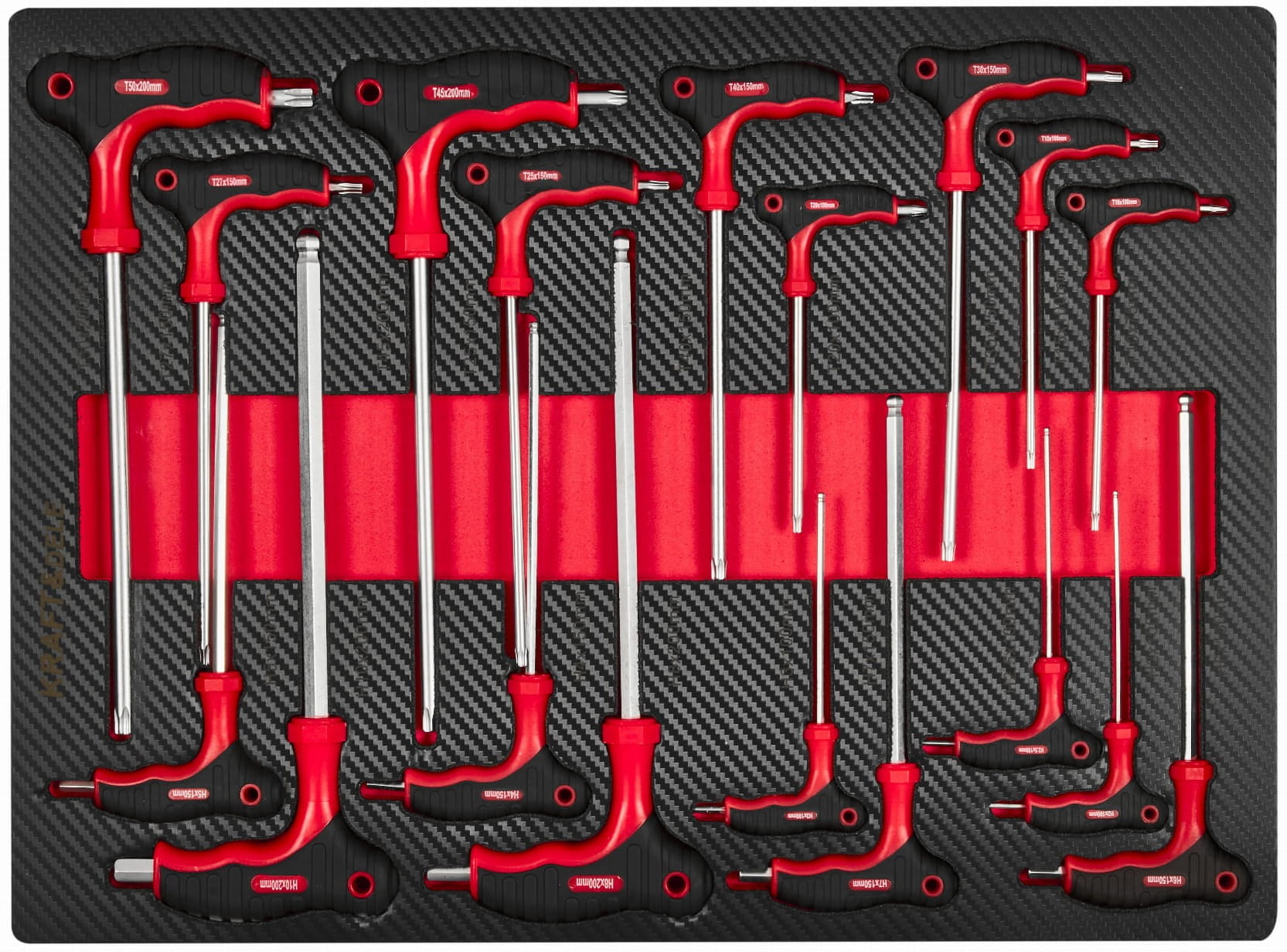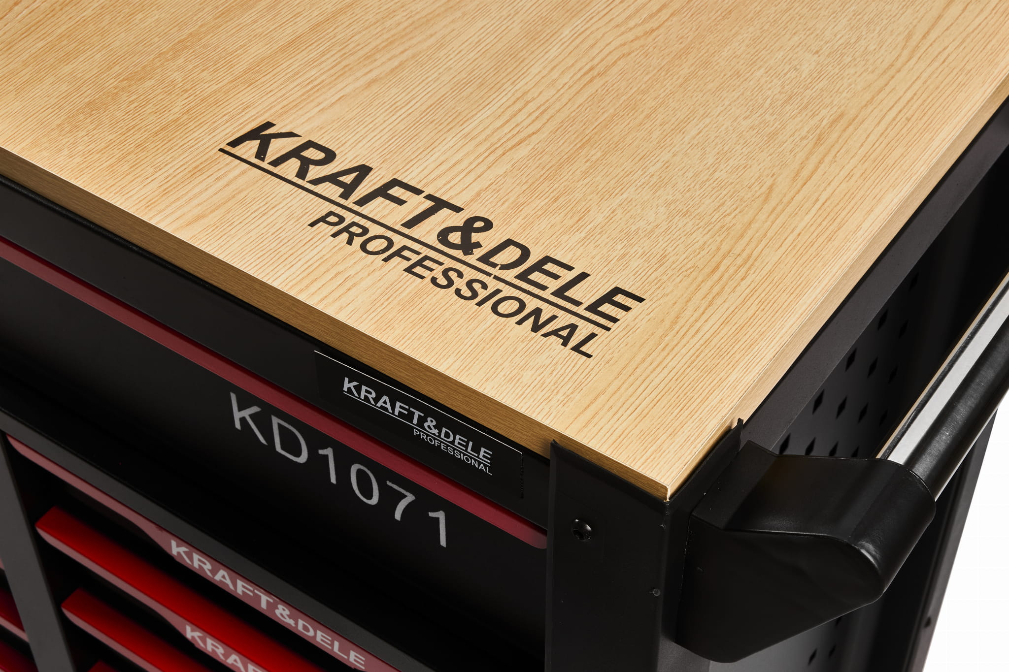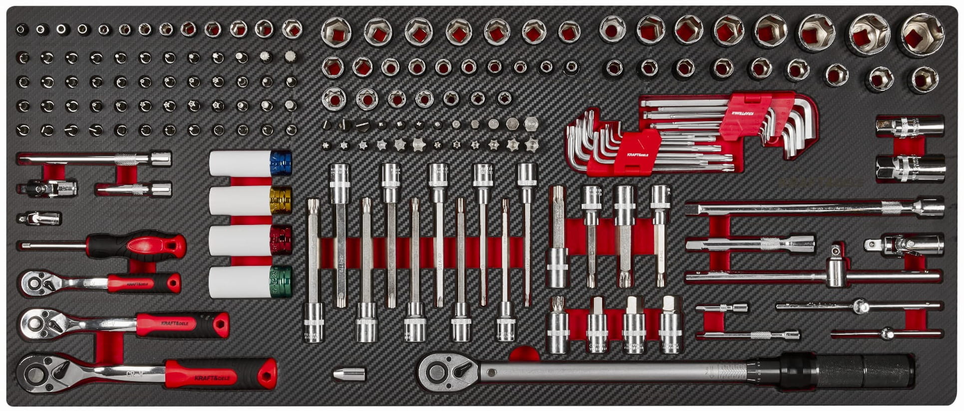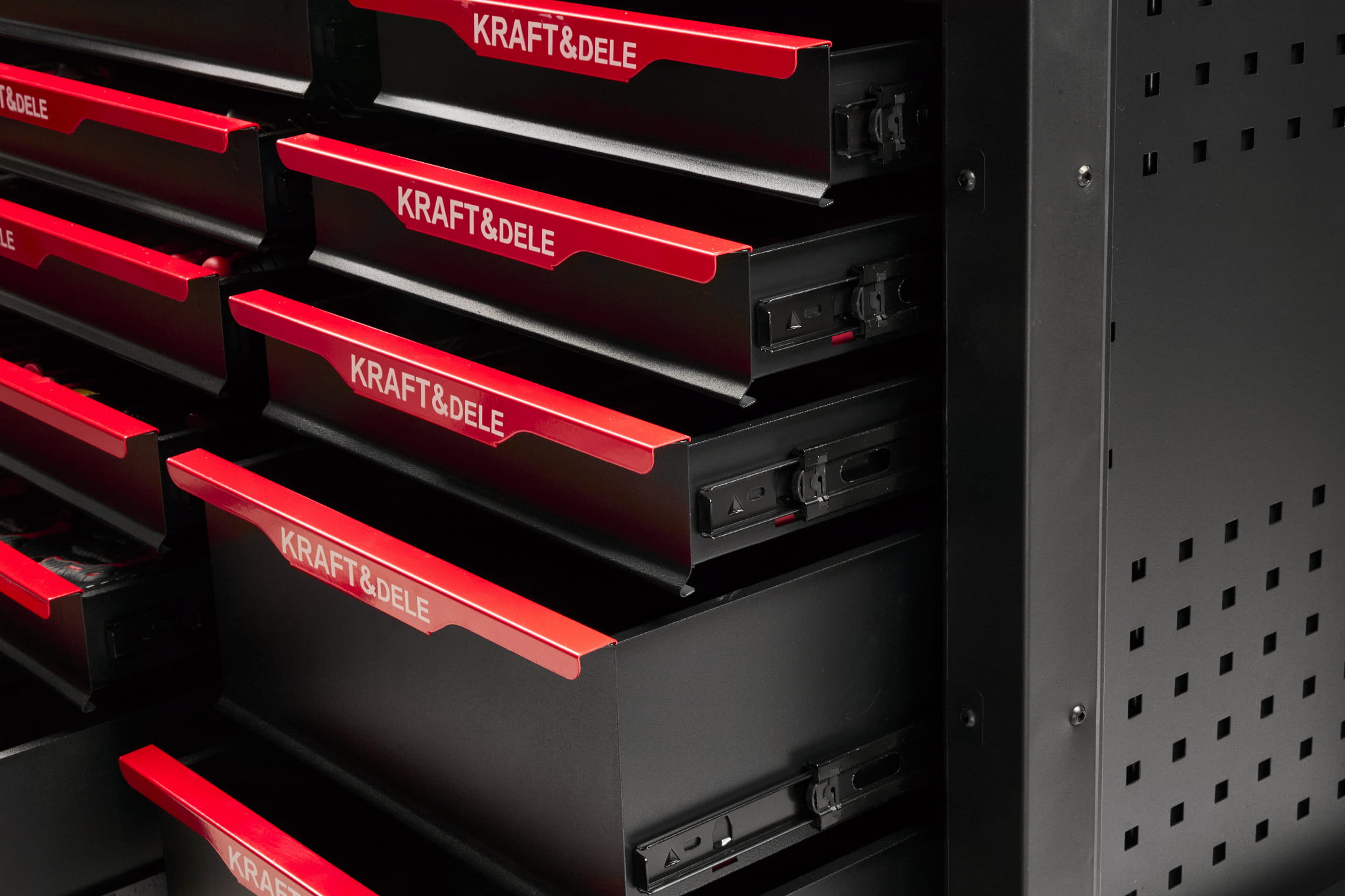 Trójkolumnowy układ szuflad pozwala na logiczne pogrupowanie narzędzi według funkcji: szuflada centralna mieści komplet nasadek i grzechotek, lewe szuflady — klucze, szczypce i wkrętaki, prawe — narzędzia specjalistyczne i serwisowe.