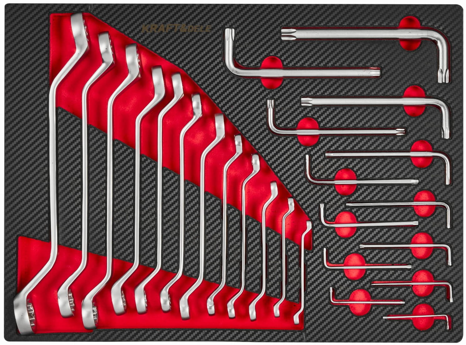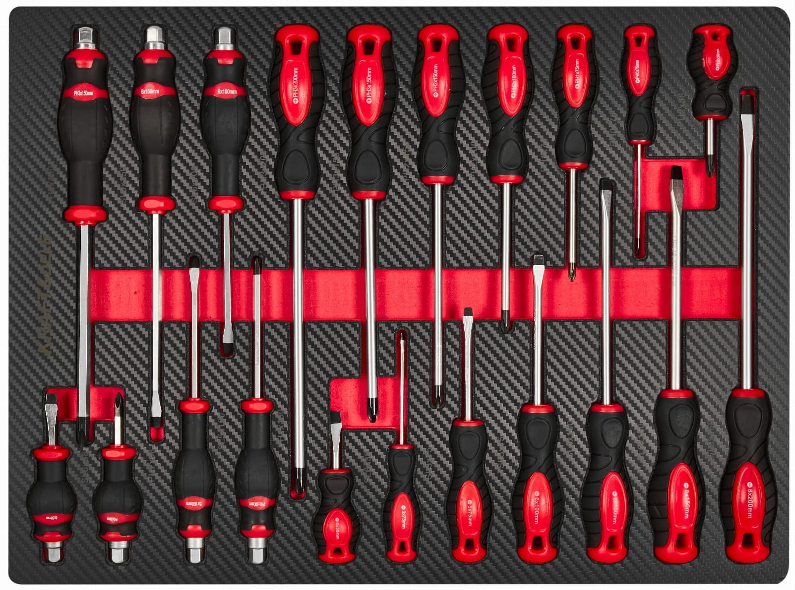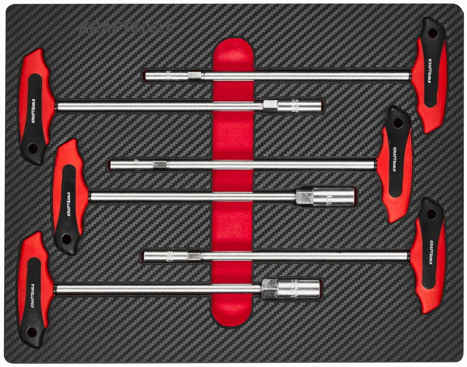 Trójkolumnowy układ szuflad pozwala na logiczne pogrupowanie narzędzi według funkcji: szuflada centralna mieści komplet nasadek i grzechotek, lewe szuflady — klucze, szczypce i wkrętaki, prawe — narzędzia specjalistyczne i serwisowe.