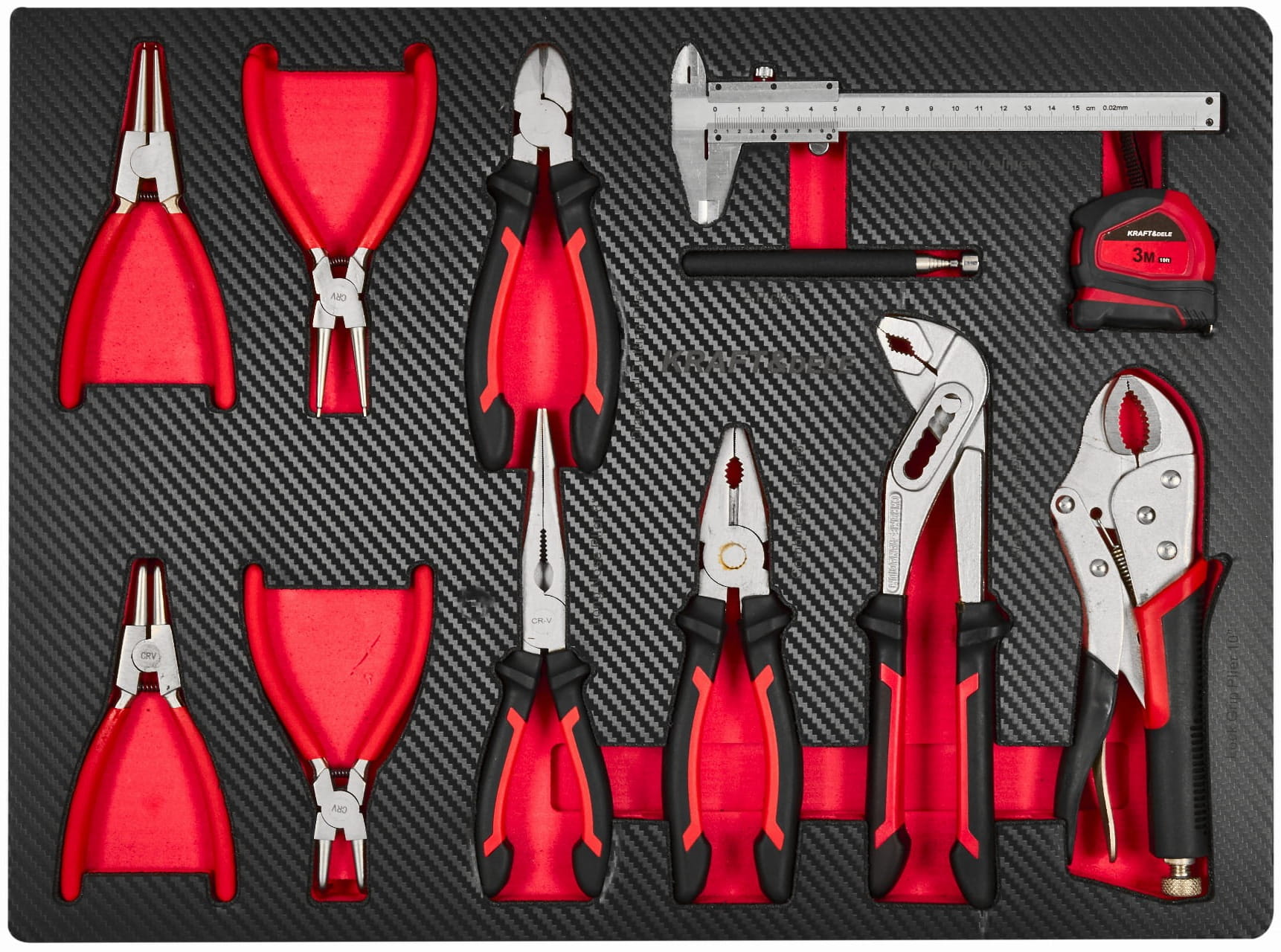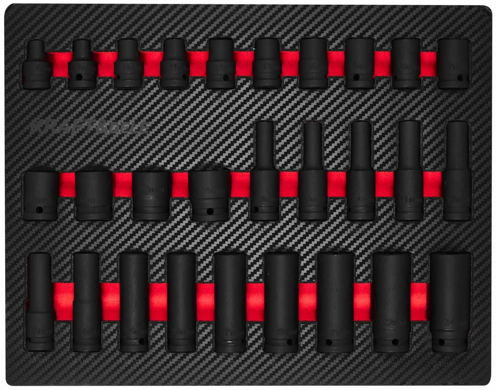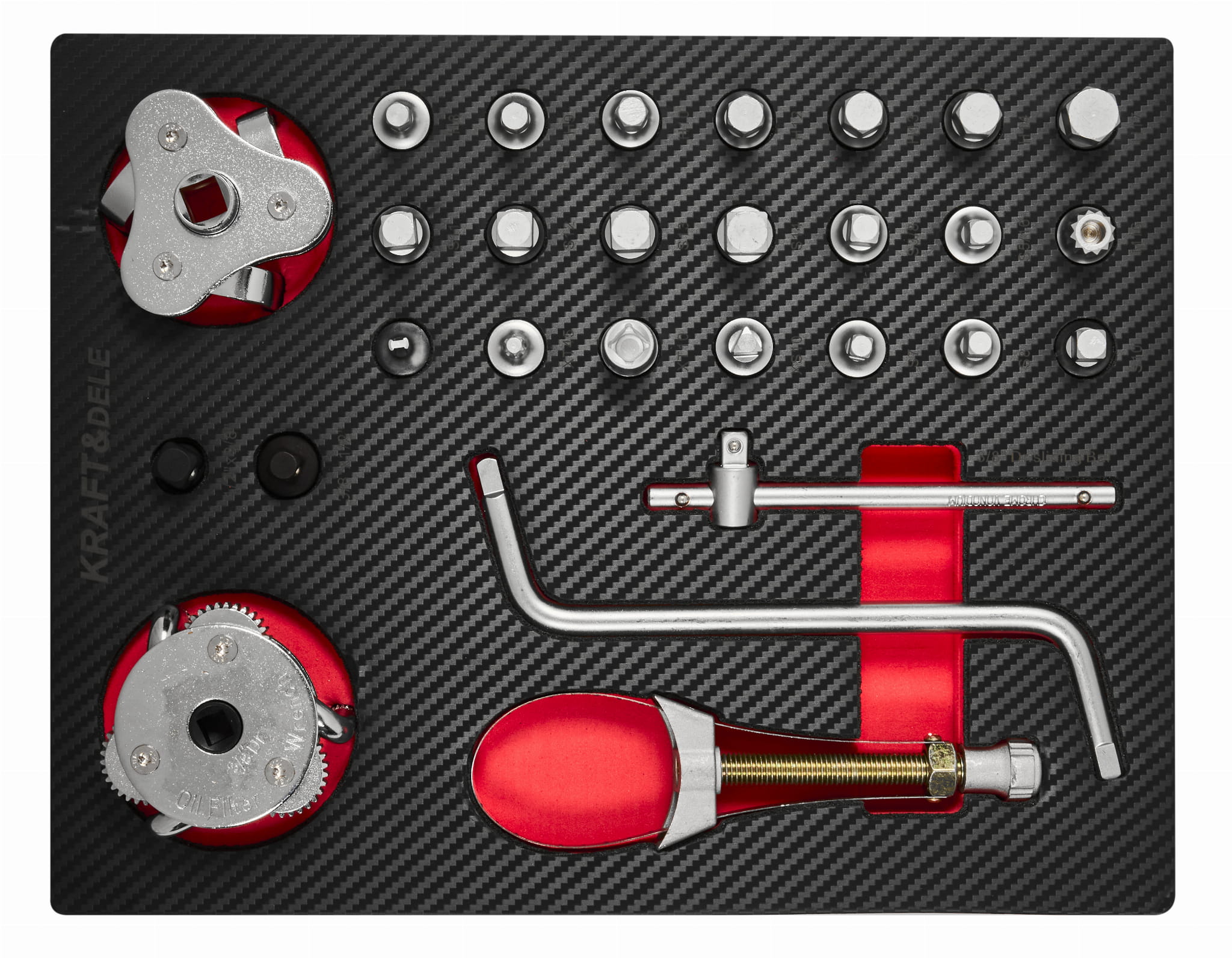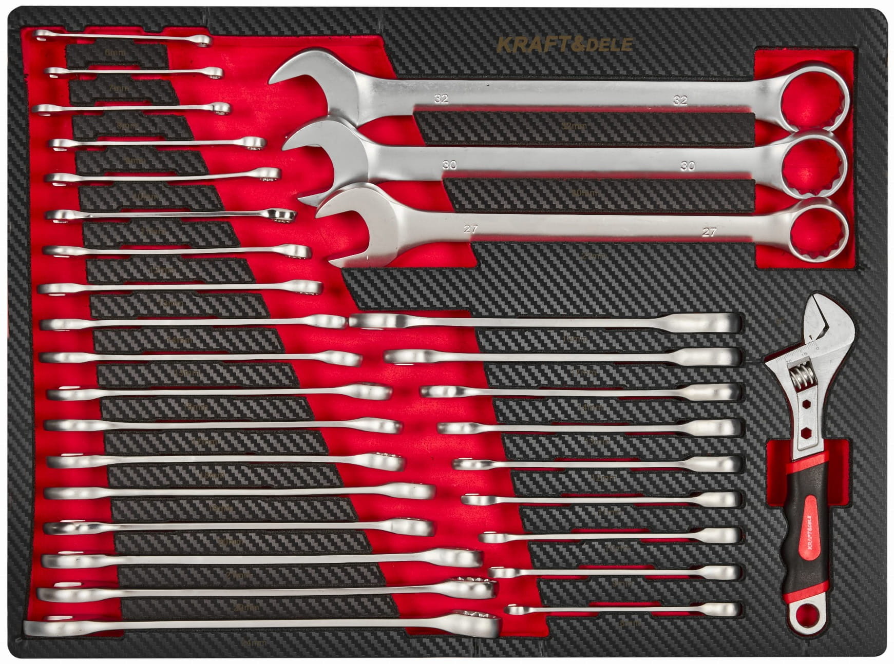 Trójkolumnowy układ szuflad pozwala na logiczne pogrupowanie narzędzi według funkcji: szuflada centralna mieści komplet nasadek i grzechotek, lewe szuflady — klucze, szczypce i wkrętaki, prawe — narzędzia specjalistyczne i serwisowe.