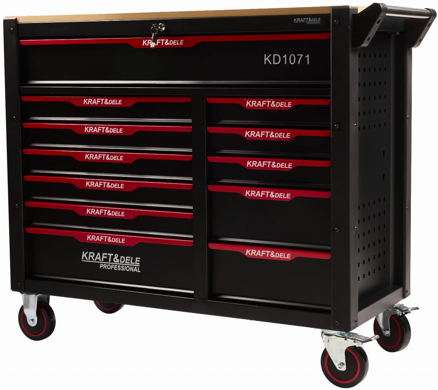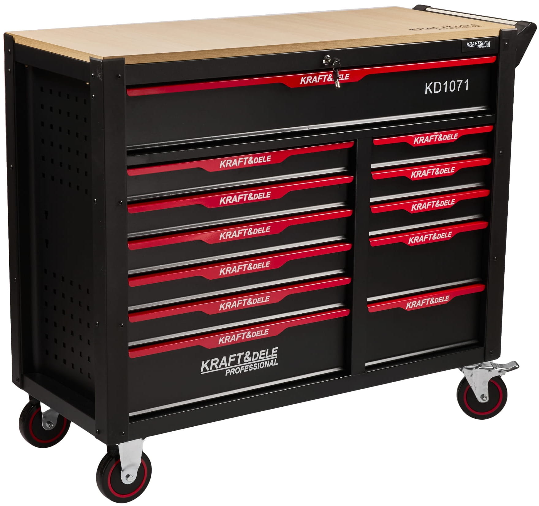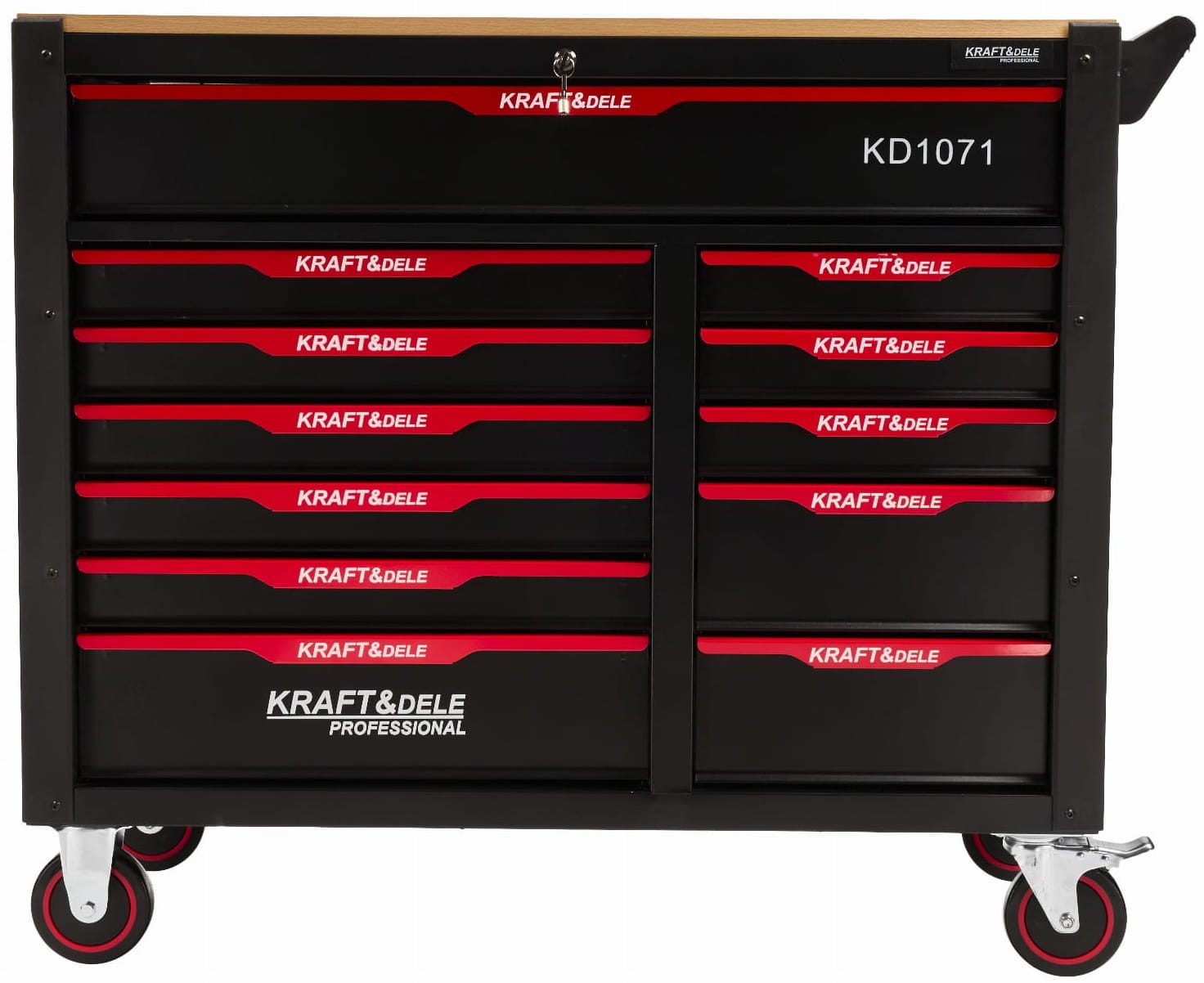 Stalowy wózek narzędziowy z kompletem 541 elementów wykonanych ze stali chromowo-wanadowej CrV. Konstrukcja z 12 szufladami na łożyskowanych prowadnicach przeznaczona do stałego użytku warsztatowego i garażowego. Masa własna 124 kg świadczy o masywności obudowy i objętości zestawu narzędzi.
