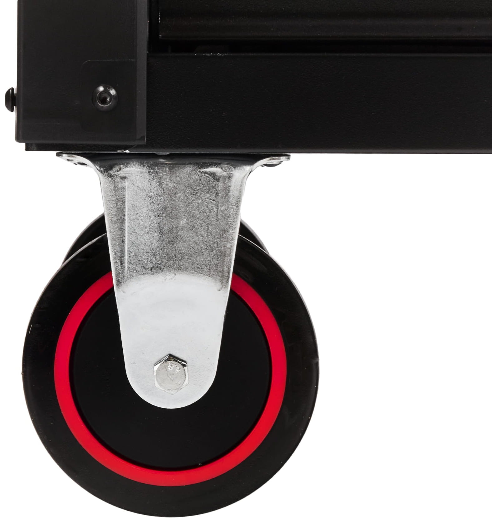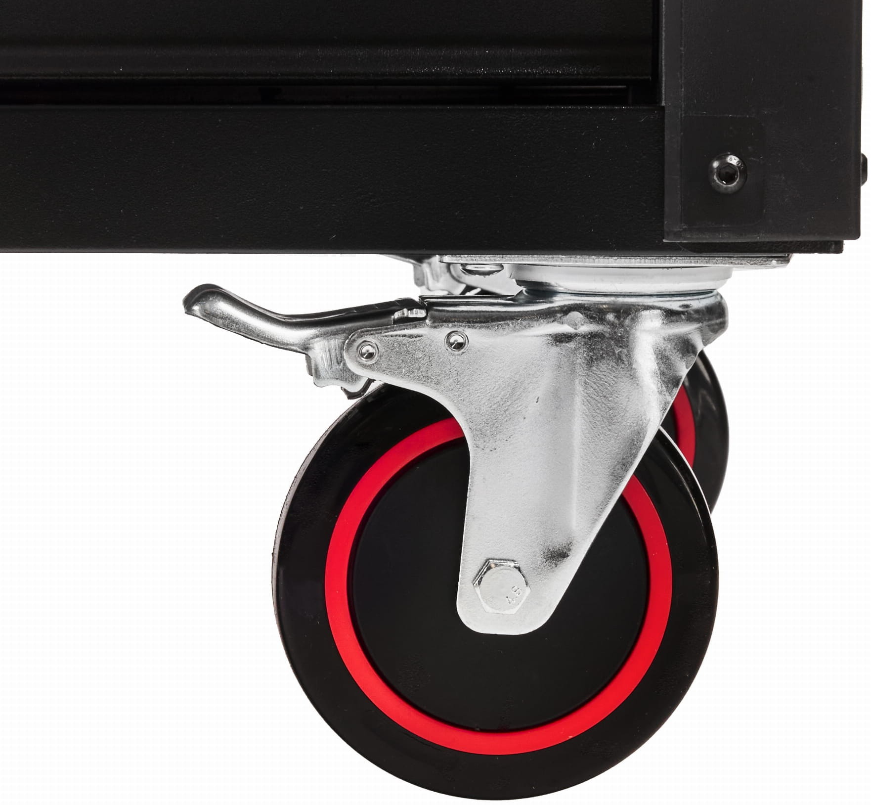 Duże kółka z automatyczną blokadą umożliwiają przemieszczanie szafki po podłożu warsztatu bez konieczności jej rozładowywania. Hamulec blokuje wózek w miejscu pracy, zapobiegając niekontrolowanemu przemieszczeniu.