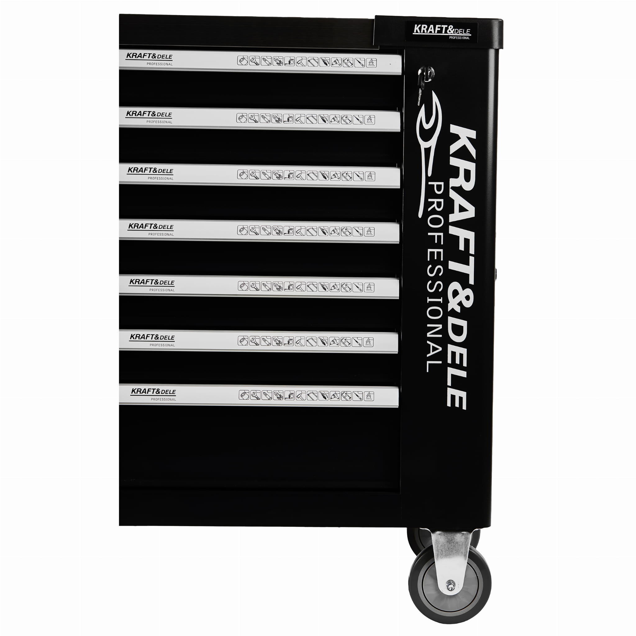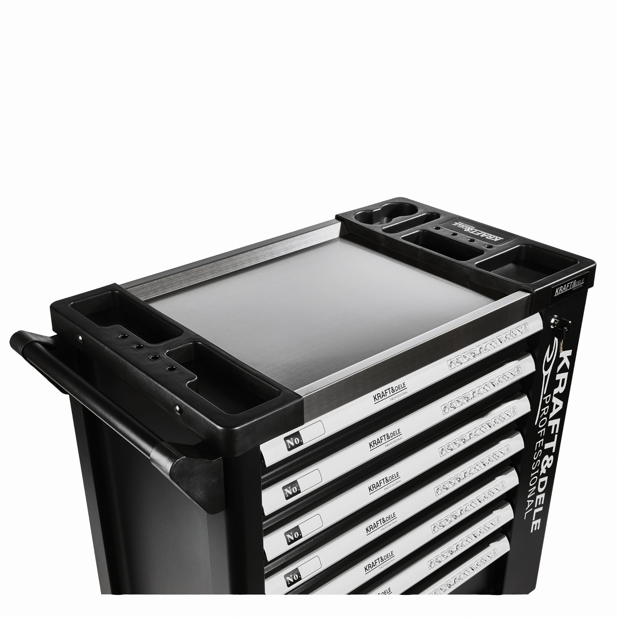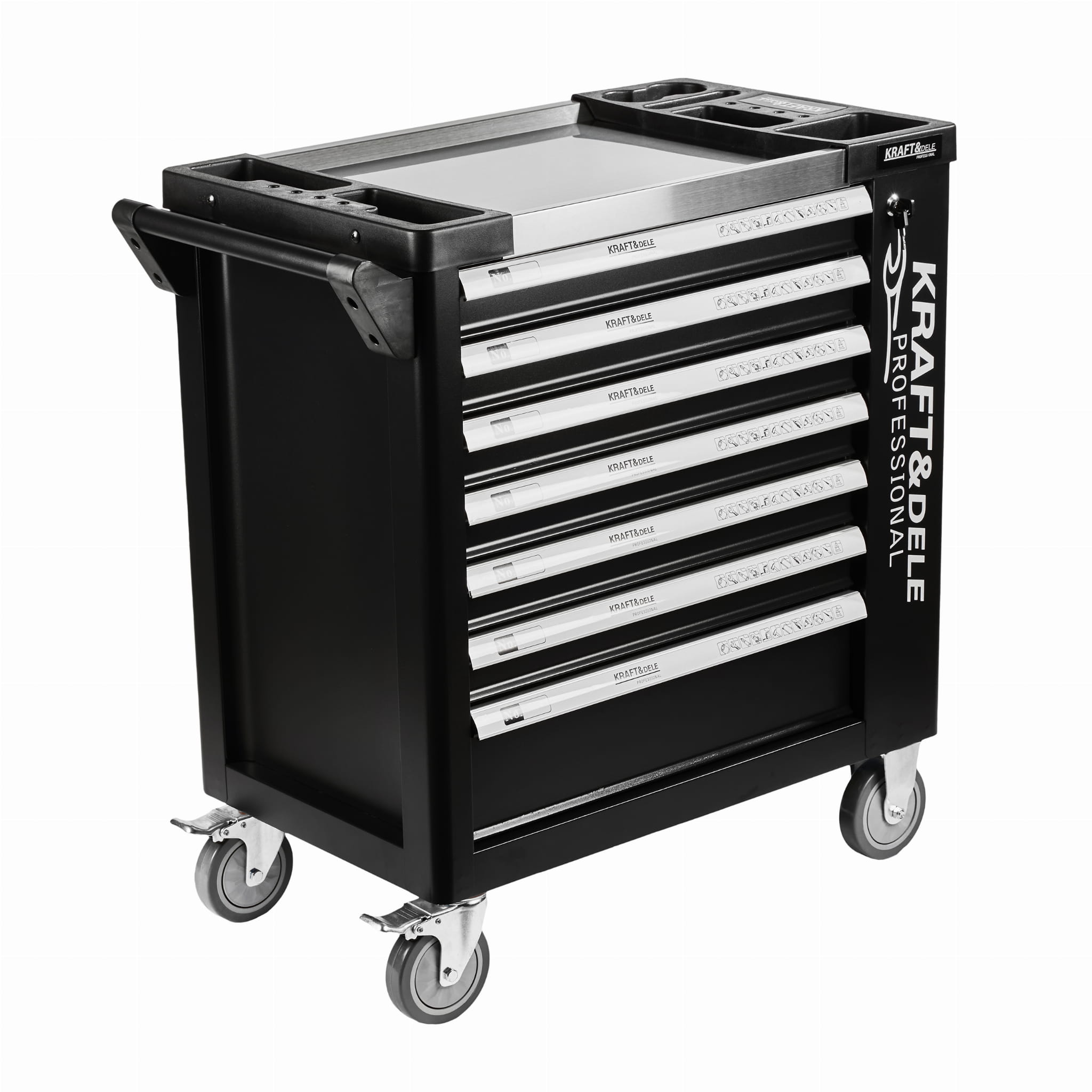 KD1070 to stalowy wózek warsztatowy marki Kraft&Dele wyposażony w 7 szuflad na łożyskach kulkowych oraz zamykany dwupoziomowy schowek. Konstrukcja przeznaczona do organizacji narzędzi w garażu, warsztacie samochodowym i zakładzie produkcyjnym — dostarczona bez wyposażenia, gotowa do samodzielnego zagospodarowania.