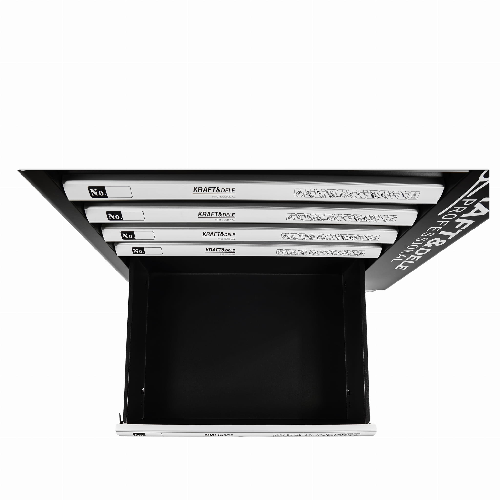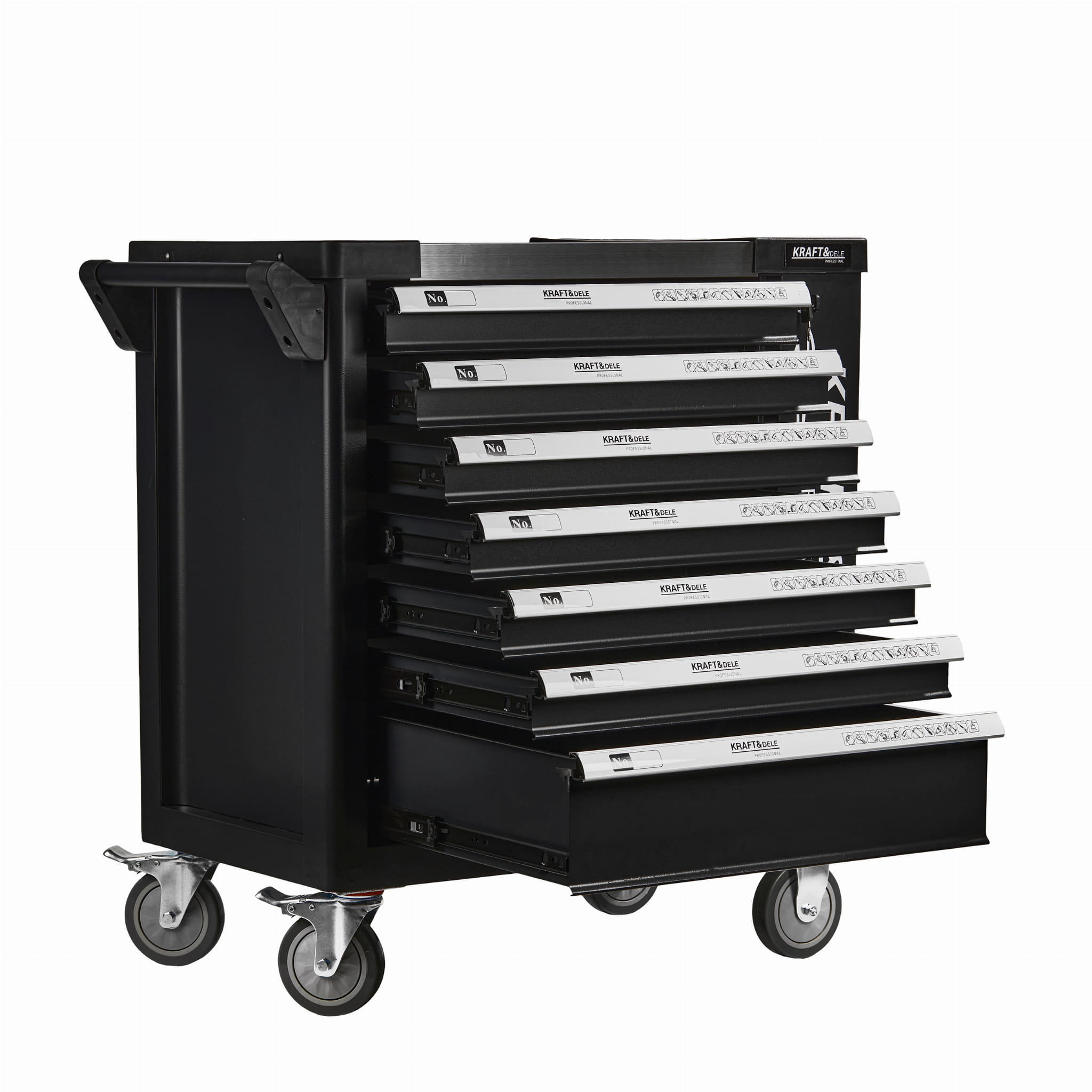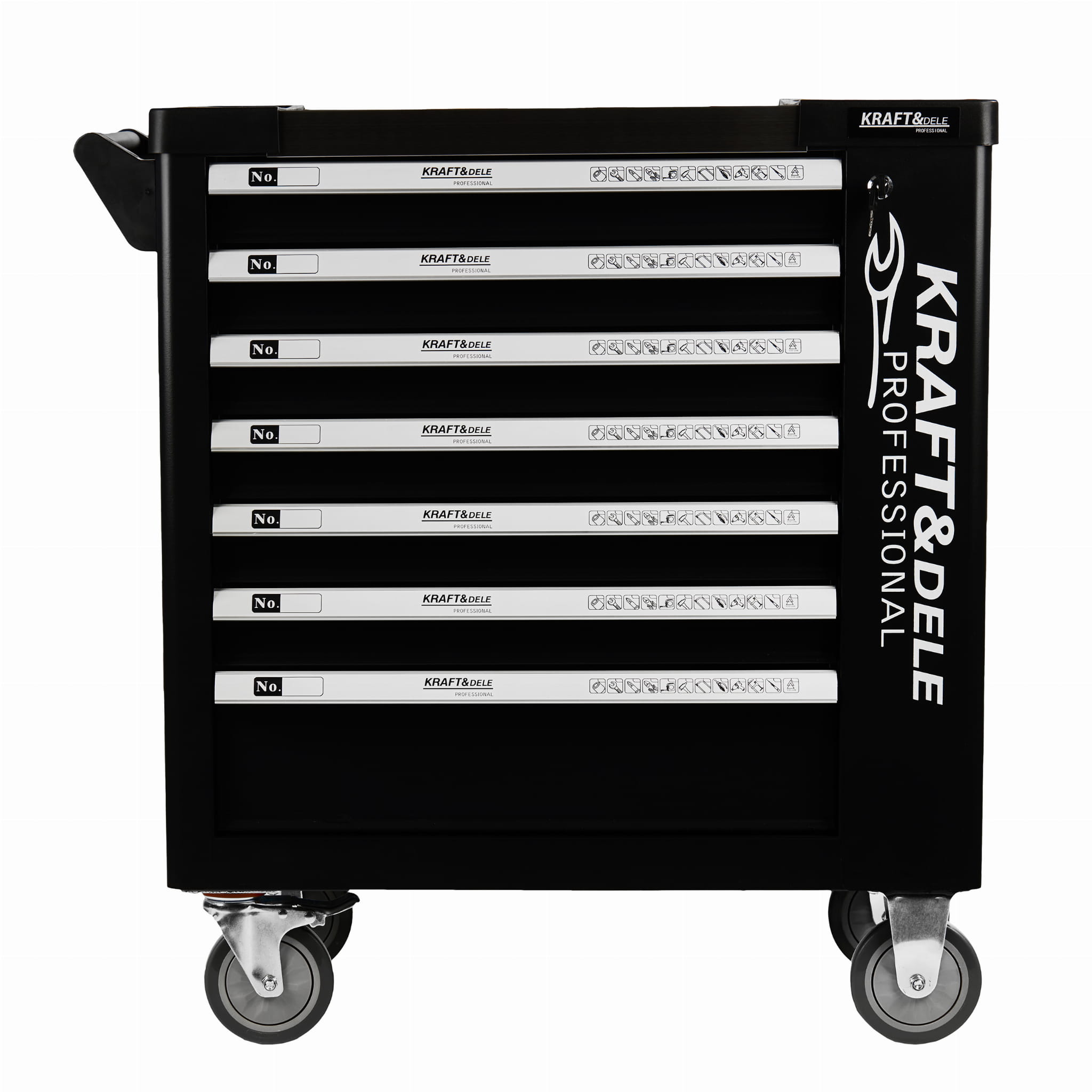 KD1070 to stalowy wózek warsztatowy marki Kraft&Dele wyposażony w 7 szuflad na łożyskach kulkowych oraz zamykany dwupoziomowy schowek. Konstrukcja przeznaczona do organizacji narzędzi w garażu, warsztacie samochodowym i zakładzie produkcyjnym — dostarczona bez wyposażenia, gotowa do samodzielnego zagospodarowania.