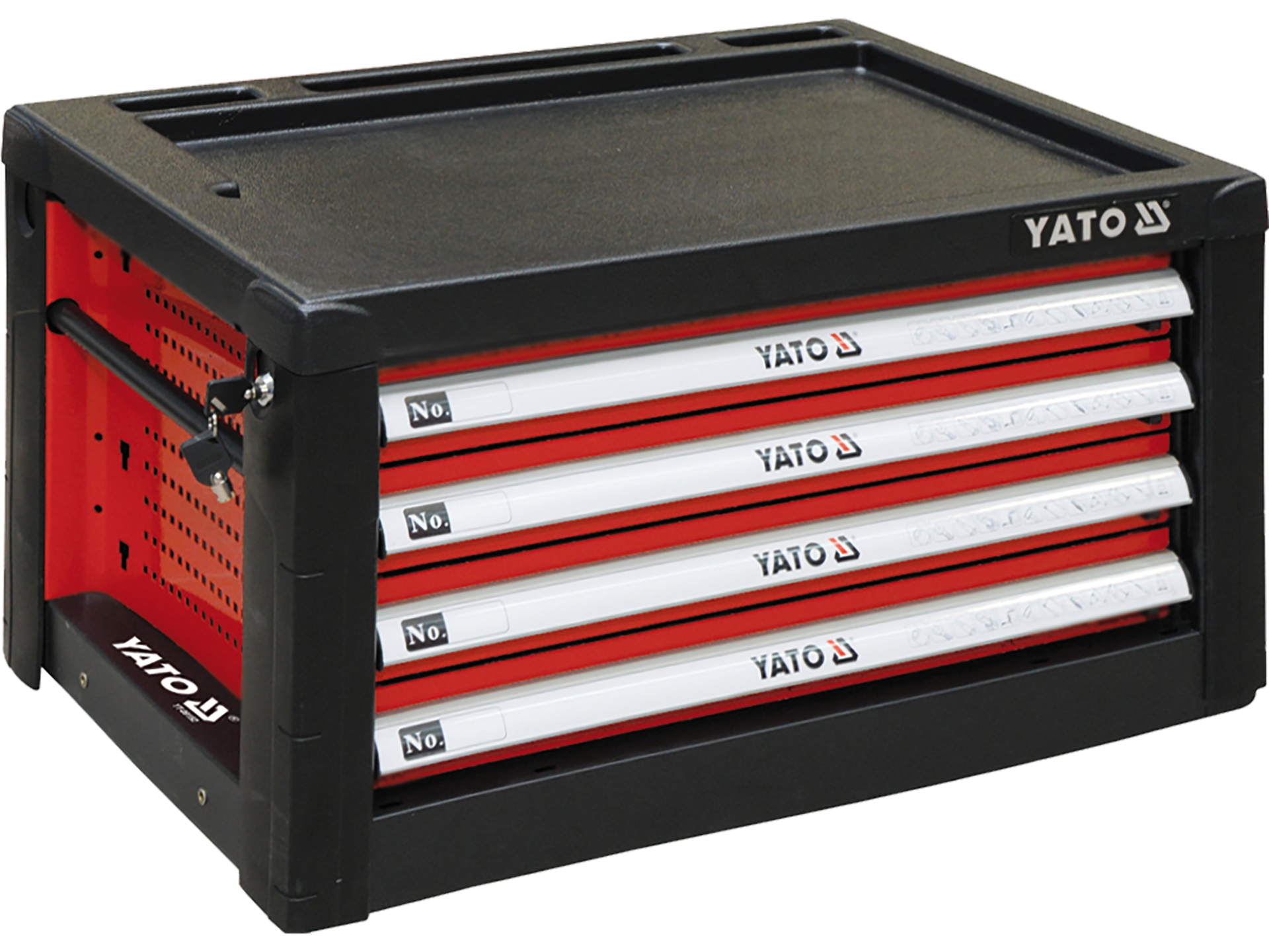 Szafka narzędziowa z czterema szufladami na prowadnicach kulkowych, wyposażona w centralny zamek i blat roboczy z tworzywa ABS. Konstrukcja stalowa malowana proszkowo zapewnia odporność na uszkodzenia mechaniczne w warunkach warsztatowych.