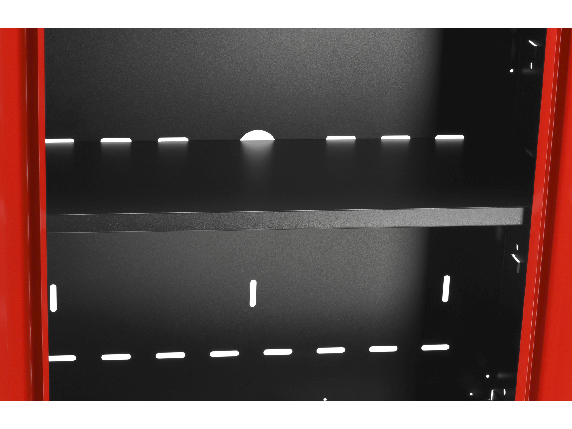 Dwuskrzydłowe drzwi otwierają się na całą szerokość szafki, zapewniając pełny dostęp do zawartości. Zamek cylindryczny z dwoma kluczami w zestawie zabezpiecza narzędzia przed dostępem osób nieupoważnionych – istotne w warsztatach wielostanowiskowych i przestrzeniach współdzielonych.