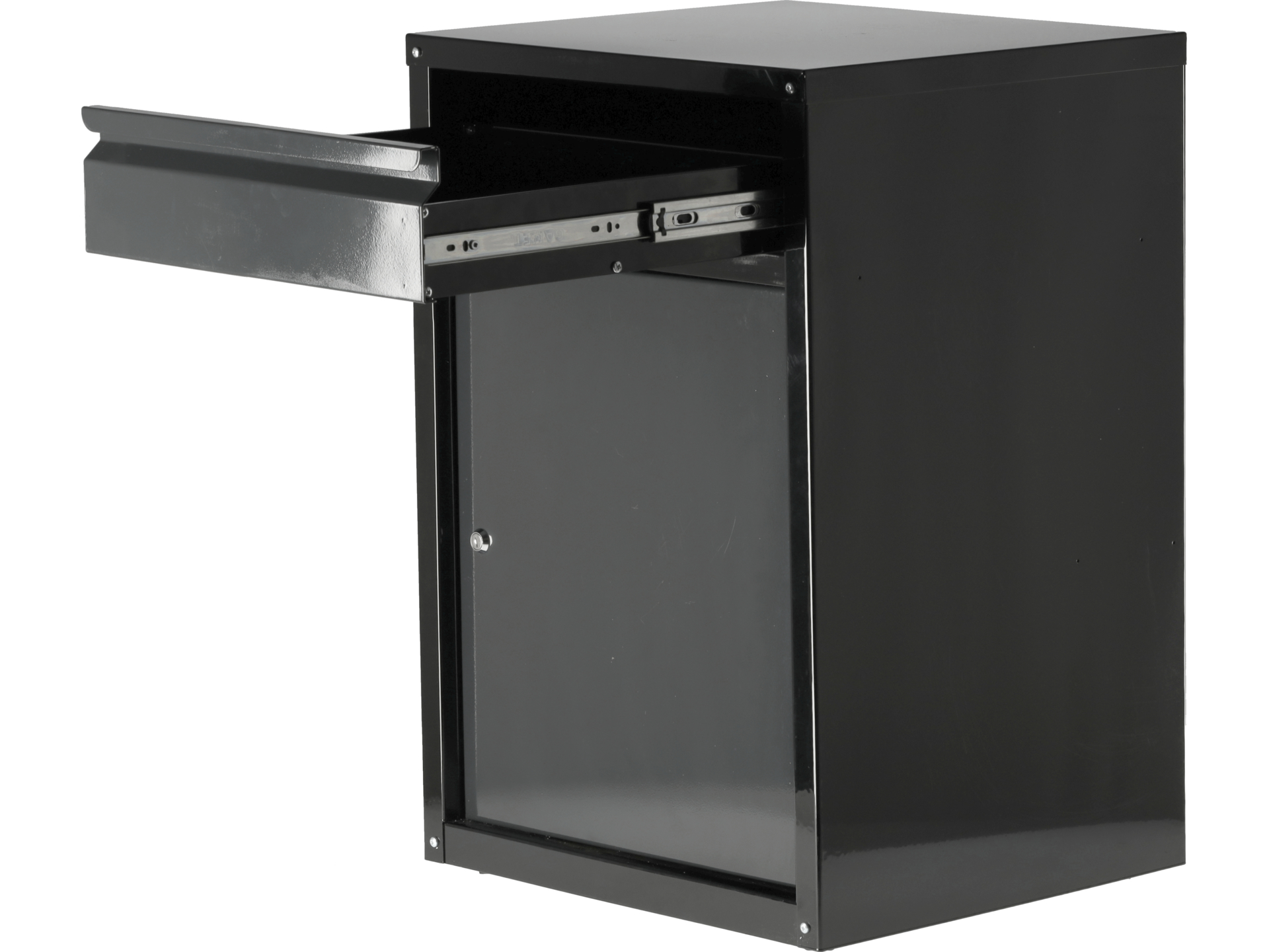 Metalowa szafka narzędziowa o konstrukcji stalowej z jedną szufladą na prowadnicach kulkowych oraz zamykaną częścią z drzwiczkami. Rozwiązanie do organizacji przestrzeni warsztatowej w garażach, serwisach i pracowniach rzemieślniczych.