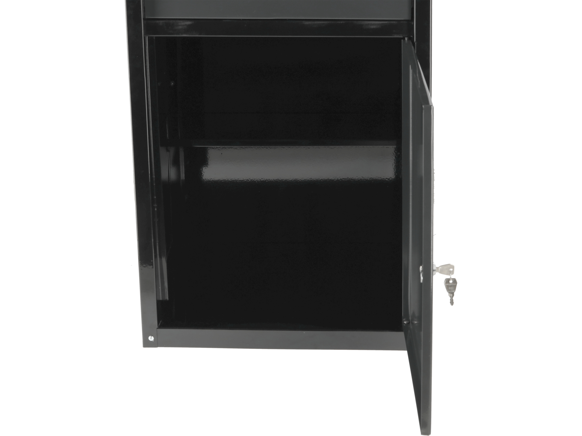 Przestrzeń za drzwiczkami o wysokości wewnętrznej 565 mm umożliwia pionowe przechowywanie dłuższych przedmiotów. Zamek na kluczyk zabezpiecza przed dostępem osób nieupoważnionych. Rozwiązanie przydatne w przestrzeniach współdzielonych lub otwartych warsztatach.