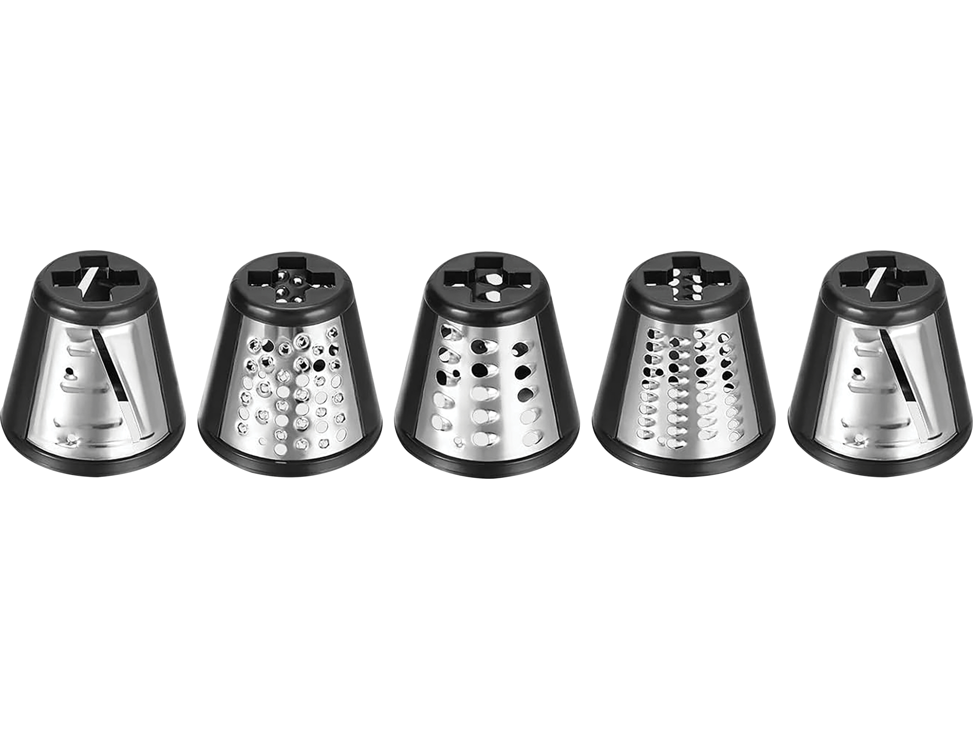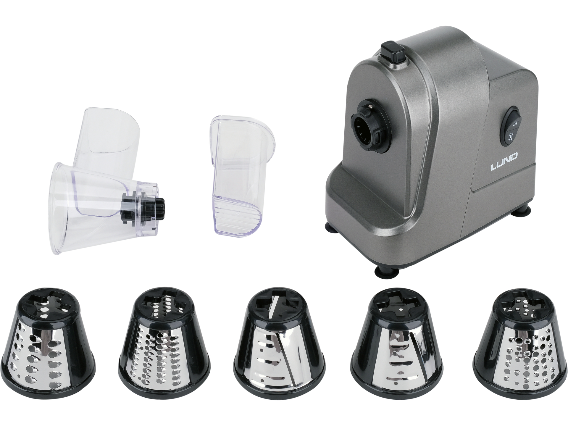 Szatkownica elektryczna LUND z zestawem 5 tarek umożliwia przygotowanie różnych typów krojenia i tarcia produktów spożywczych: