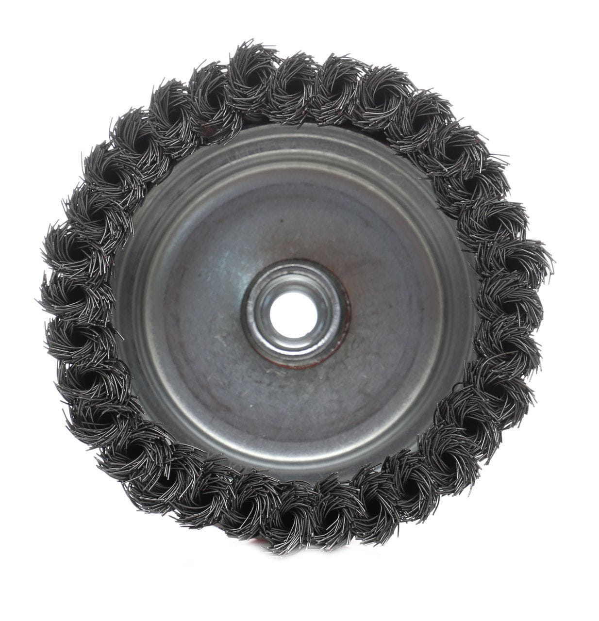 Metalowa opaska obejmująca podstawę drutu ogranicza rozrzut włókien przy wyższych obrotach i wydłuża żywotność szczotki. Bez opaski włókna mogą się stopniowo rozchodzić, co zmniejsza docisk roboczy i zwiększa ryzyko wyrwania się drutu.