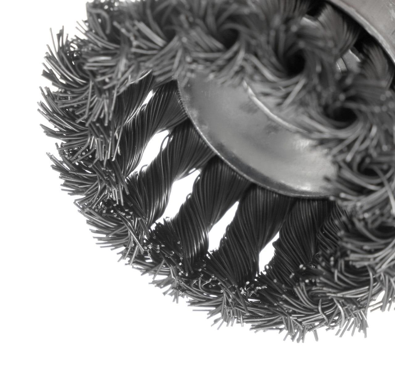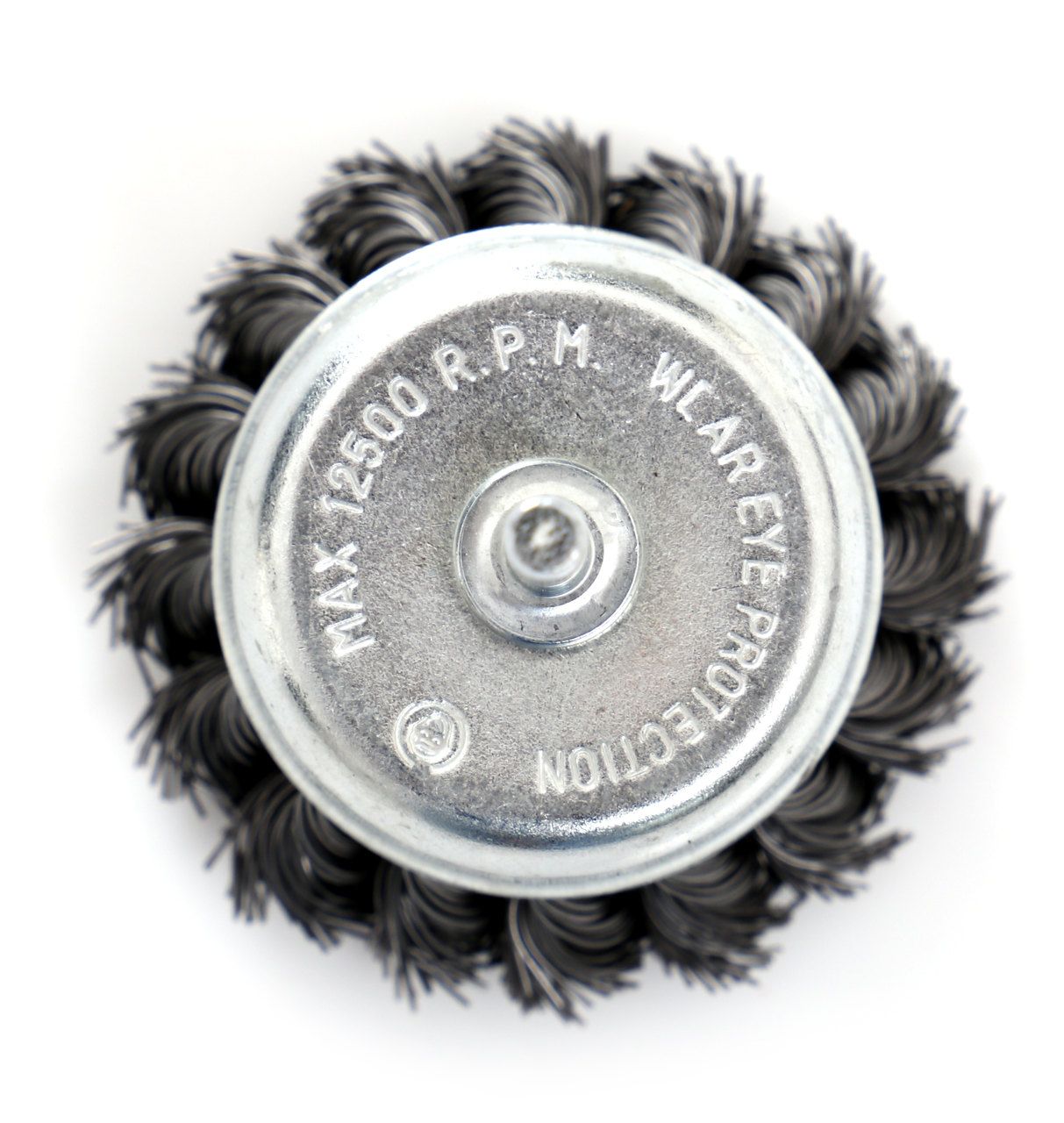 Szczotka czołowa pleciona z trzpieniem M6 przeznaczona do montażu w wiertarkach i wkrętarkach. Umożliwia mechaniczne czyszczenie, szlifowanie i przygotowanie powierzchni metalowych, drewnianych oraz betonowych na obszarze o średnicy 65 mm.