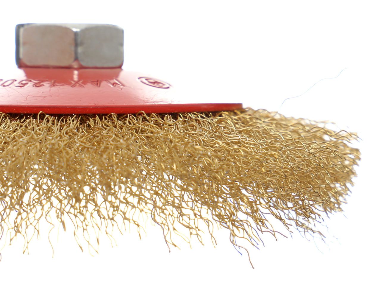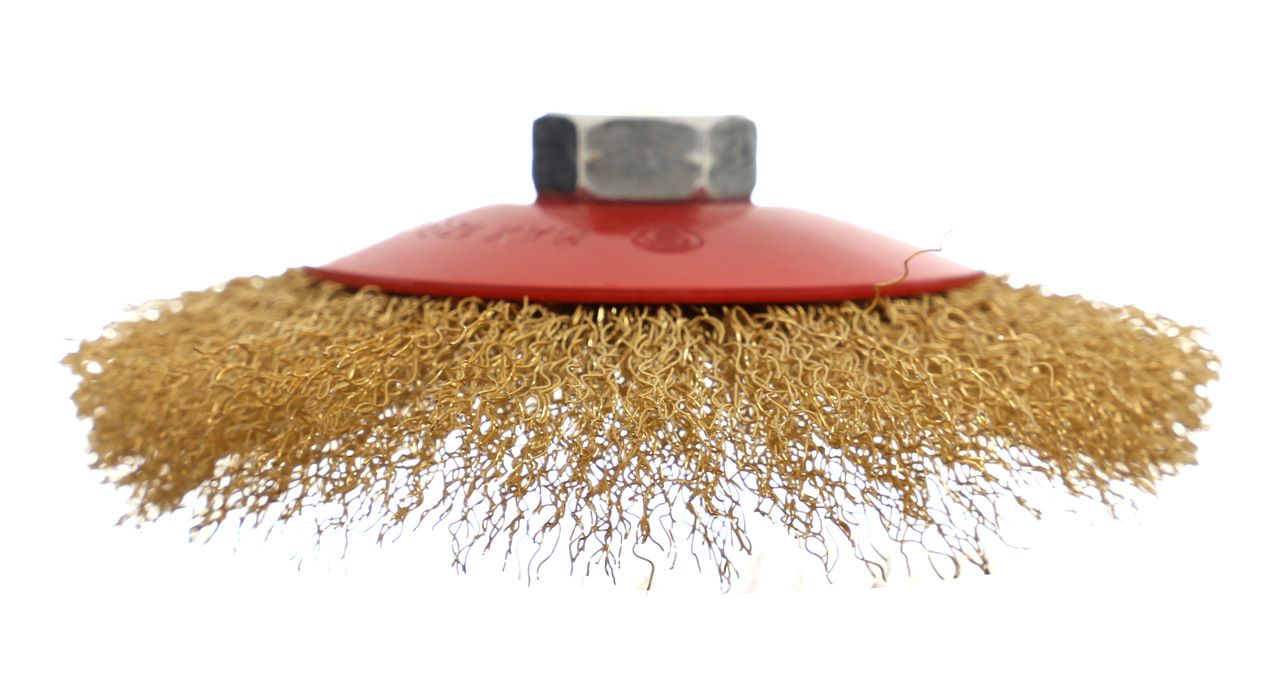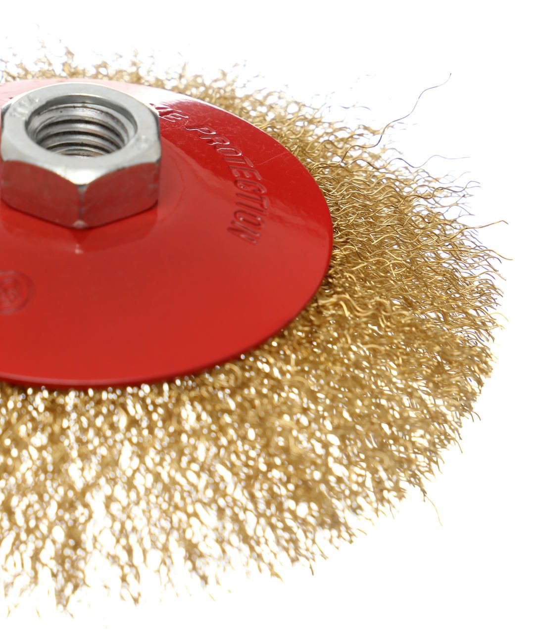 Szczotka druciana boczna z drutem mosiężnym przeznaczona do montażu w narzędziach obrotowych. Sprawdza się przy czyszczeniu i obróbce dużych powierzchni metalowych, betonowych i drewnianych — wszędzie tam, gdzie wymagane jest skuteczne usuwanie powłok, rdzy lub zanieczyszczeń bez ryzyka iskrzenia.
