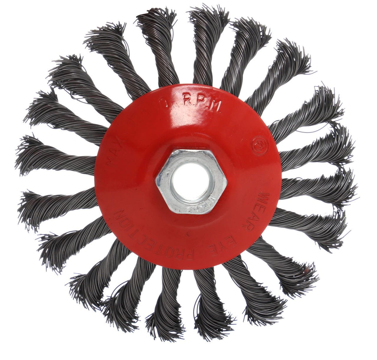 Drut w szczotce jest skręcany w wiązki — plecionka zwiększa sztywność włókien roboczych, co przekłada się na większą siłę nacisku na obrabianą powierzchnię i skuteczniejsze usuwanie twardych nawarstwień, rdzy oraz zgorzeliny.