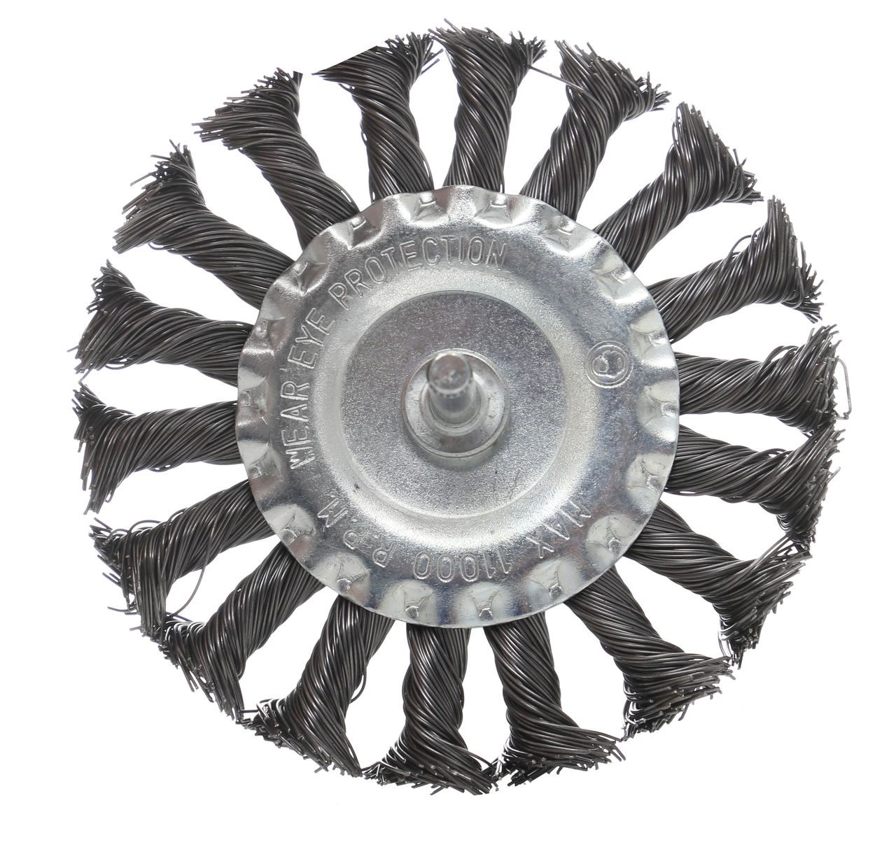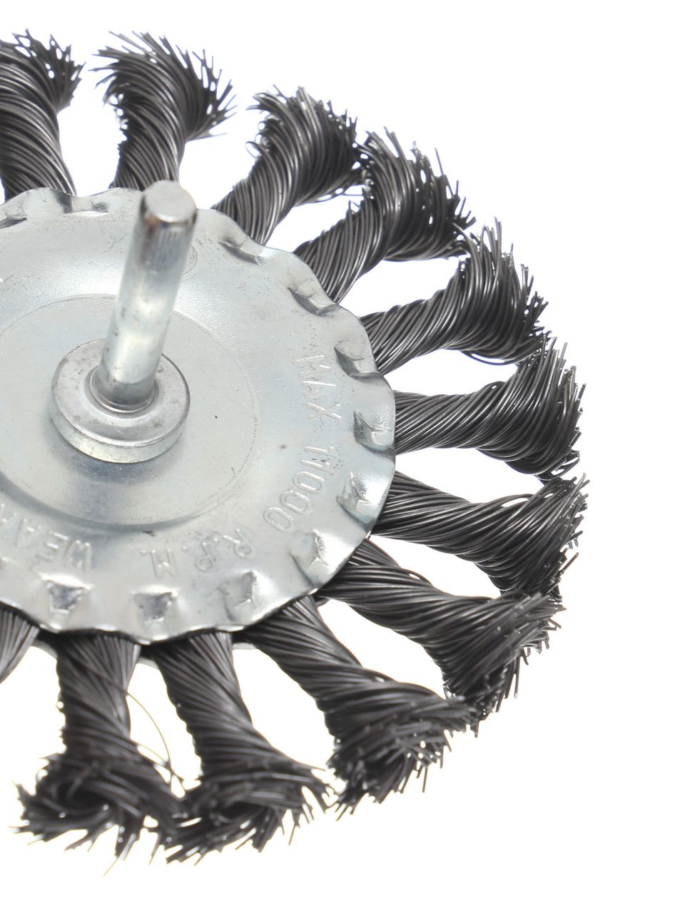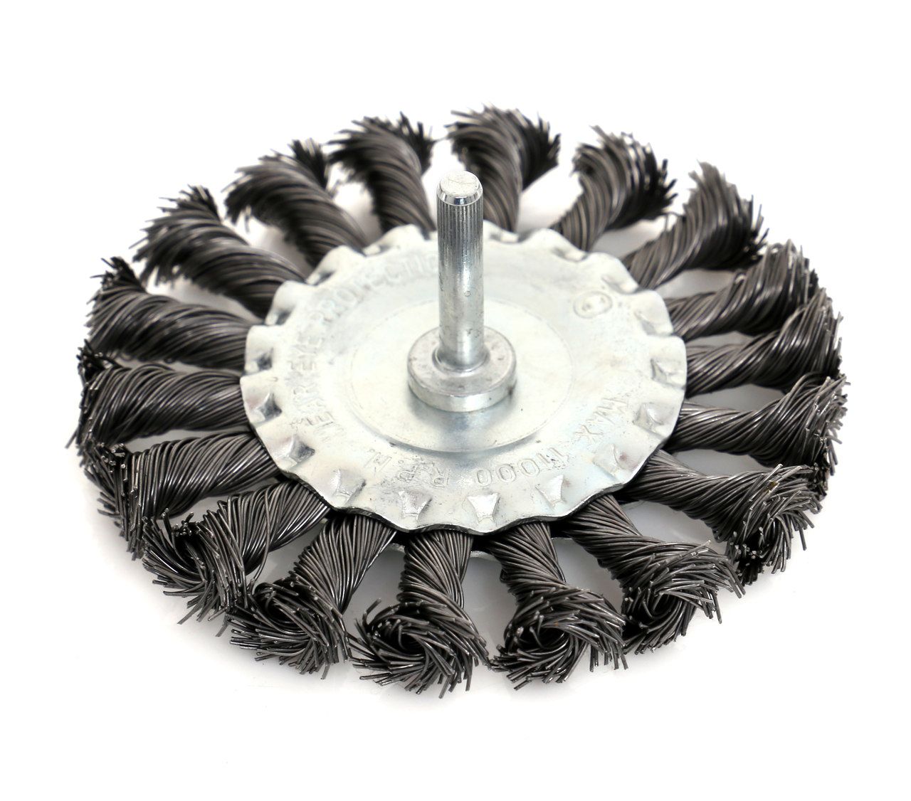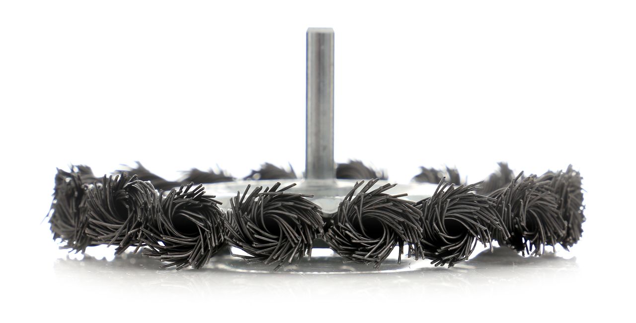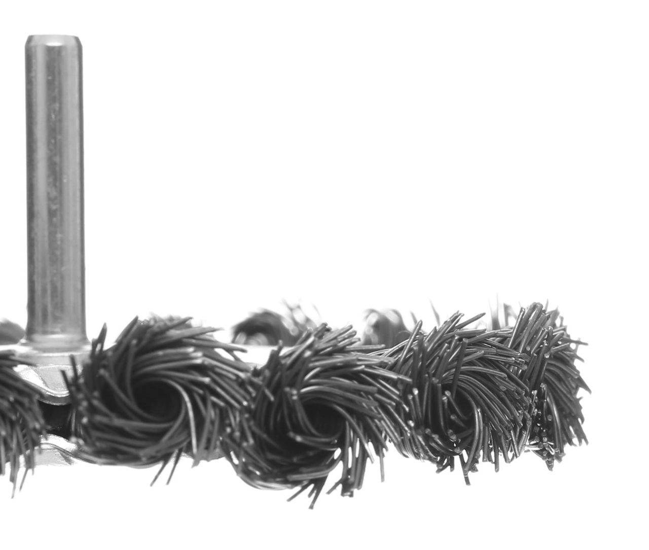 Gęsty drut w szczotce tarczowej plecionej z trzpieniem pomaga szybciej usuwać zabrudzenia i naloty, ograniczając liczbę przejść.