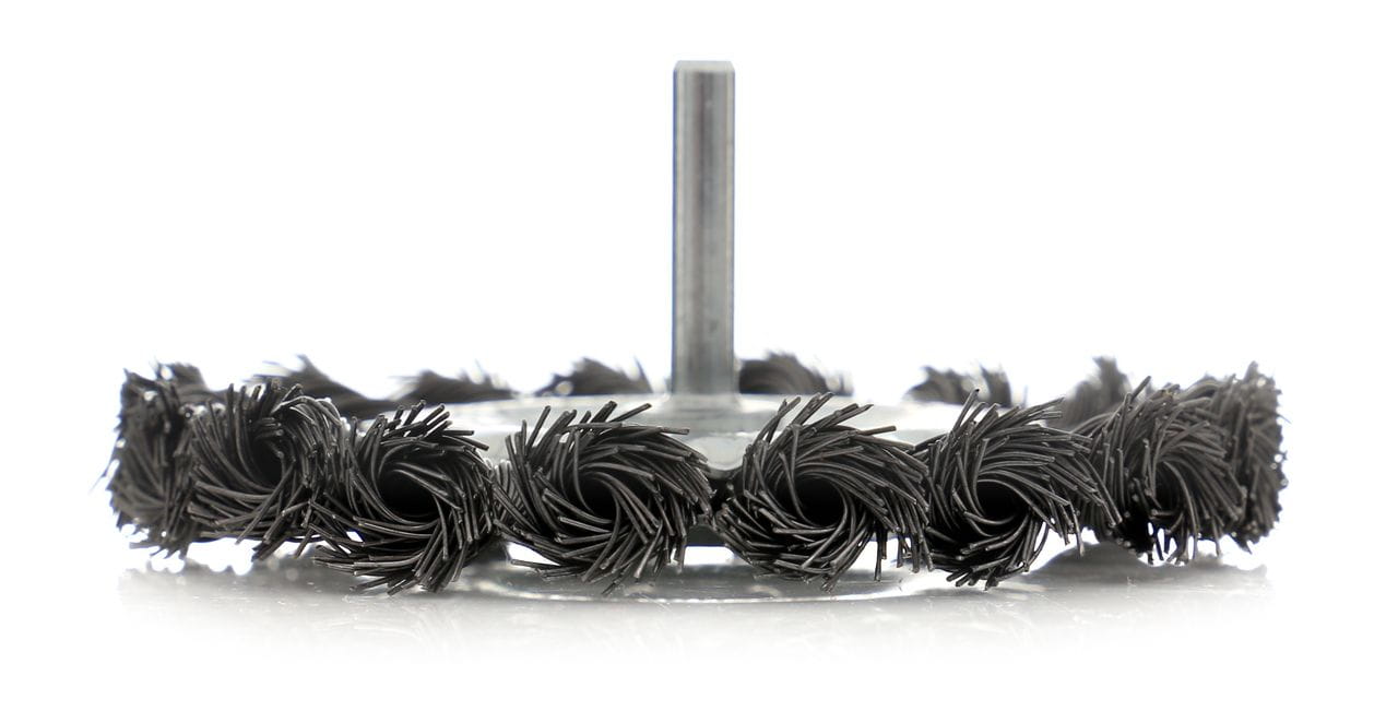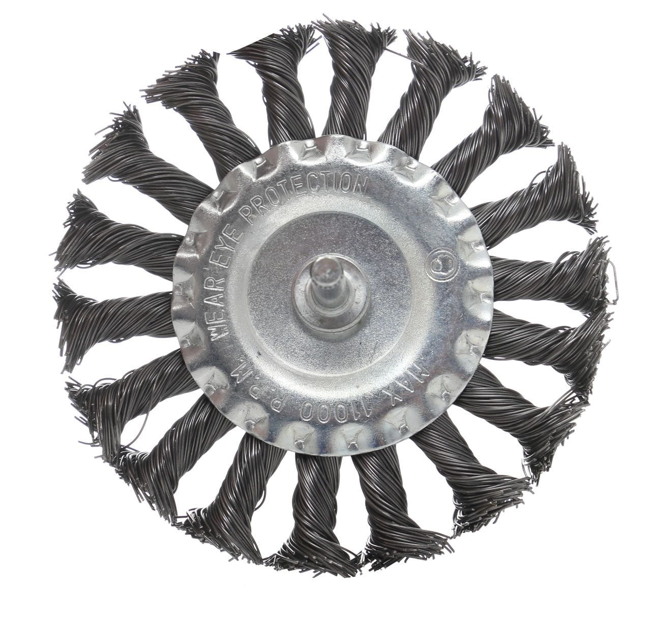 Szczotka tarczowa pleciona o średnicy 100 mm z trzpieniem M6, przeznaczona do mechanicznego czyszczenia powierzchni metalowych i drewnianych. Konstrukcja z gęsto plecionego drutu zapewnia równomierne przyleganie do obrabianej powierzchni i skuteczne usuwanie zanieczyszczeń.