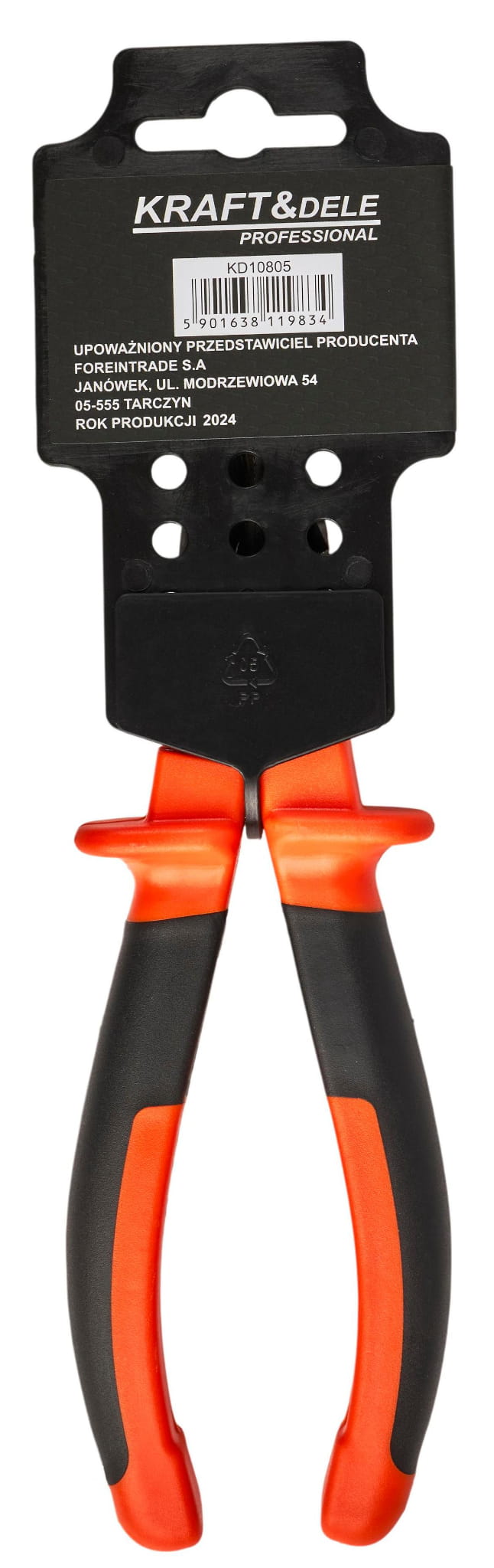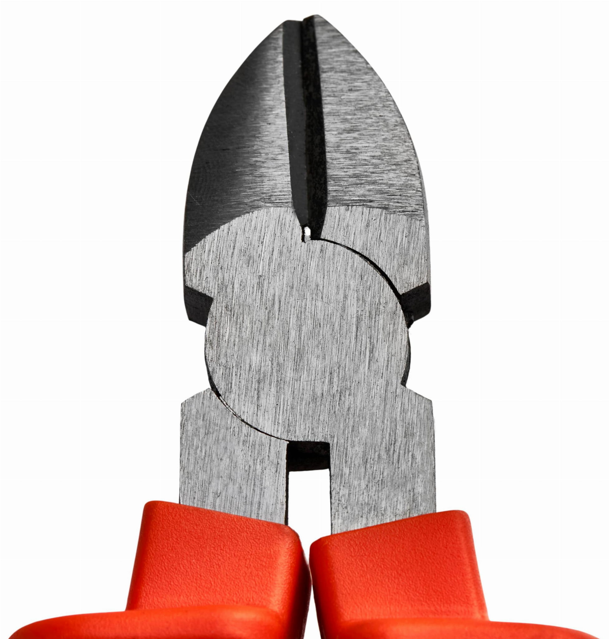 Szczypce tnące o długości 200 mm wykonane z hartowanej stali narzędziowej, przeznaczone do cięcia drutu, kabli oraz innych materiałów przewodzących i nieprzewodzących. Rękojeść pokryta gumą antypoślizgową zapewnia stabilny chwyt podczas pracy.