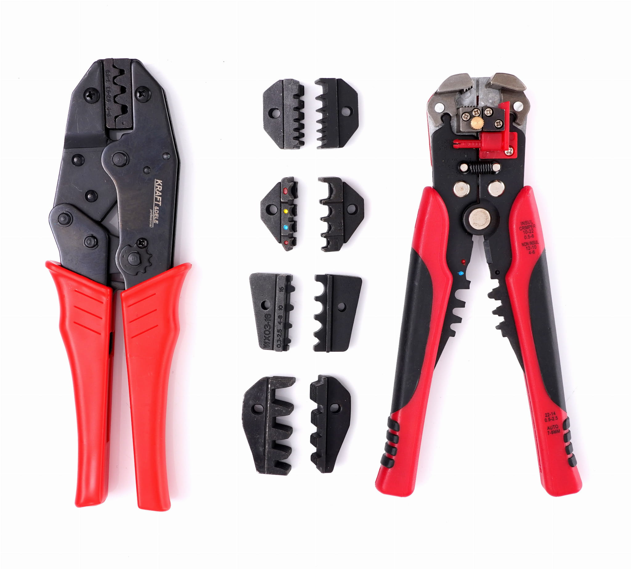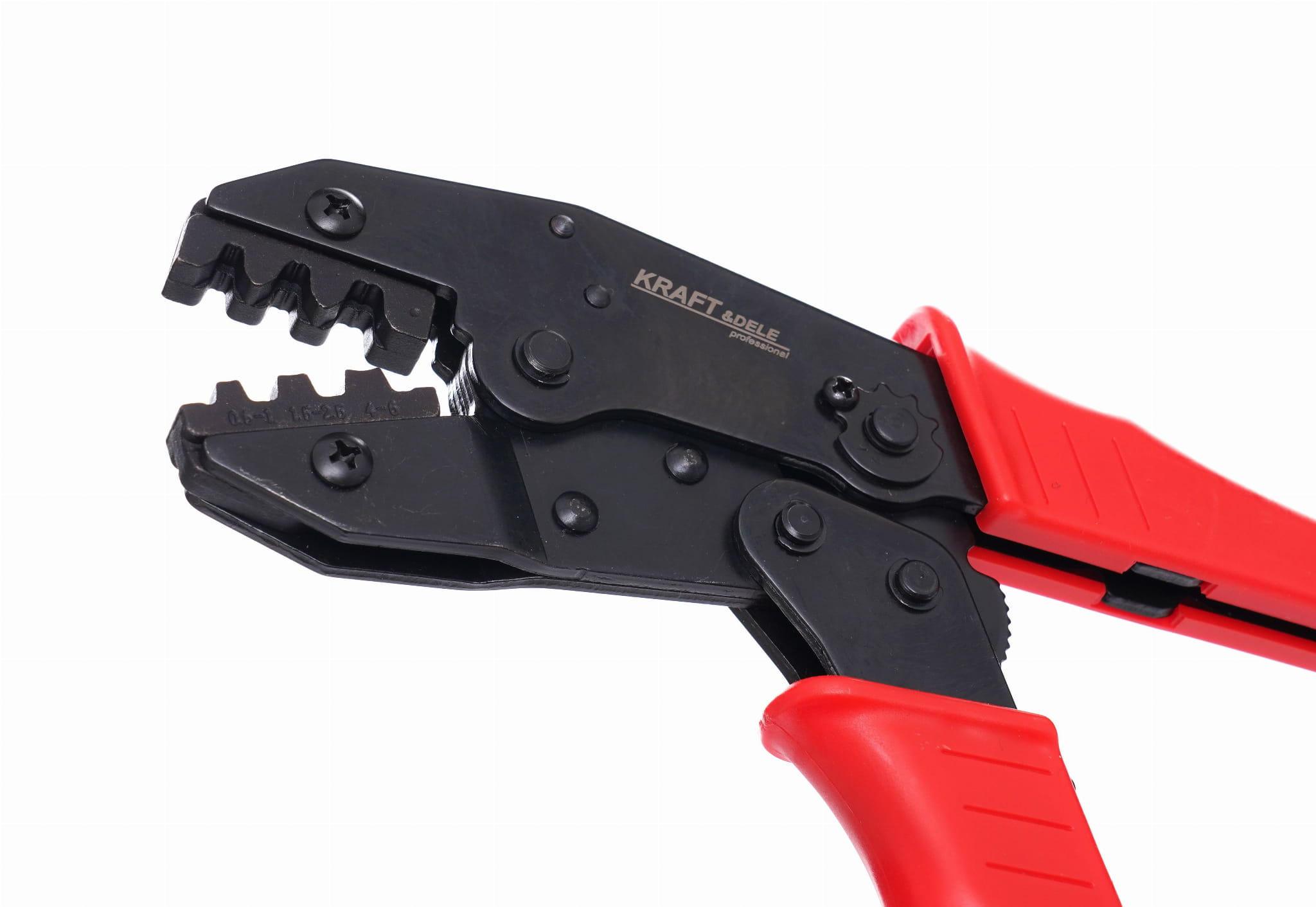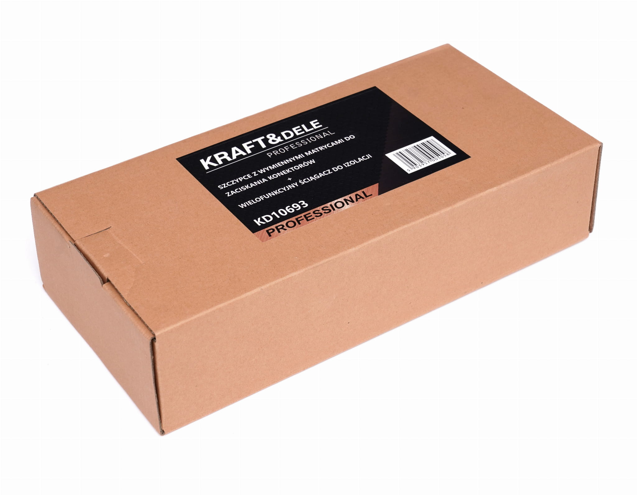 KD10693 to wielofunkcyjne szczypce zaciskowe przeznaczone do zaciskania końcówek konektorowych na przewodach elektrycznych. Narzędzie łączy trzy funkcje robocze — zaciskanie, cięcie i ściąganie izolacji — oraz jest wyposażone w pięć wymiennych matryc dostosowanych do różnych typów złączy elektrotechnicznych.