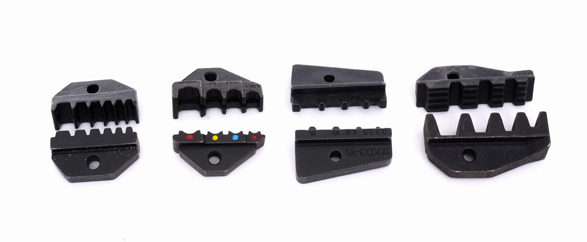 Zestaw obejmuje matryce dopasowane do pięciu rodzajów złączy elektrotechnicznych. Wymiana matrycy pozwala pracować z szerokim zakresem końcówek bez potrzeby posiadania osobnych narzędzi dla każdego typu złącza.