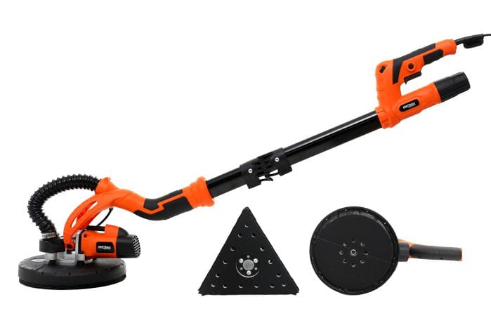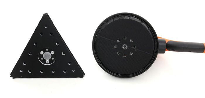 Okrągła głowica o średnicy 215/225 mm sprawdza się na otwartych powierzchniach ścian i sufitów. Trójkątna głowica umożliwia pracę w narożnikach i przy listwach, gdzie okrągły pad nie dociera.