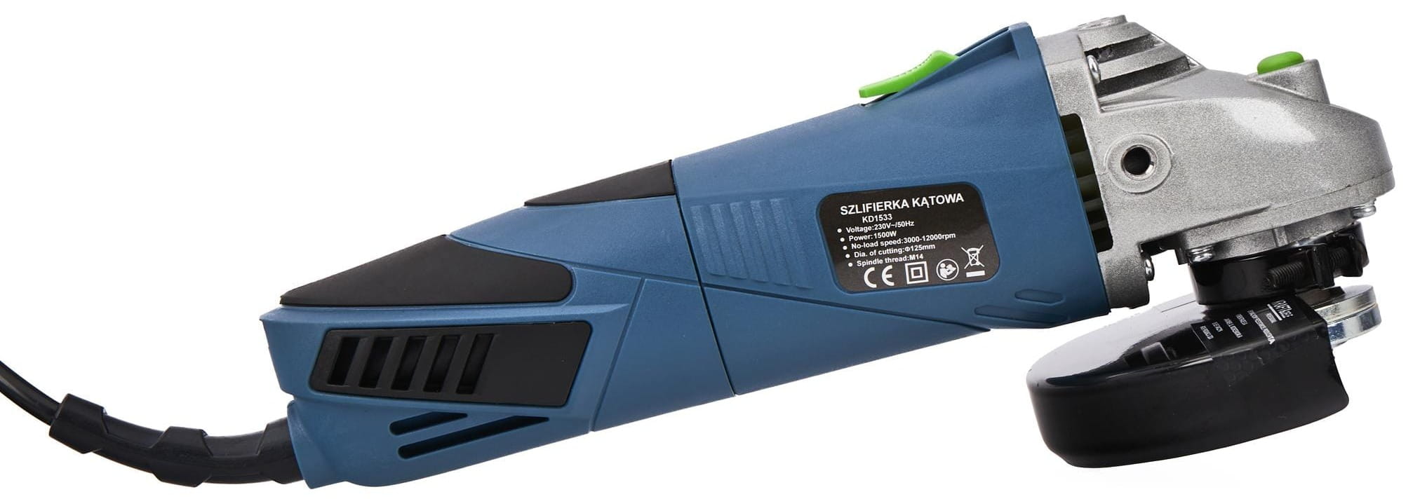 Blokada wrzeciona umożliwia pewne unieruchomienie wału podczas wymiany tarczy bez konieczności użycia dodatkowych narzędzi. Blokada włącznika pozwala utrzymać ciągłą pracę urządzenia bez konieczności trzymania przycisku, co odciąża rękę przy dłuższych zadaniach.