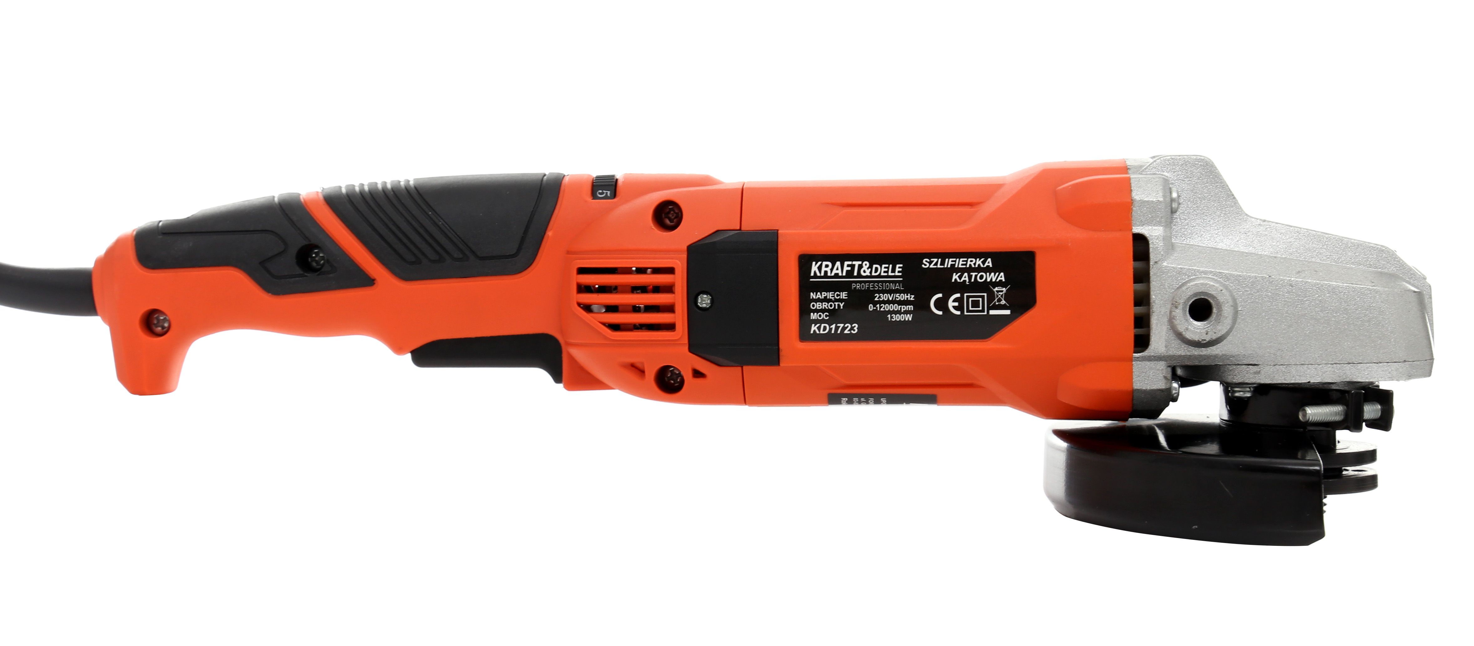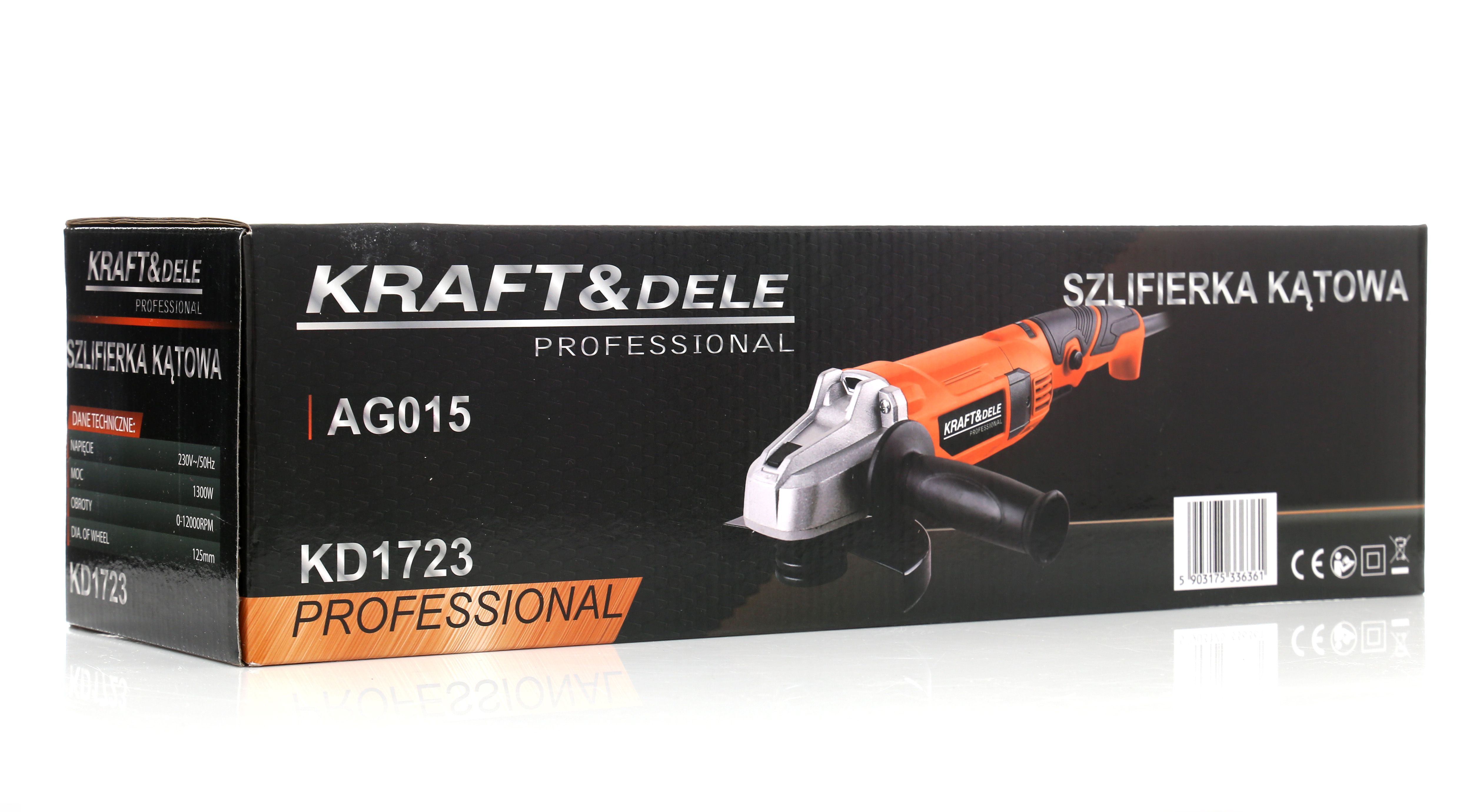SZLIFIERKA KĄTOWA 1300W KD1723 / KD1723 / KRAFT&DELE to solidna szlifierka kątowa do cięcia i szlifowania w warsztacie, garażu i na budowie. Model KD1723 łączy moc 1300W, prędkość 12000 obr/min oraz obsługę tarcz 125mm, co ułatwia dopasowanie narzędzia do codziennych zadań.