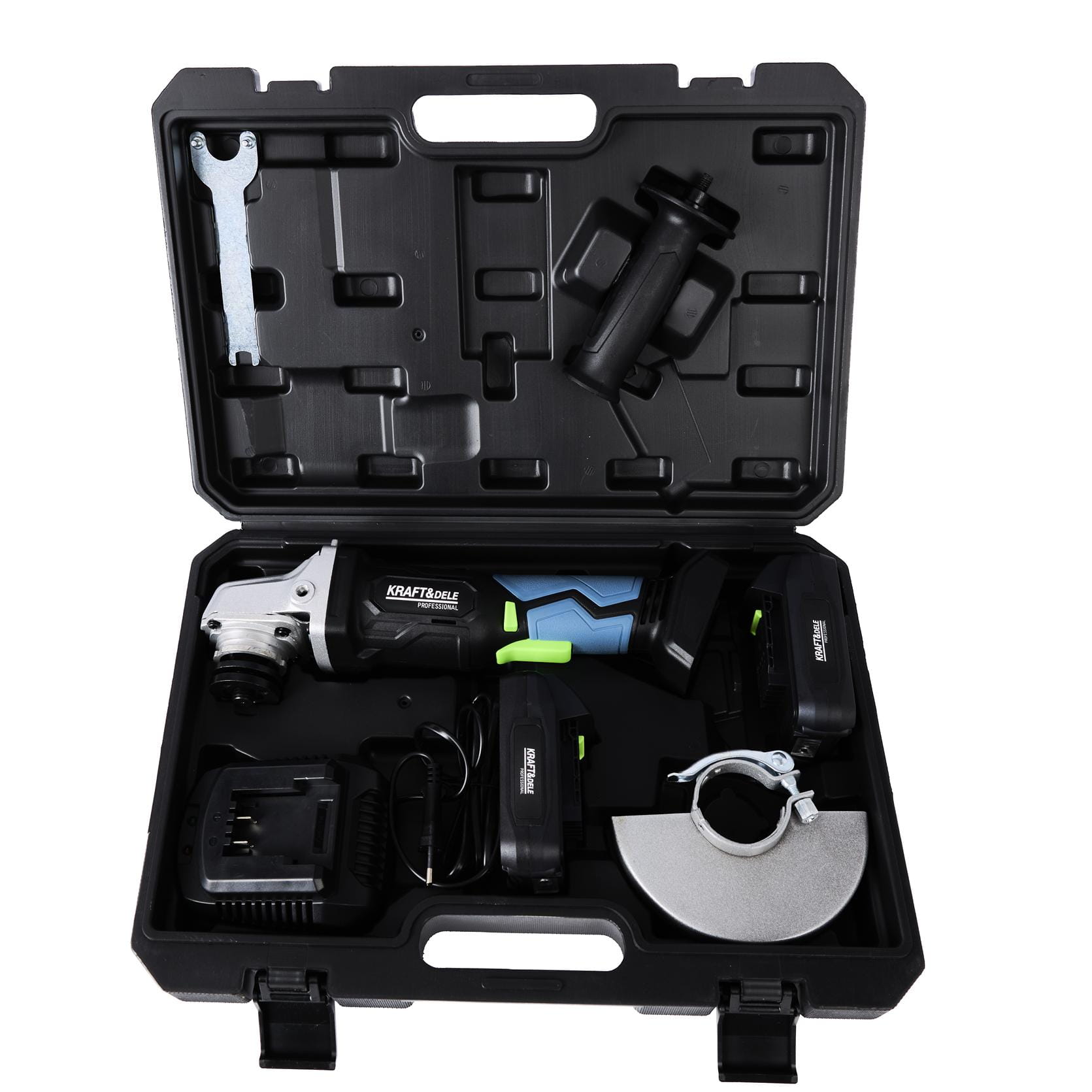 Akumulatorowa szlifierka kątowa Kraft&Dele KD3405 to urządzenie zasilane napięciem 21V, przeznaczone do cięcia, szlifowania i polerowania różnych materiałów budowlanych i wykończeniowych. Zestaw zawiera dwa akumulatory litowo-jonowe 3000mAh, ładowarkę oraz walizkę transportową, co umożliwia ciągłą pracę bez przerw na ładowanie.