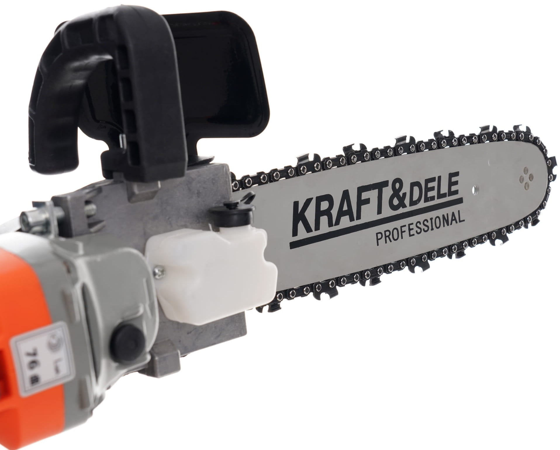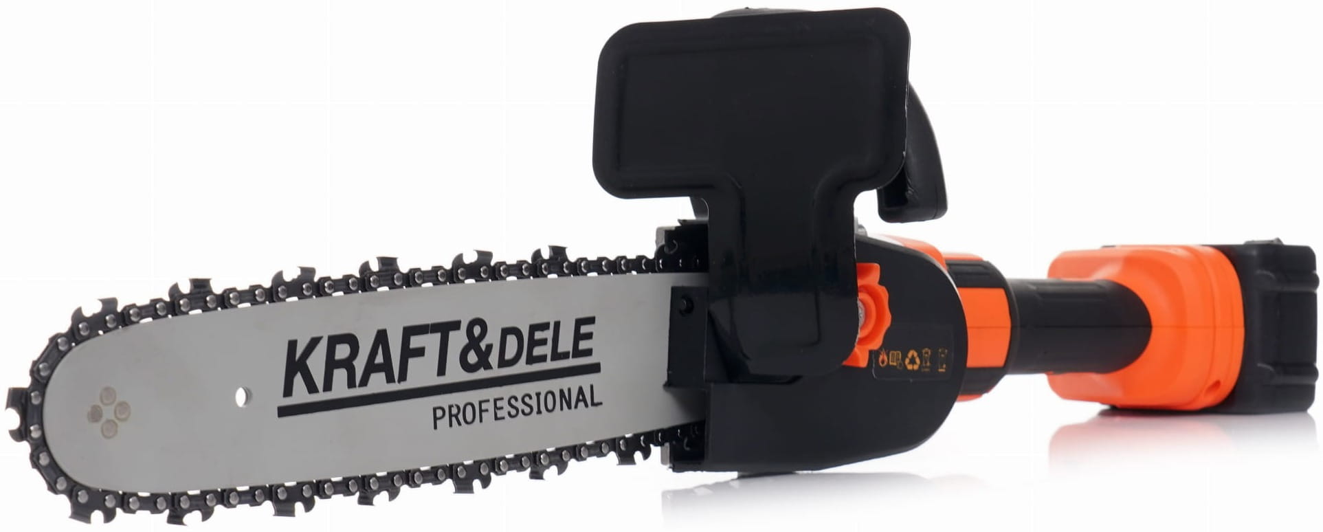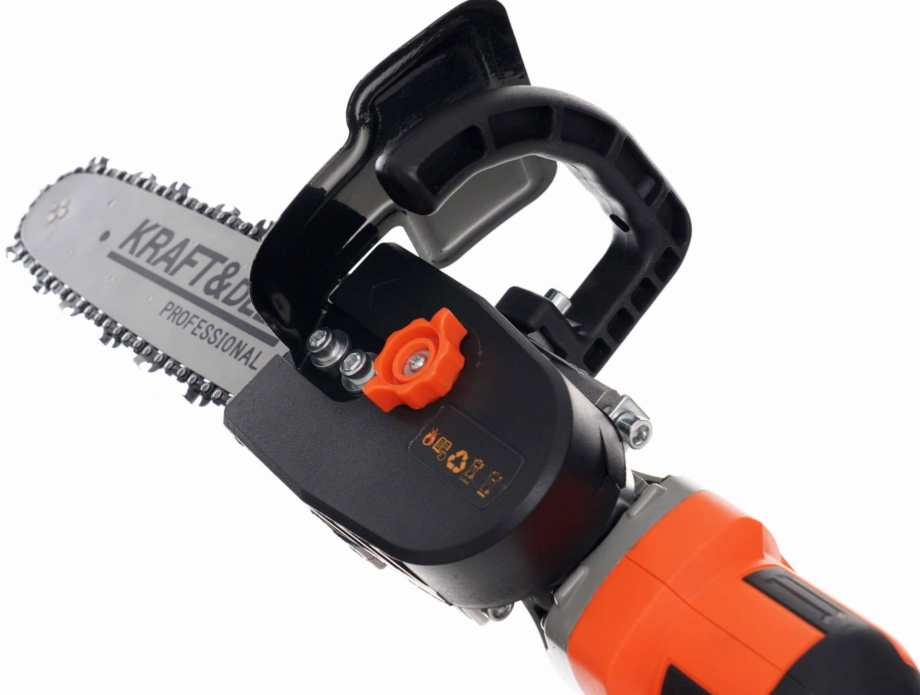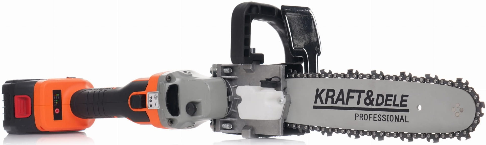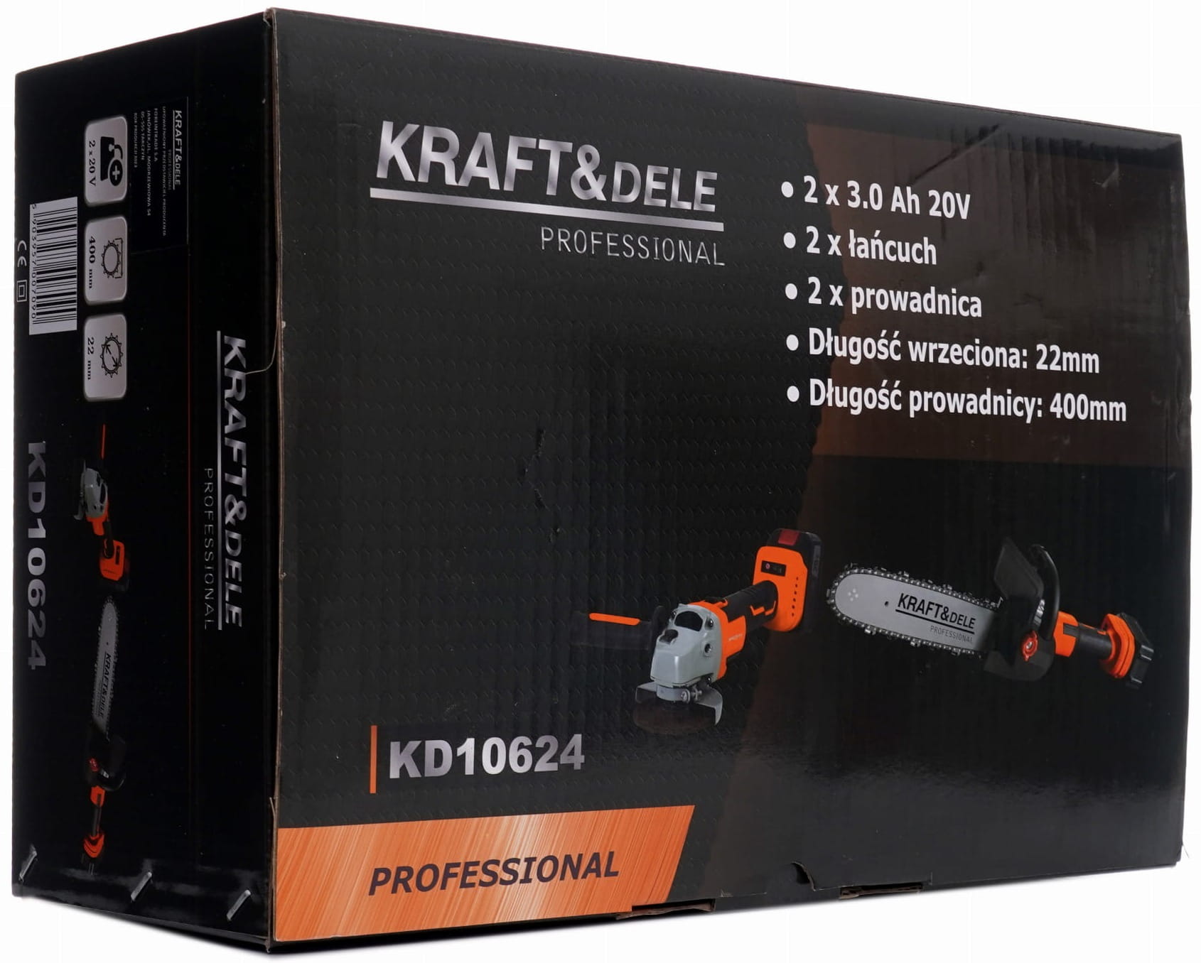 KD10624 to zestaw narzędziowy łączący akumulatorową szlifierkę kątową z adapterem piły łańcuchowej. Silnik bezszczotkowy pracuje na napięciu 20V, a dwa akumulatory o pojemności 3,0 Ah każdy zapewniają ciągłość pracy bez dostępu do sieci elektrycznej. Prowadnica o długości 400 mm i średnica wrzeciona 22 mm określają zakres możliwych zastosowań obydwu funkcji narzędzia.