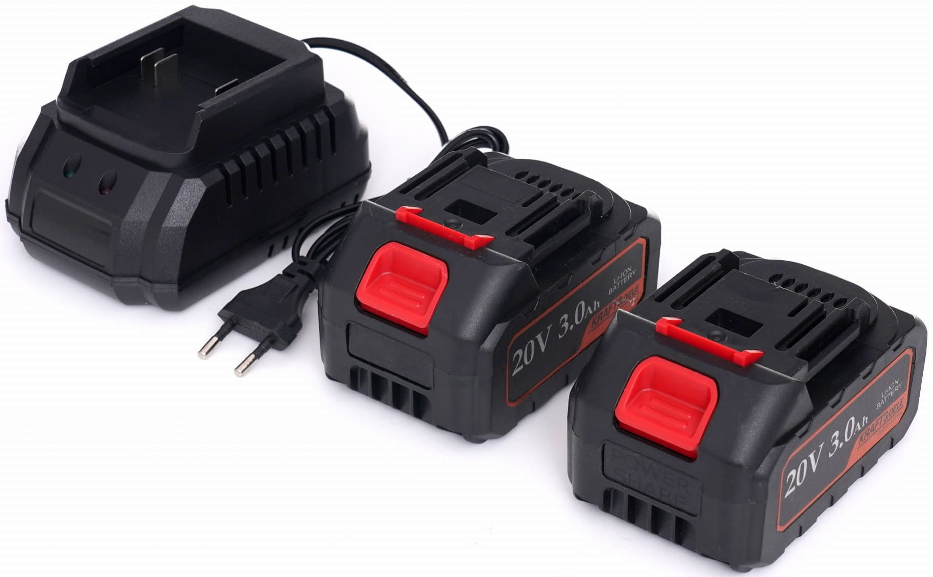 Zestaw zawiera dwa akumulatory, co umożliwia pracę naprzemienną — gdy jeden jest w użyciu, drugi można ładować. Pojemność 3,0 Ah przy napięciu 20V oznacza energię 60 Wh na ogniwo, co przy silniku bezszczotkowym przekłada się na wydłużony czas pracy w porównaniu z akumulatorami o niższej pojemności.