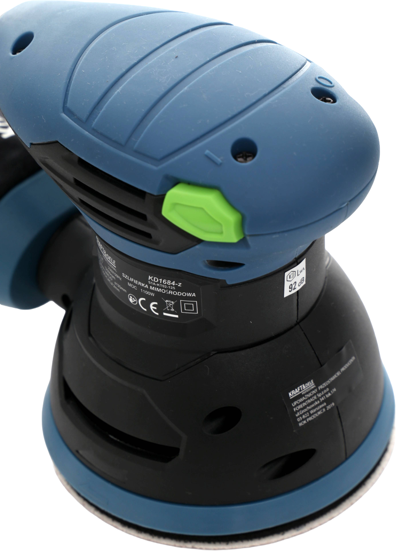 Silnik o mocy 1100W zapewnia stabilne obroty nawet przy zwiększonym nacisku na materiał. Mechanizm mimośrodowy (ekscentryczny) powoduje, że tarcza wykonuje jednocześnie ruch obrotowy i oscylacyjny — efektem jest powierzchnia pozbawiona śladów szlifowania widocznych przy szlifierkach jednotarczowych.