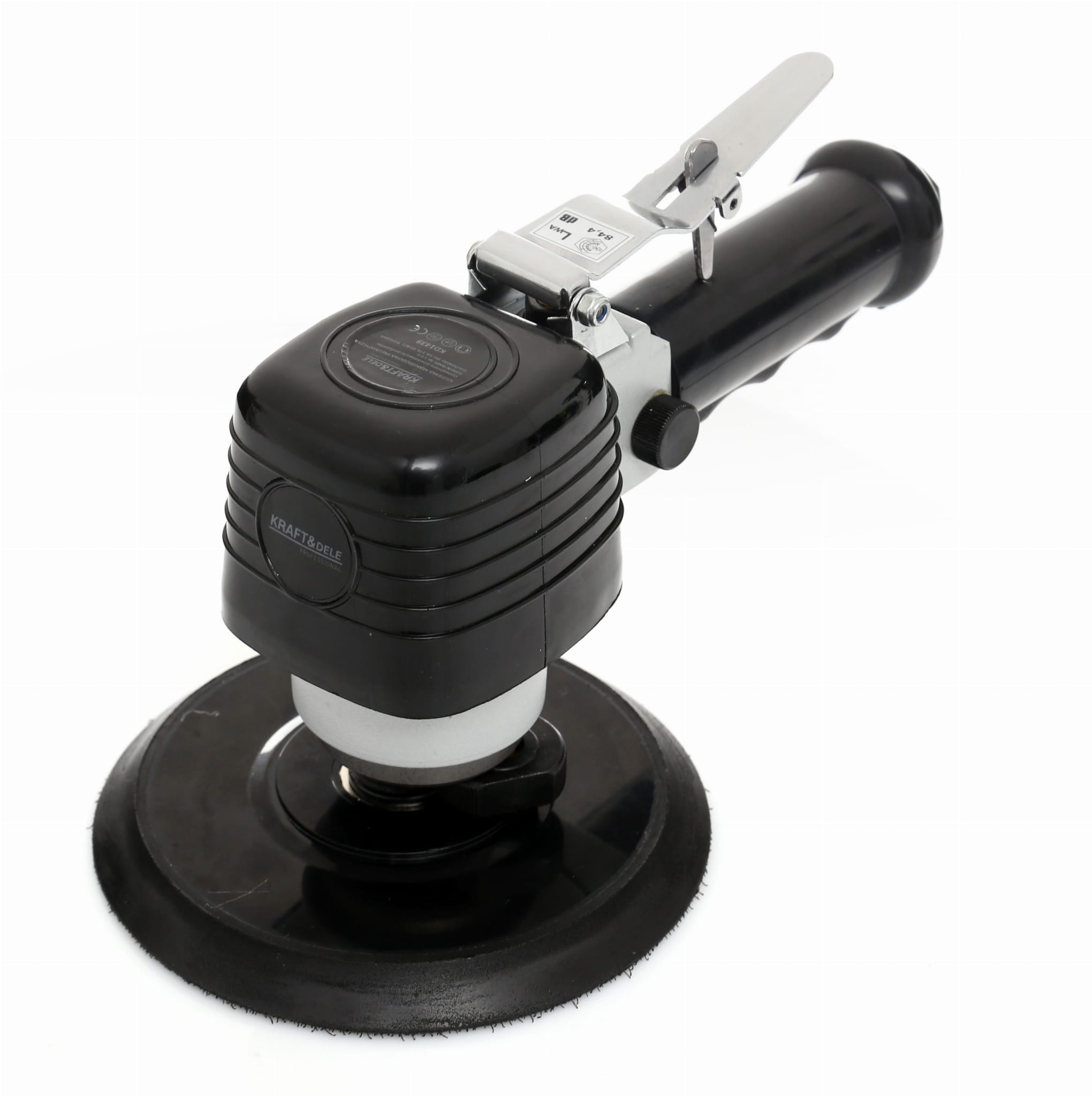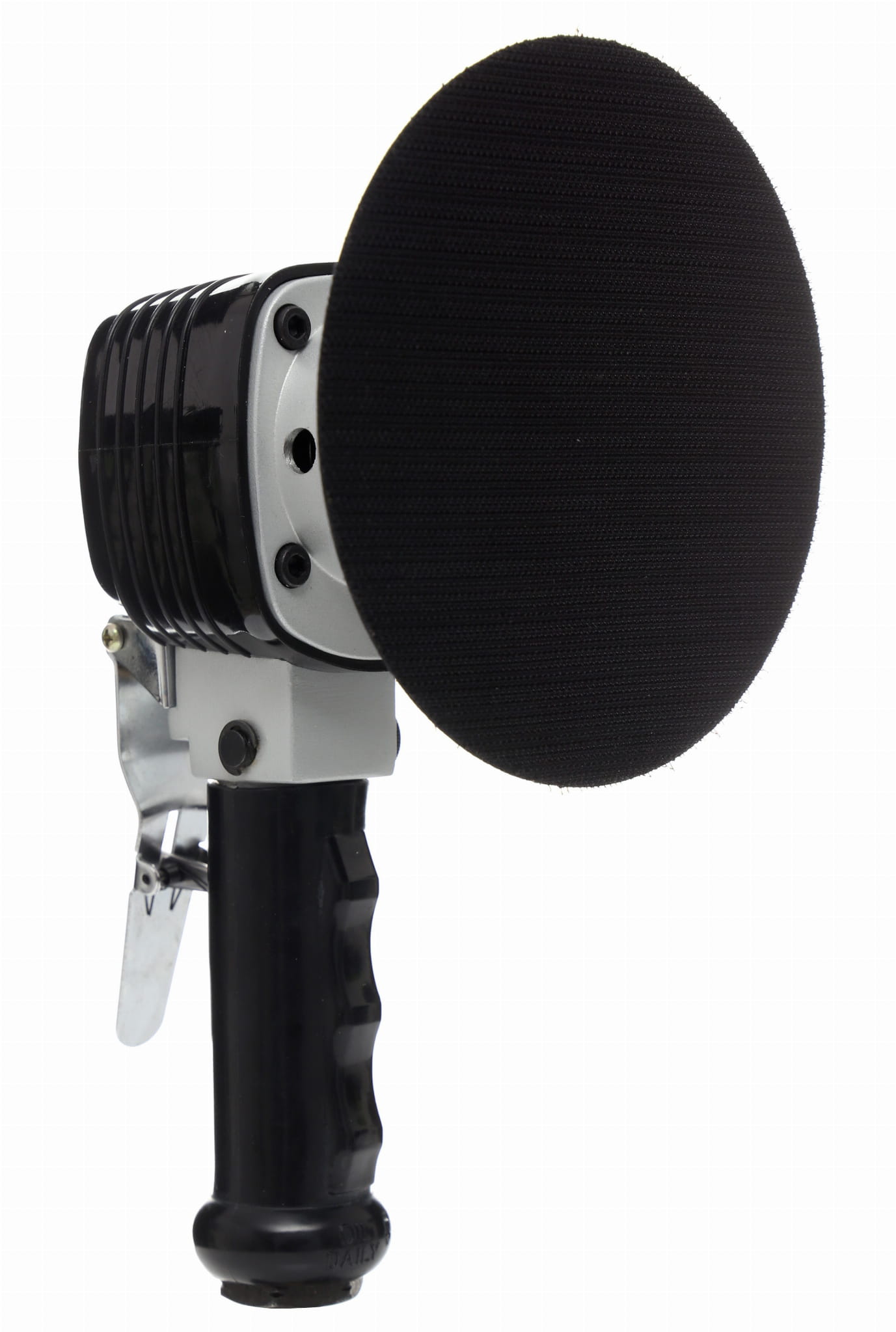 Przed podłączeniem do instalacji pneumatycznej należy sprawdzić, czy ciśnienie w sieci nie przekracza 6,3 bar — wyższe ciśnienie może uszkodzić mechanizm narzędzia. Zaleca się stosowanie filtroodwadniacza z filtrem powietrza na wlocie, który chroni mechanizm przed wilgocią i zanieczyszczeniami ze sprężarki. Regularne smarowanie mechanizmu wewnętrznego (kilka kropel oleju do narzędzi pneumatycznych przez wlot powietrza przed każdą sesją roboczą) przedłuża żywotność urządzenia. Tarcze szlifujące mocowane są na podkładce 150 mm z systemem rzepowym (Velcro) — należy stosować krążki z tym samym systemem mocowania.