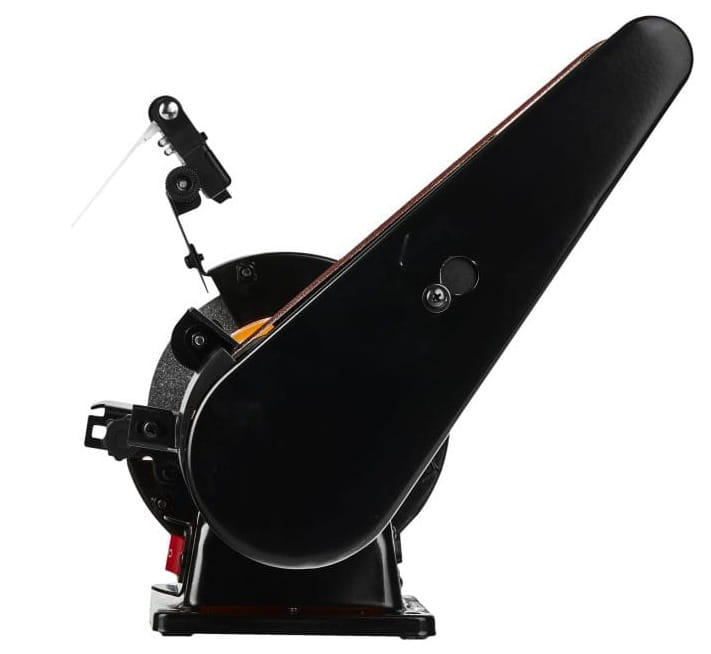 Tarcza szlifierska (150x20 mm) służy do ostrzenia, profilowania i szlifowania punktowego. Taśma szlifierska (50x686 mm) umożliwia szlifowanie płaskie i wykańczanie powierzchni na większej długości roboczej. Połączenie obu modułów eliminuje konieczność posiadania dwóch osobnych urządzeń.