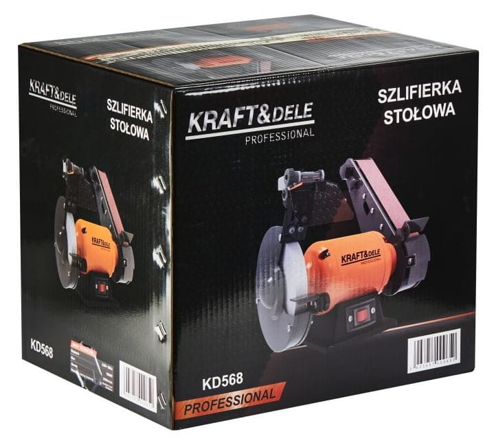 KD568 to stacjonarne urządzenie szlifierskie z napędem 1800W, łączące w jednej konstrukcji tarczę szlifierską (150x20 mm) oraz taśmę szlifierską (50x686 mm). Przeznaczone do szlifowania, ostrzenia i czyszczenia narzędzi metalowych oraz elementów ze stali w warunkach warsztatowych — praca wyłącznie na sucho.