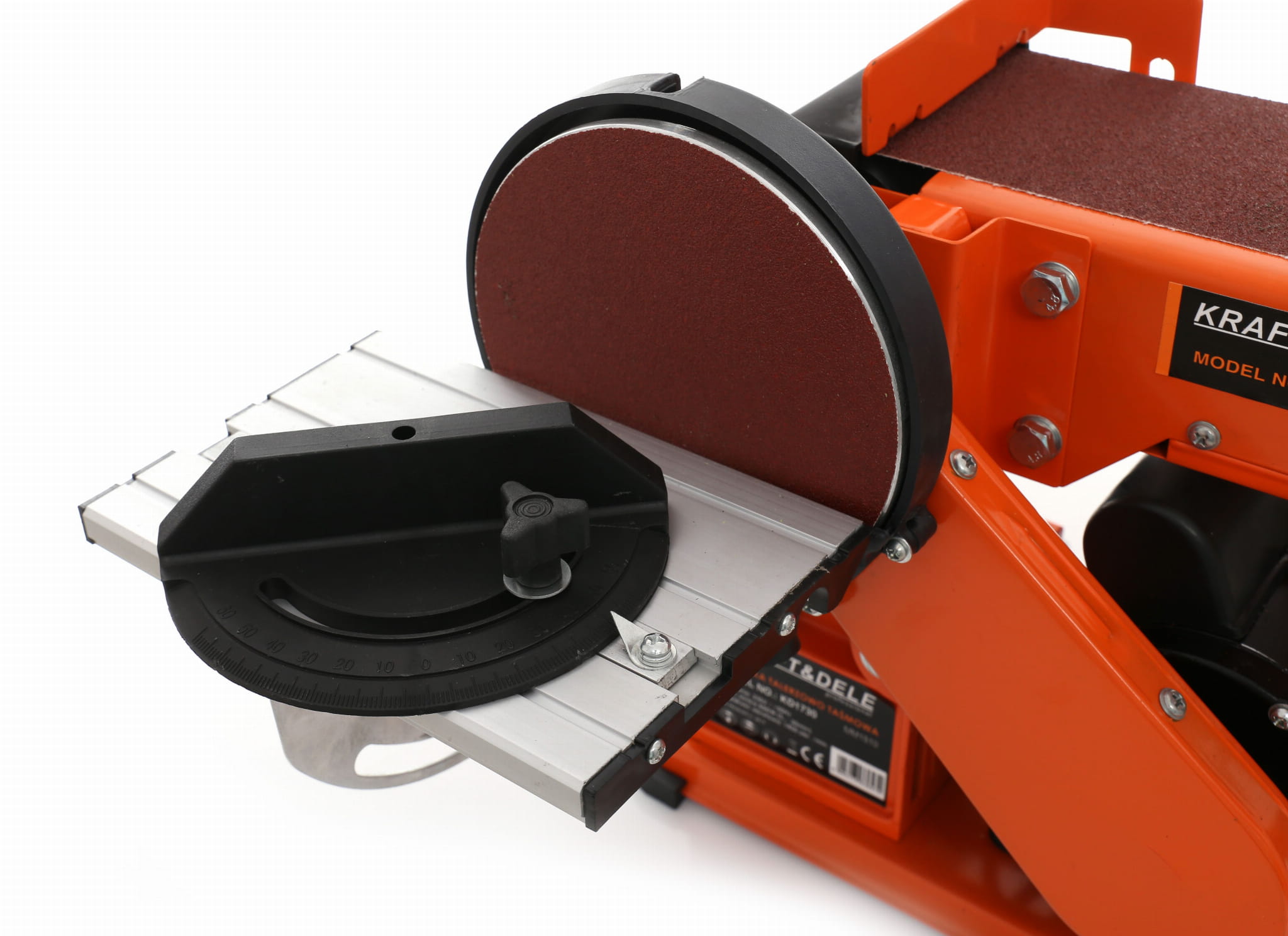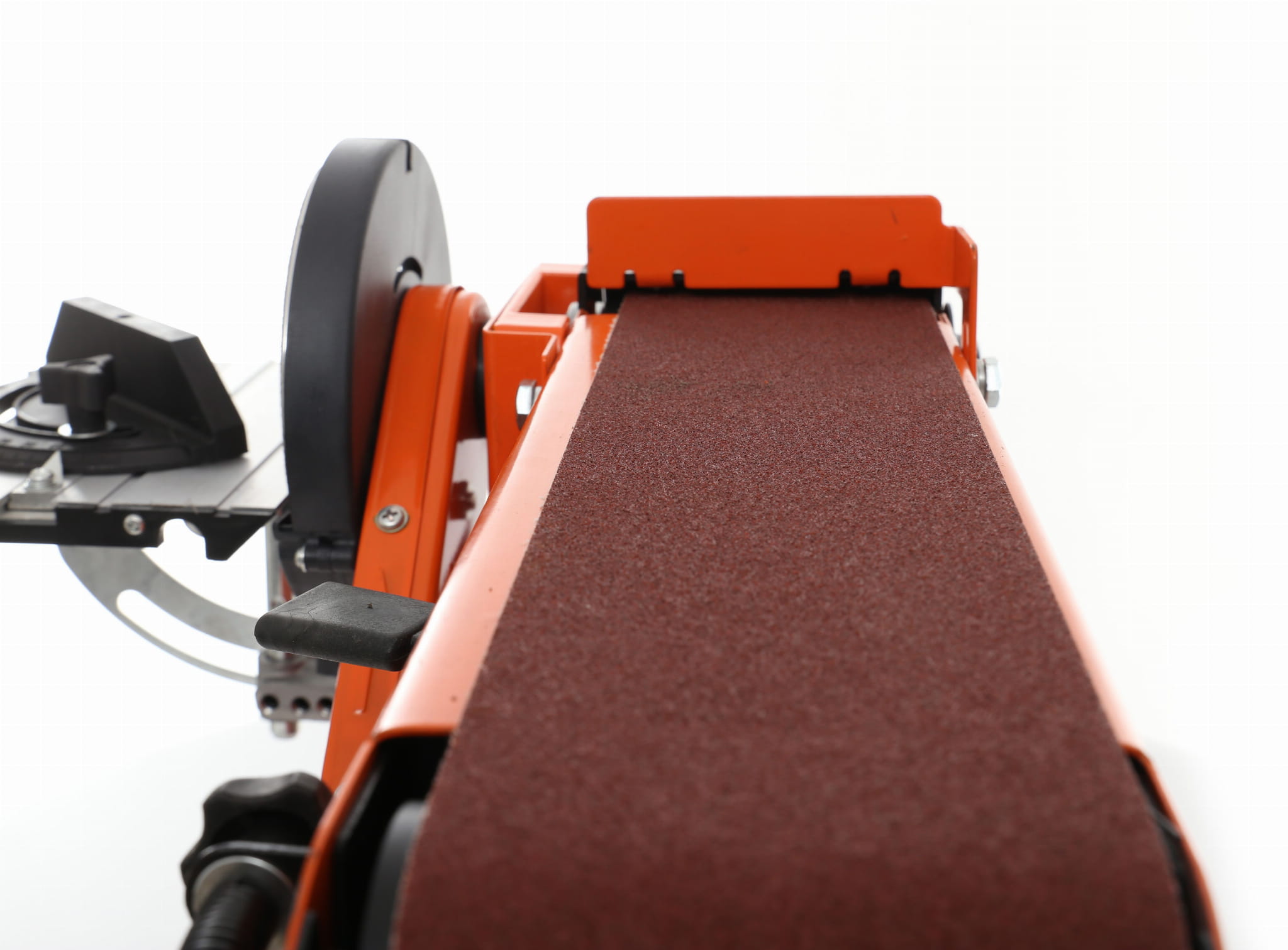 Blat modułu talerzowego pochyla się w zakresie 0°–45°, co umożliwia szlifowanie pod kątem bez konieczności ręcznego utrzymywania elementu. Stolik taśmowy przestawia się w zakresie 0°–90° — od pozycji poziomej do pionowej — co pozwala na obróbkę zarówno płaszczyzn, jak i wąskich krawędzi.