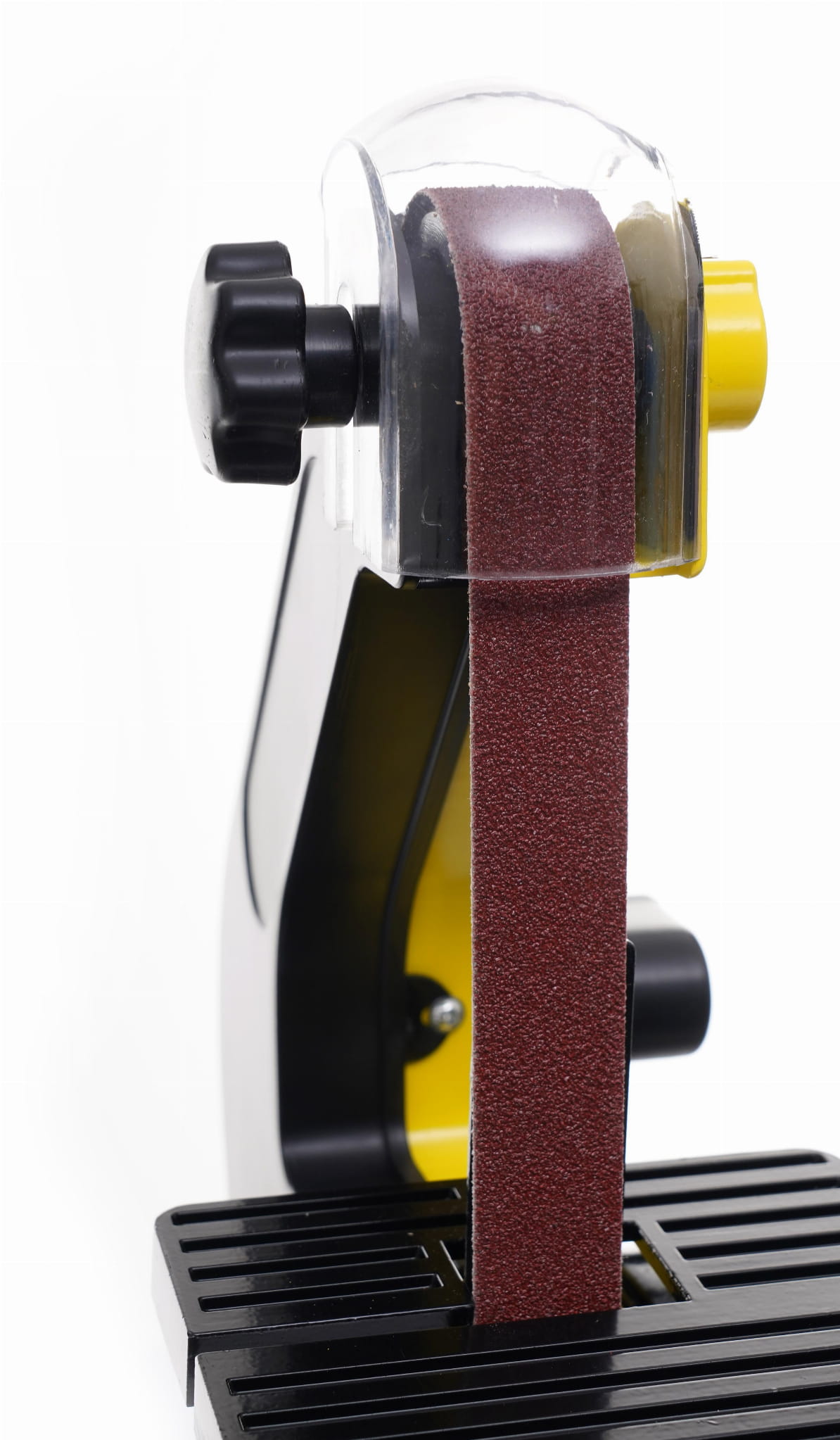 Przed pierwszym uruchomieniem należy sprawdzić napięcie pasa ściernego — zbyt luźny pas może ześlizgiwać się z rolek lub pracować nierównomiernie. Taśmy i tarcze ścierne należy wymieniać po zauważalnym spadku skuteczności szlifowania lub przy widocznym zużyciu ścierniwa. Blat żeliwny wymaga okresowego czyszczenia z pyłu i wiórów oraz zabezpieczenia cienką warstwą oleju technicznego, aby zapobiec korozji powierzchniowej. Urządzenie powinno pracować na stabilnym podłożu — waga 6,5 kg zapewnia pewne posadowienie na stole warsztatowym.