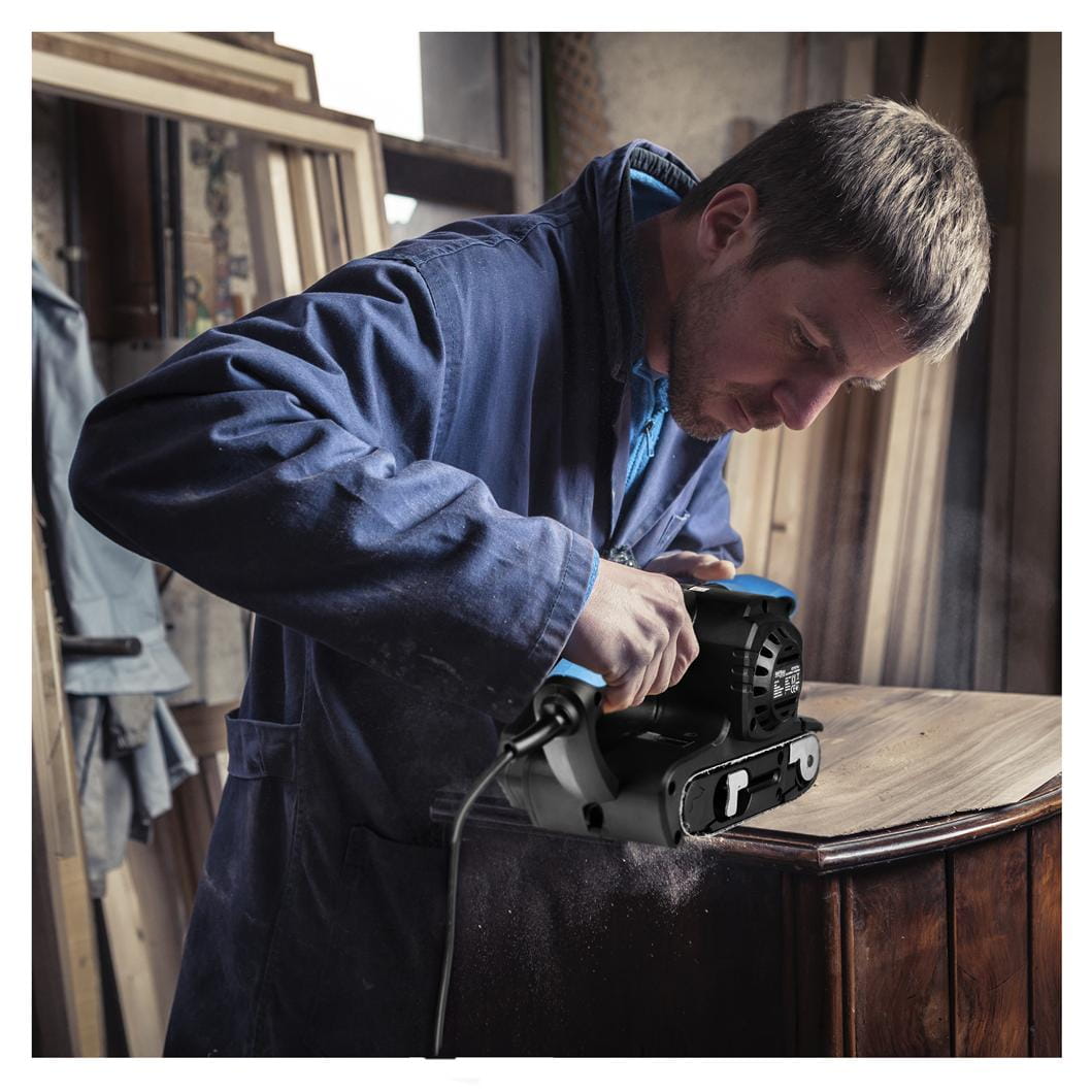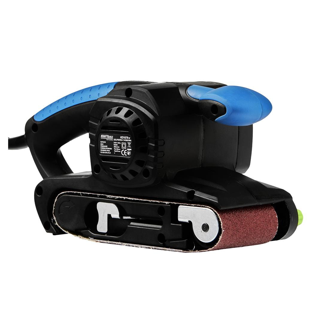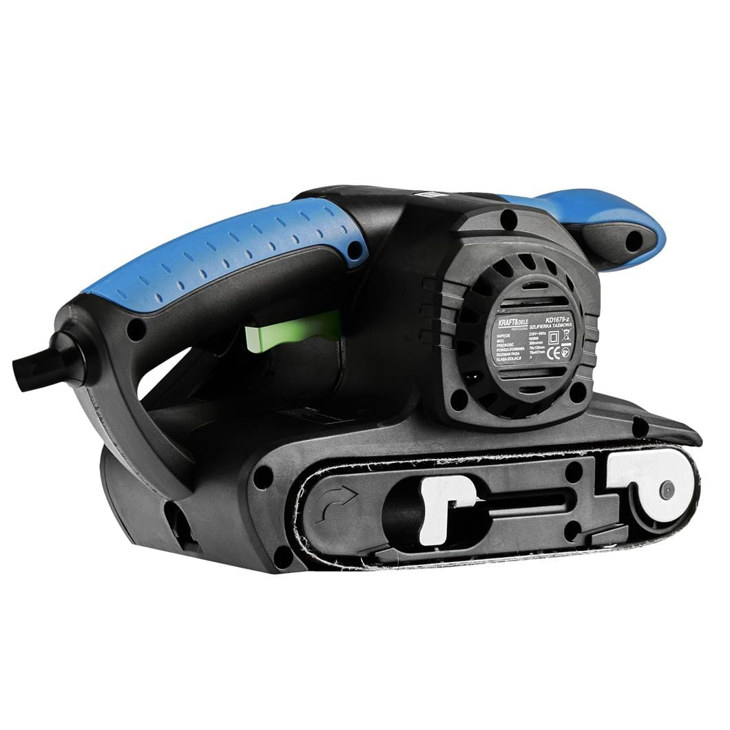 Do szlifierki pasują standardowe taśmy ścierne 76×457mm. Do szlifowania wstępnego i usuwania powłok stosuje się gradacje P40–P80, do szlifowania pośredniego P100–P150, a do wykończenia powierzchni przed malowaniem P180–P240. Zaleca się stosowanie taśm z otworami, które współpracują z systemem odprowadzania pyłu urządzenia.