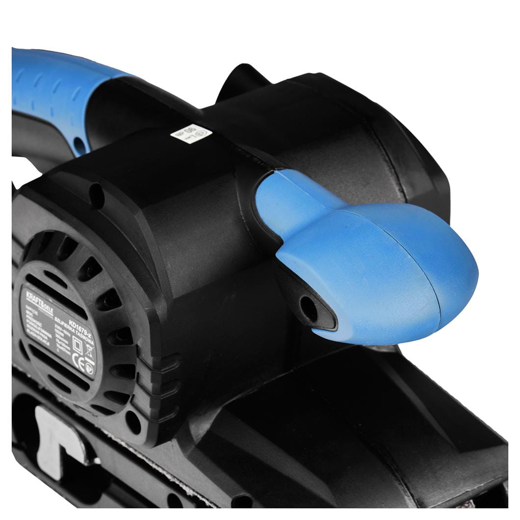 Wielofunkcyjny włącznik z zabezpieczeniem przed przypadkowym uruchomieniem wyposażono w przycisk blokady pracy ciągłej. Rozwiązanie to odciąża palce podczas długich sesji szlifowania i zostało zaprojektowane z myślą o użytkownikach leworęcznych.